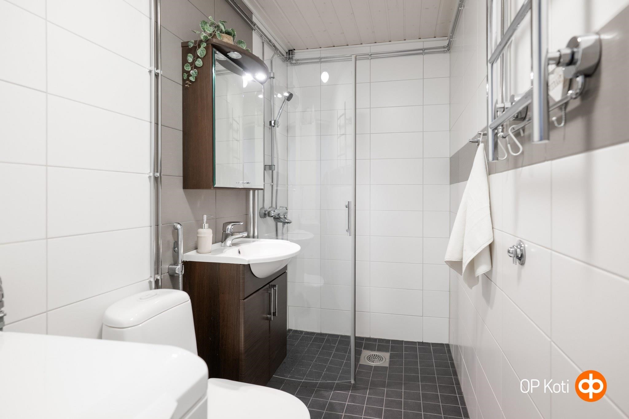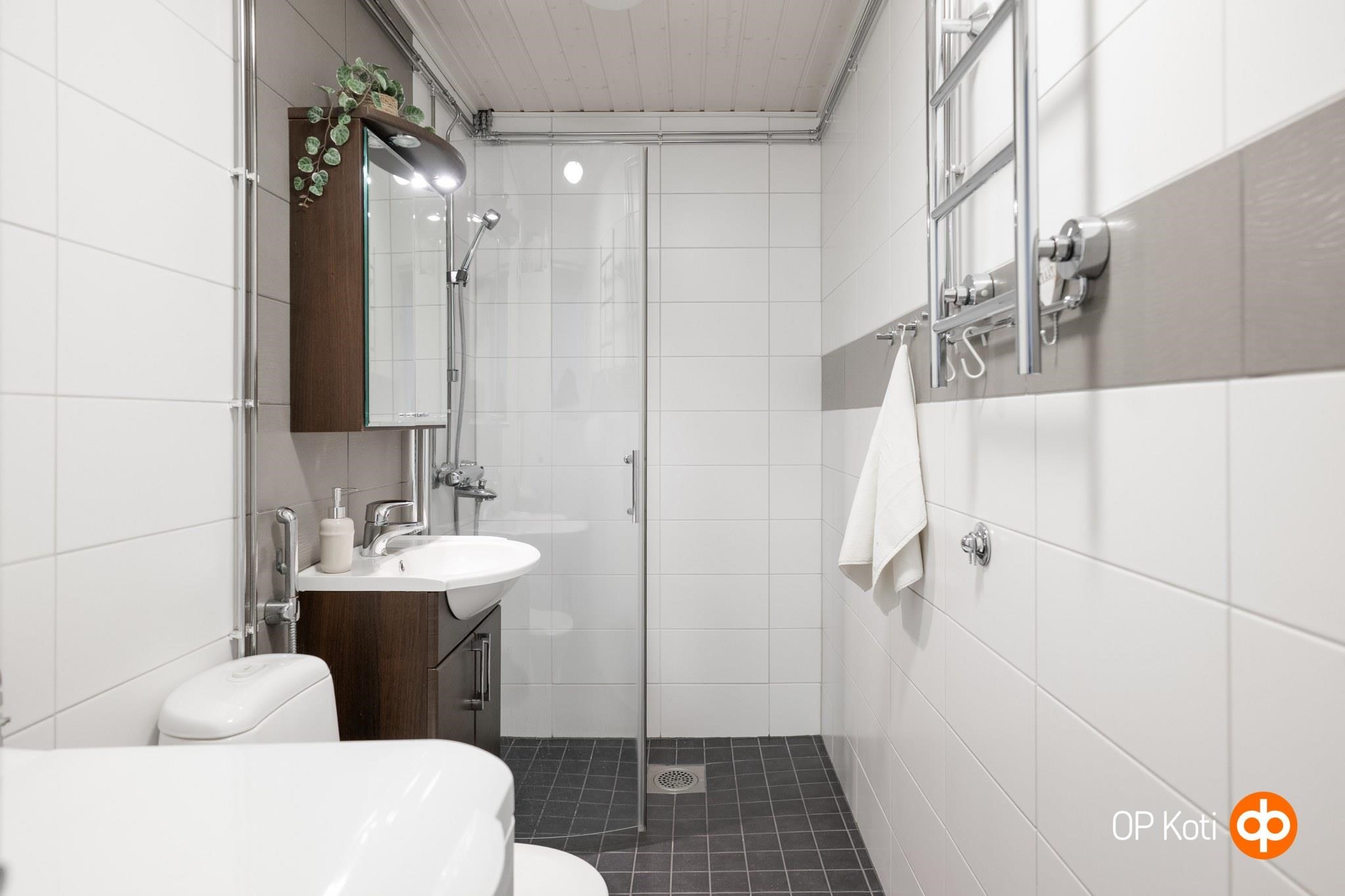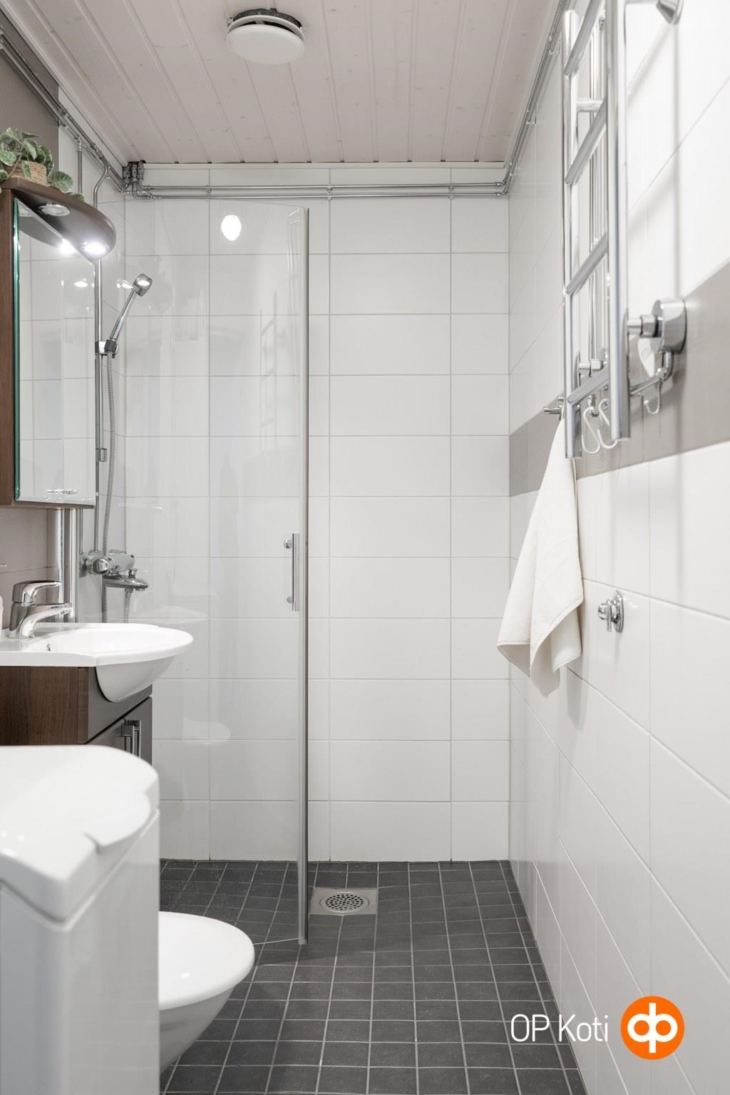 - Kylpyhuone, suihku, peilikaappi, allaskaappi, pesukoneliitäntä, lattialämmitys Lattialämmitys kosteissa tiloissa.