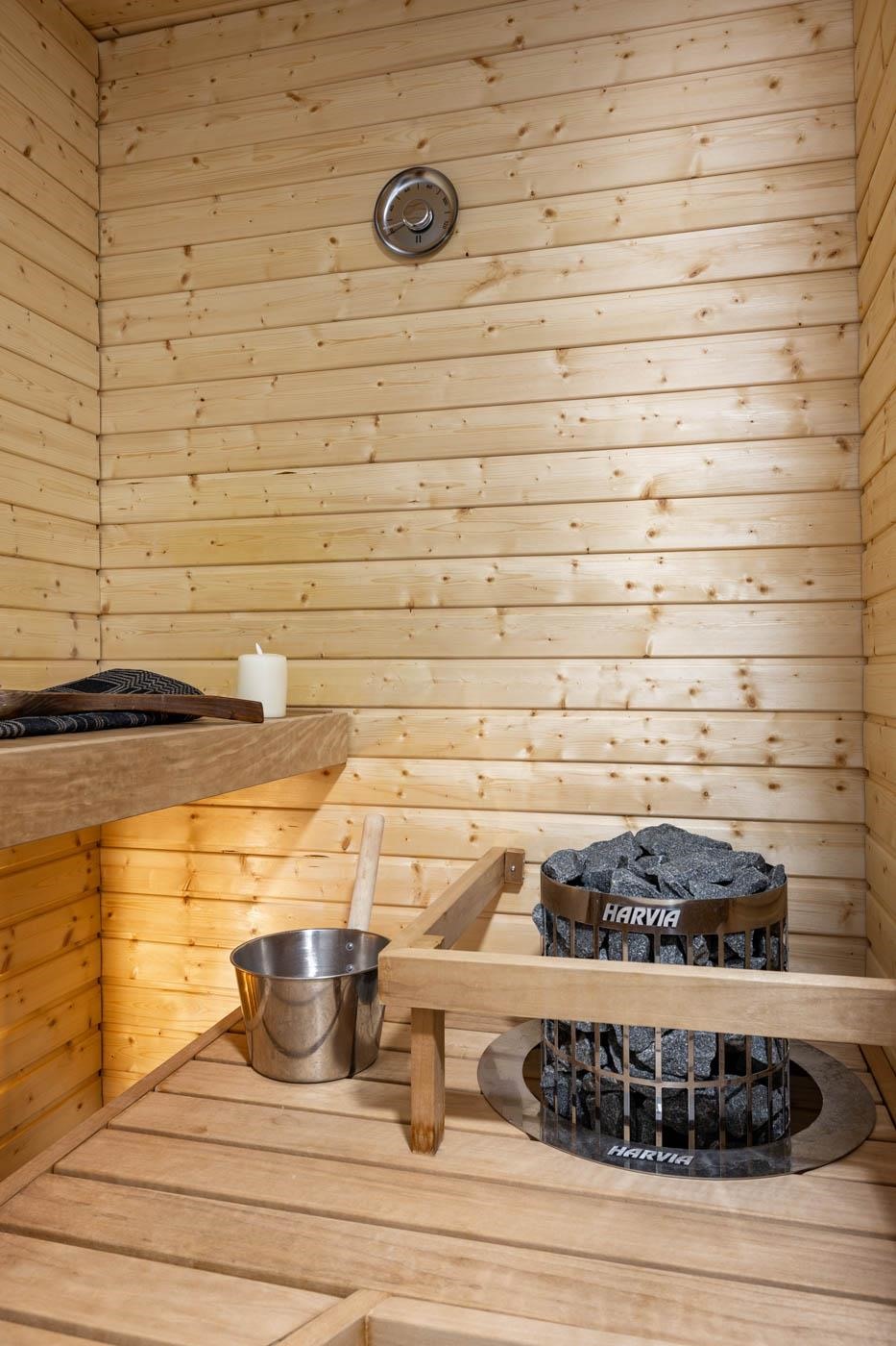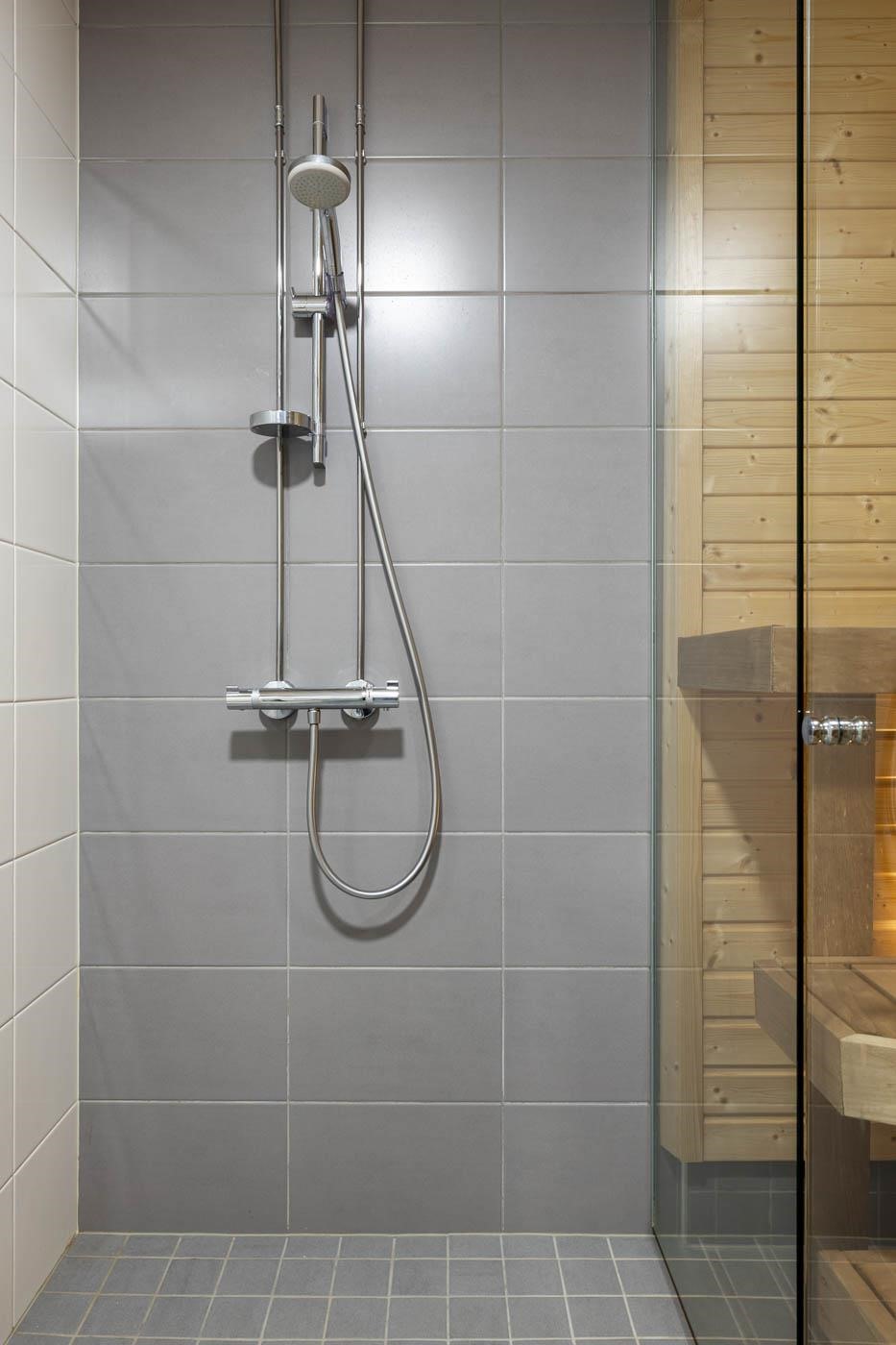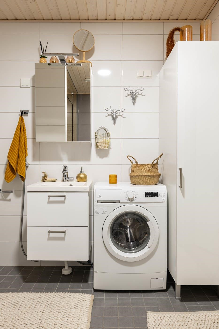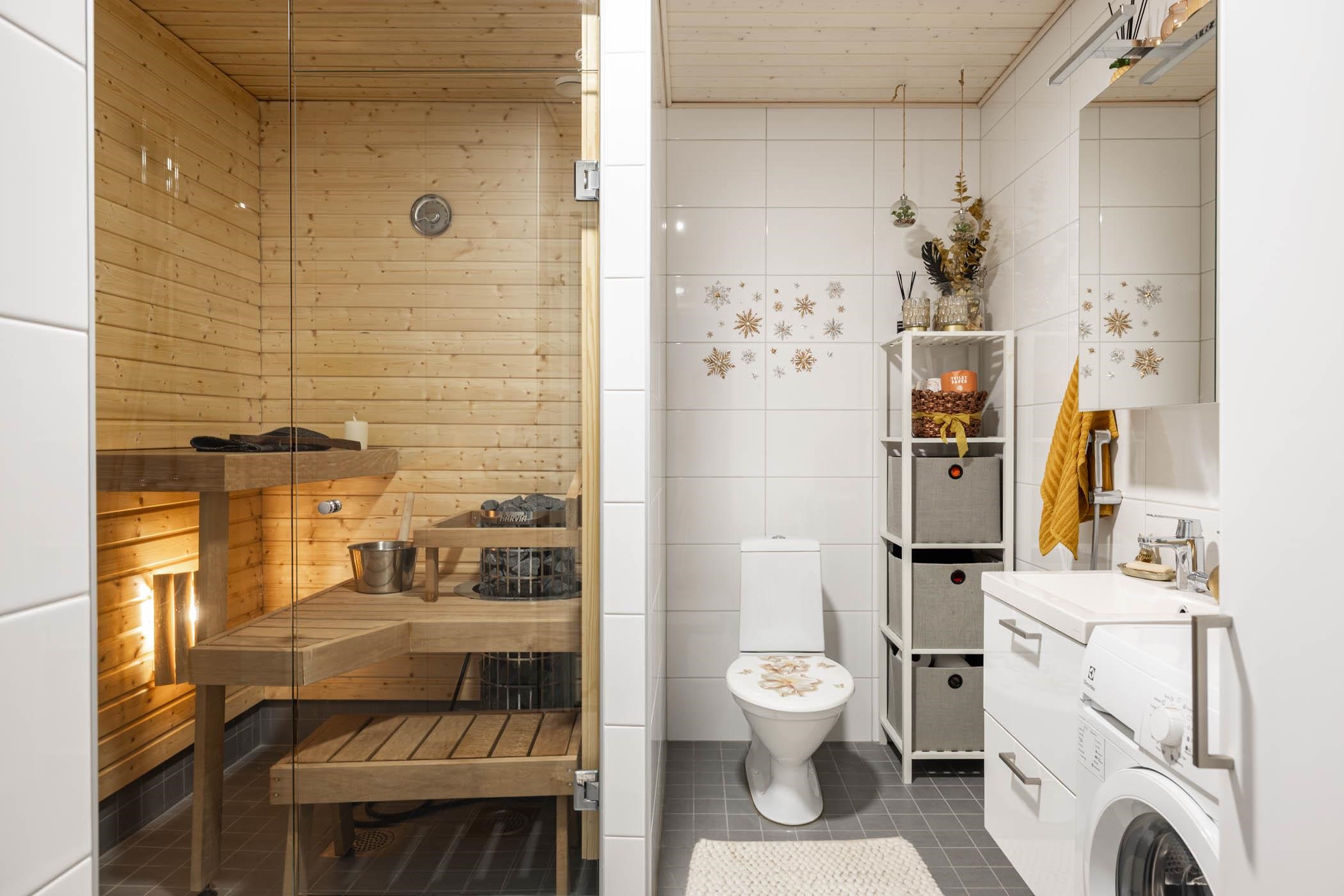 - Saunassa sähkökiuas. Kylpyhuoneessa suihku, peilikaappi, allaskaappi, pesukoneliitäntä, lattialämmitys, kiinteät valaisimet. Rakennusvaiheessa kylpyhuoneeseen lisätty vetolaatikosto altaan alle, katto maalattu kuultovalkeaksi ja lauteet vaihdettu (lämpökäsitelty haapa).