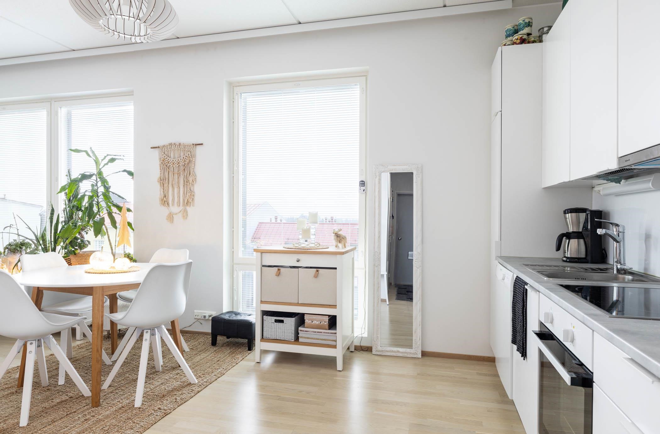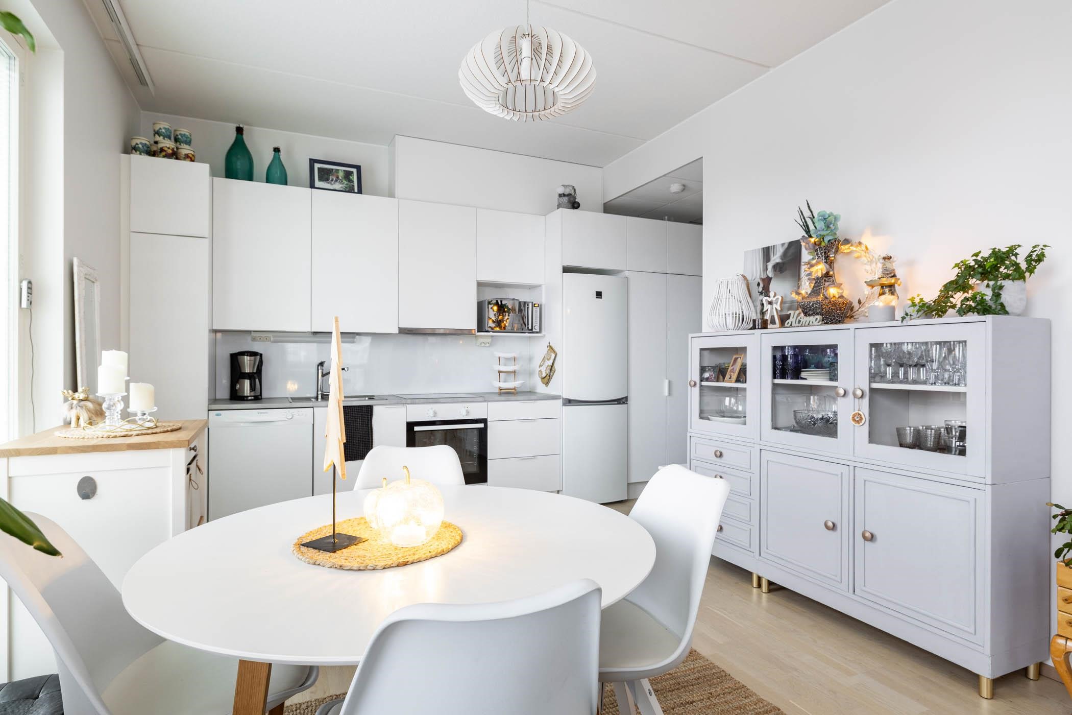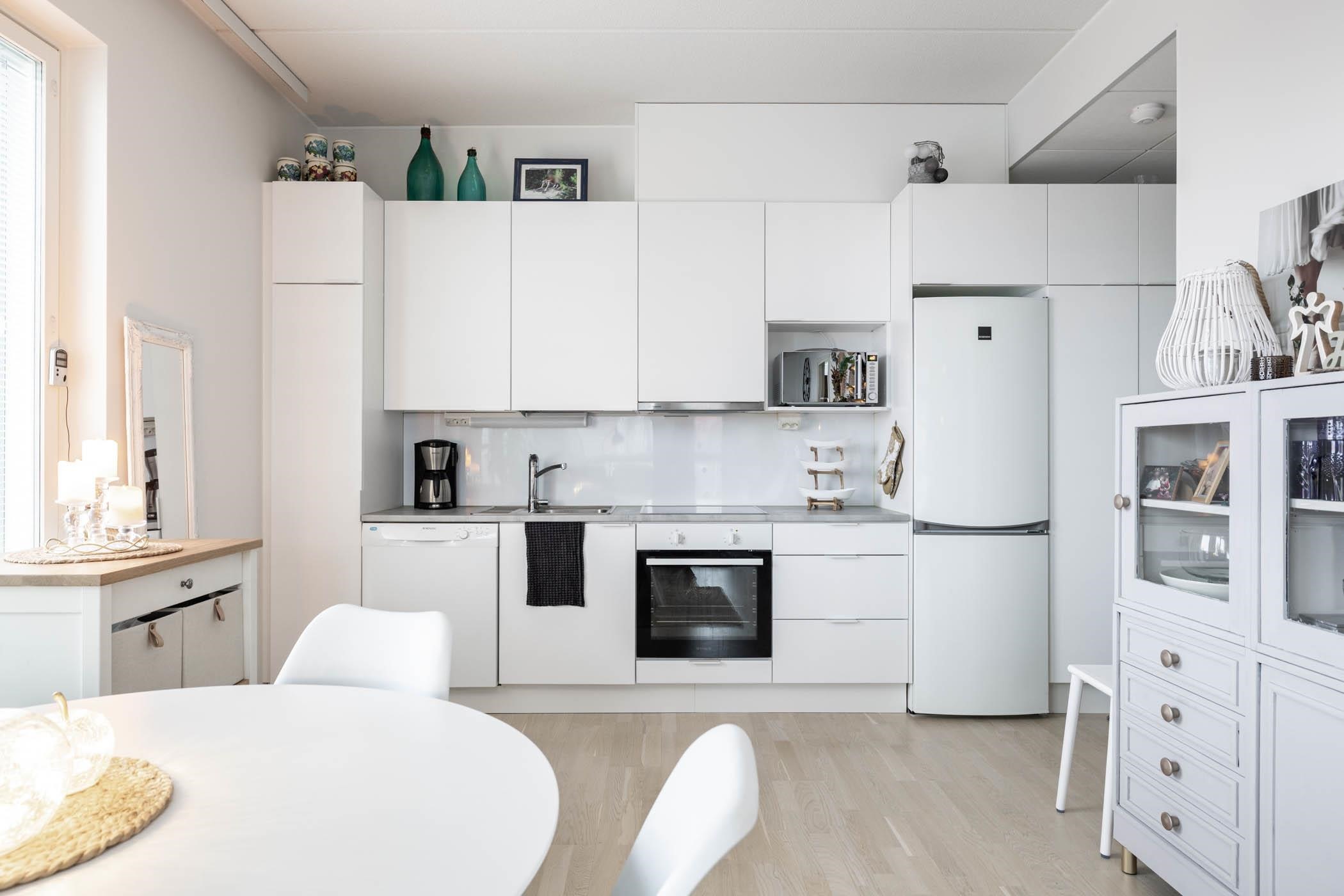 - Jääkaappipakastin, erillisuuni kiertoilma, keraaminen liesitaso, liesituuletin, astianpesukone, kaapistot, kiinteät valaisimet. Keittiöön tehty muutoksia rakennusaikana; lisätty kaappi ja hidastimet laatikoistoihin ja kaappeihin
