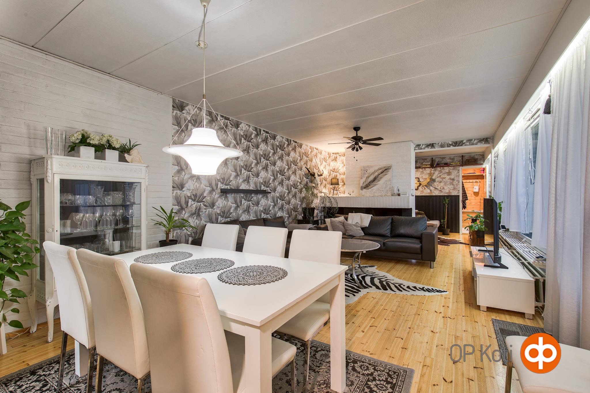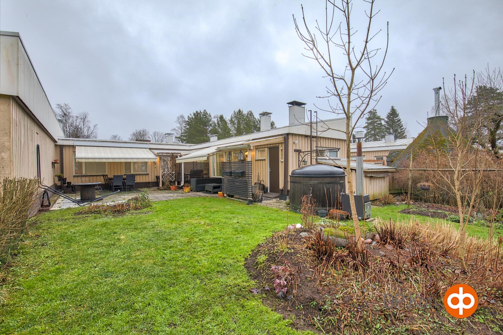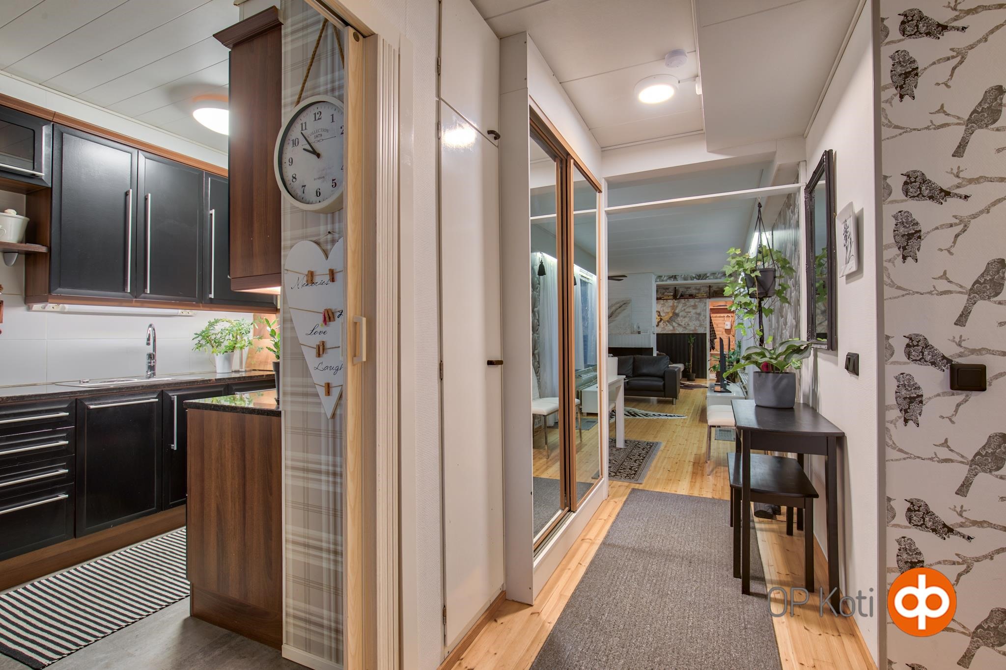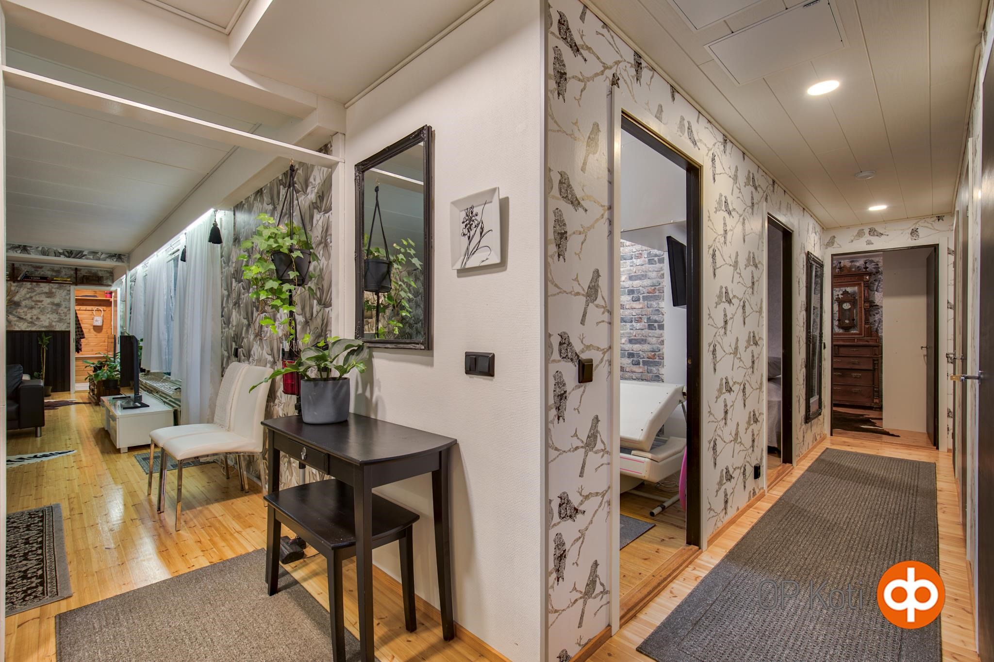 Huoneisto on remontoitu tyylikkään persoonallisesti vuosien saatossa ja siitä on todella pidetty huolta. Varsinaisia makuuhuoneita löytyy kolme ja olohuoneen yhteydestä löytyy yksi huone joka on muunneltavissa oman tarpeen mukaan. Keittiö on remontoitu tyylikkäästi kivitasoilla varustaen. Yksi valtti asunnossa on säilytystilat - tilava vaatehuone sekä kylmiö lisäävät arjen helppoutta. Asunnon perältä löytyy pesuhuone ja sauna, josta löytyy todellinen helmi nimittäin puukiuas. Löylyjen jälkeen pääsee kätevästi pukuhuoneen kautta suoraan takapihalle nauttimaan paljun lämmöstä. Takapiha on todella tilava ja sieltä löytyy paljun lisäksi kasvihuone ja kaksi markiisia kesähelteitä suojaamaan, jos puutarhanhoito kiinnostaa enemmänkin löytyy siihenkin tilaa!