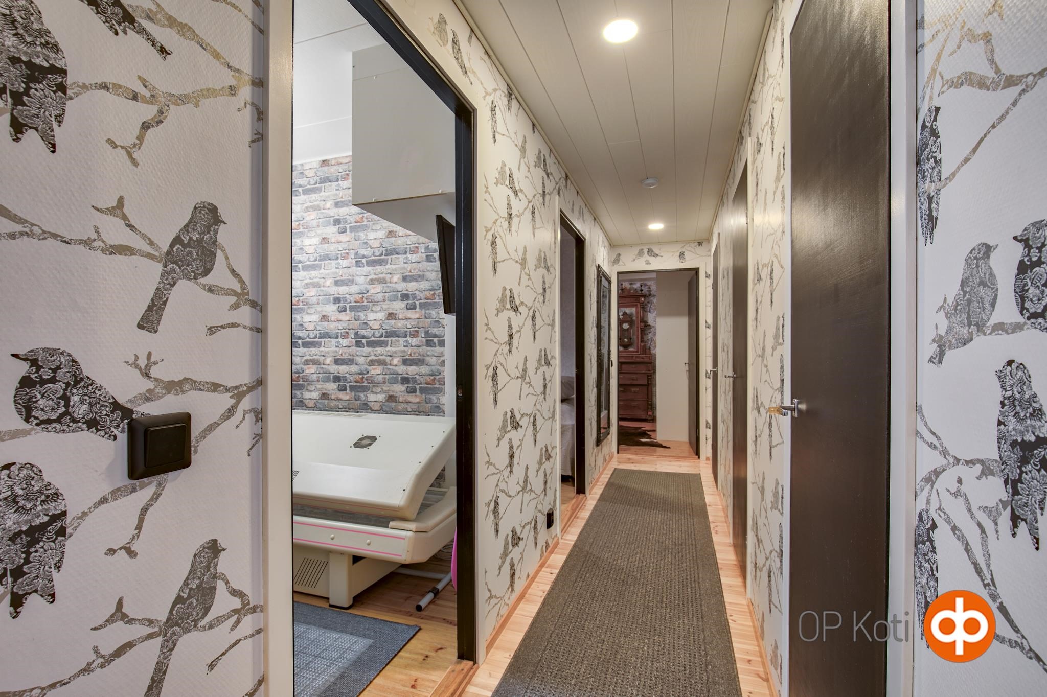 Keittiö: tapetti/välitilalaatta, laminaatti. Olohuone: tapetti, parketti. Makuuhuone 1: tapetti, parketti. Makuuhuone 2: tapetti, vinyyli. Makuuhuone 3: tapetti, parketti. Kodinhoitohuone: maalattu, muovimatto. Sauna: paneeli, laatta. Kylpyhuone: laatta, laatta. Wc: laatta, laatta. erill. huone/Takkahuone: tapetti, parketti.
