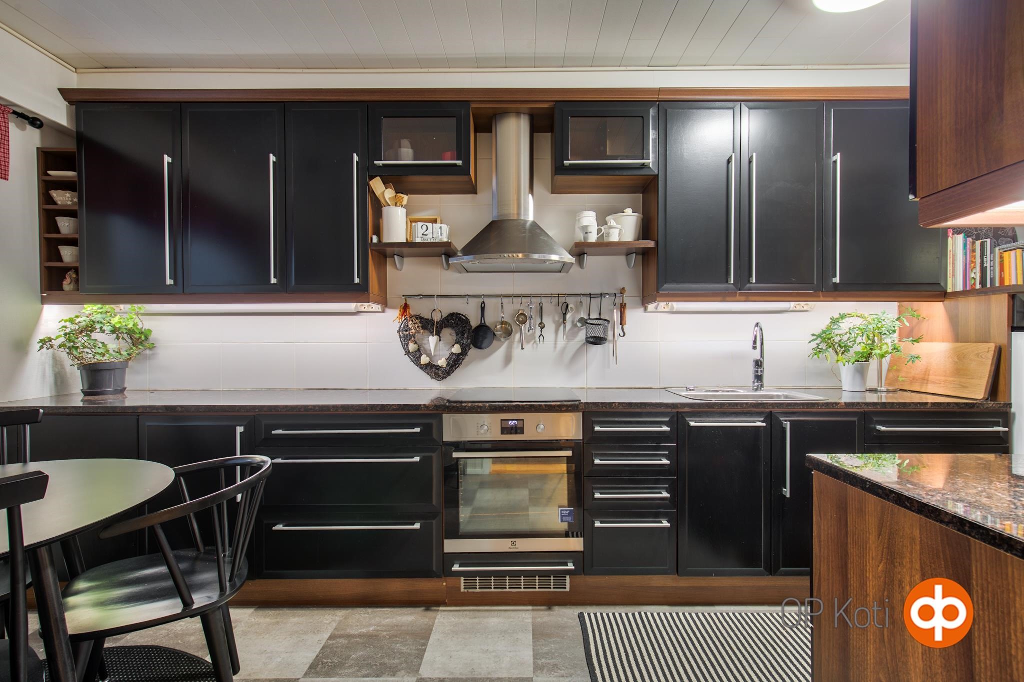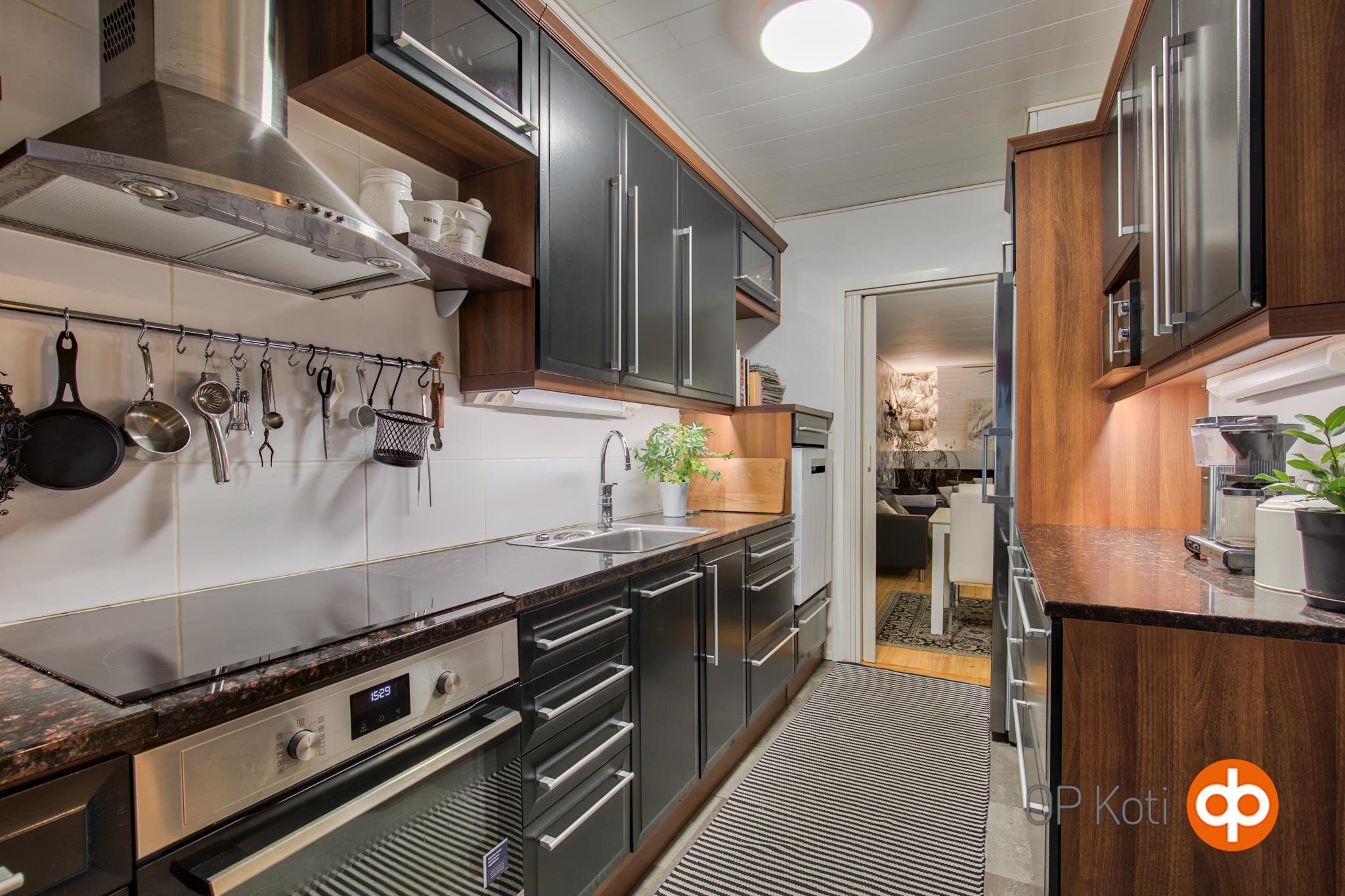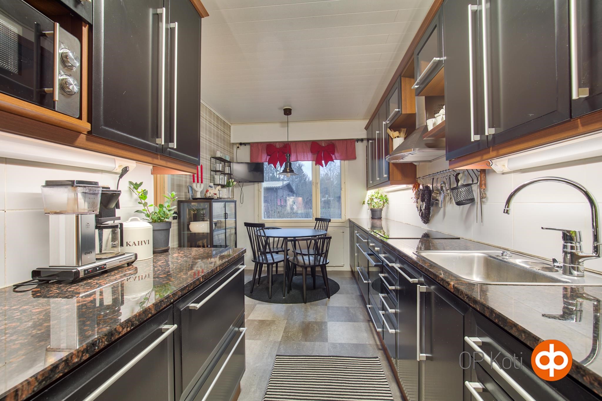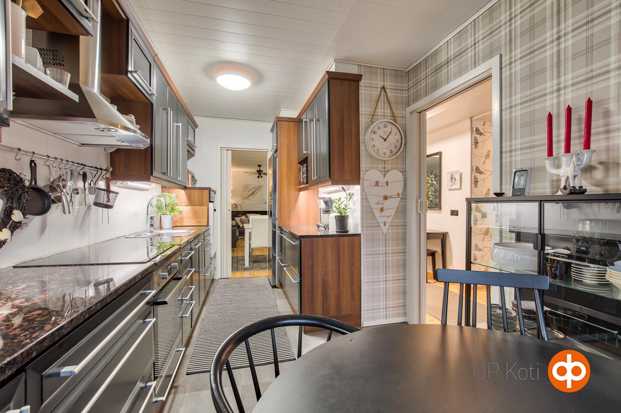 - Jääkaappi, pakastekaappi varastossa, kylmiö laitteistoa ei ole käytetty, toimivuudesta ei varmuutta, erillisuuni kiertoilmauuni, induktioliesi, liesituuletin hormiin, astianpesukone, kaapistot Puustelli, kiinteät valaisimet, Kivitaso. Keittiö uusittu 2000-luvun alussa, kodinkoneet päivitetty.