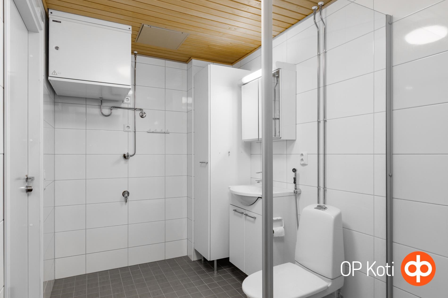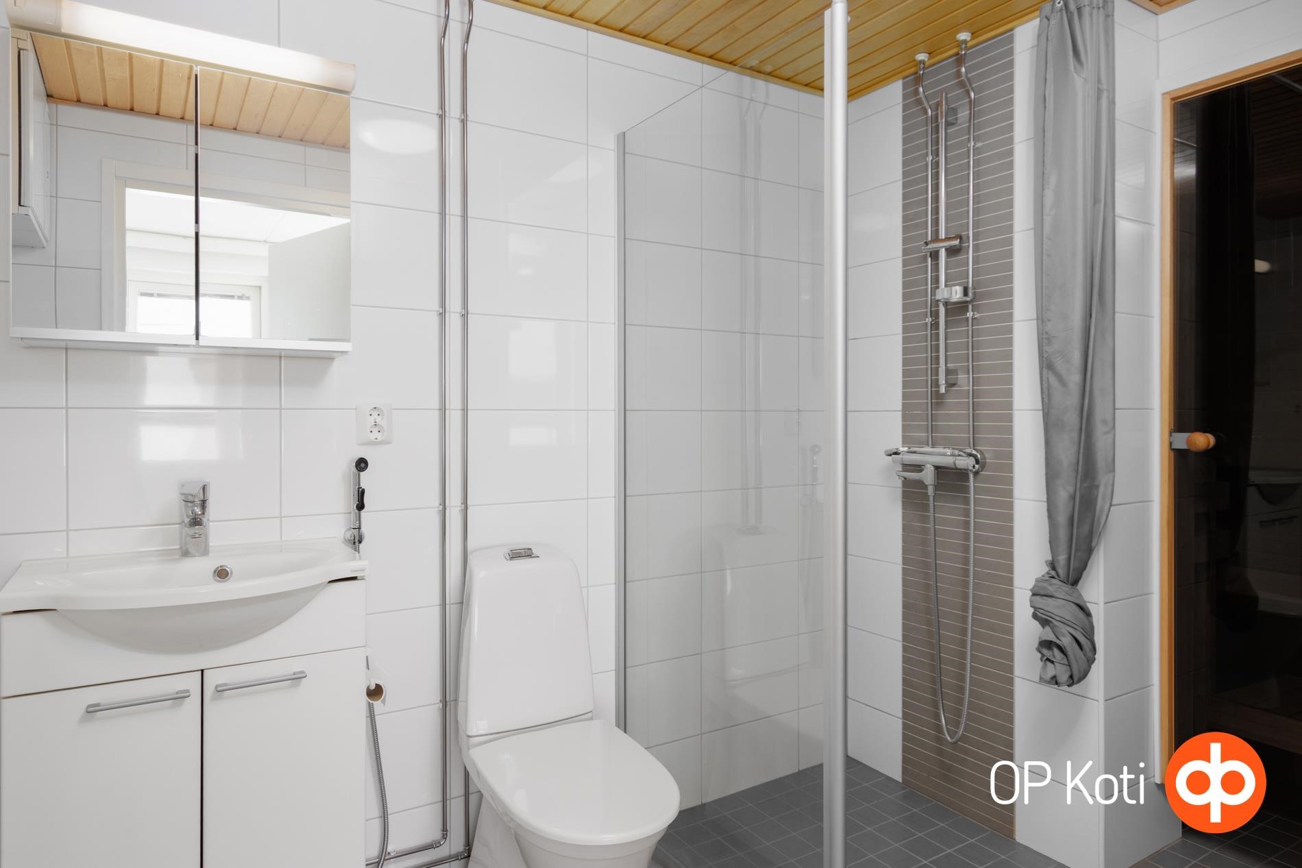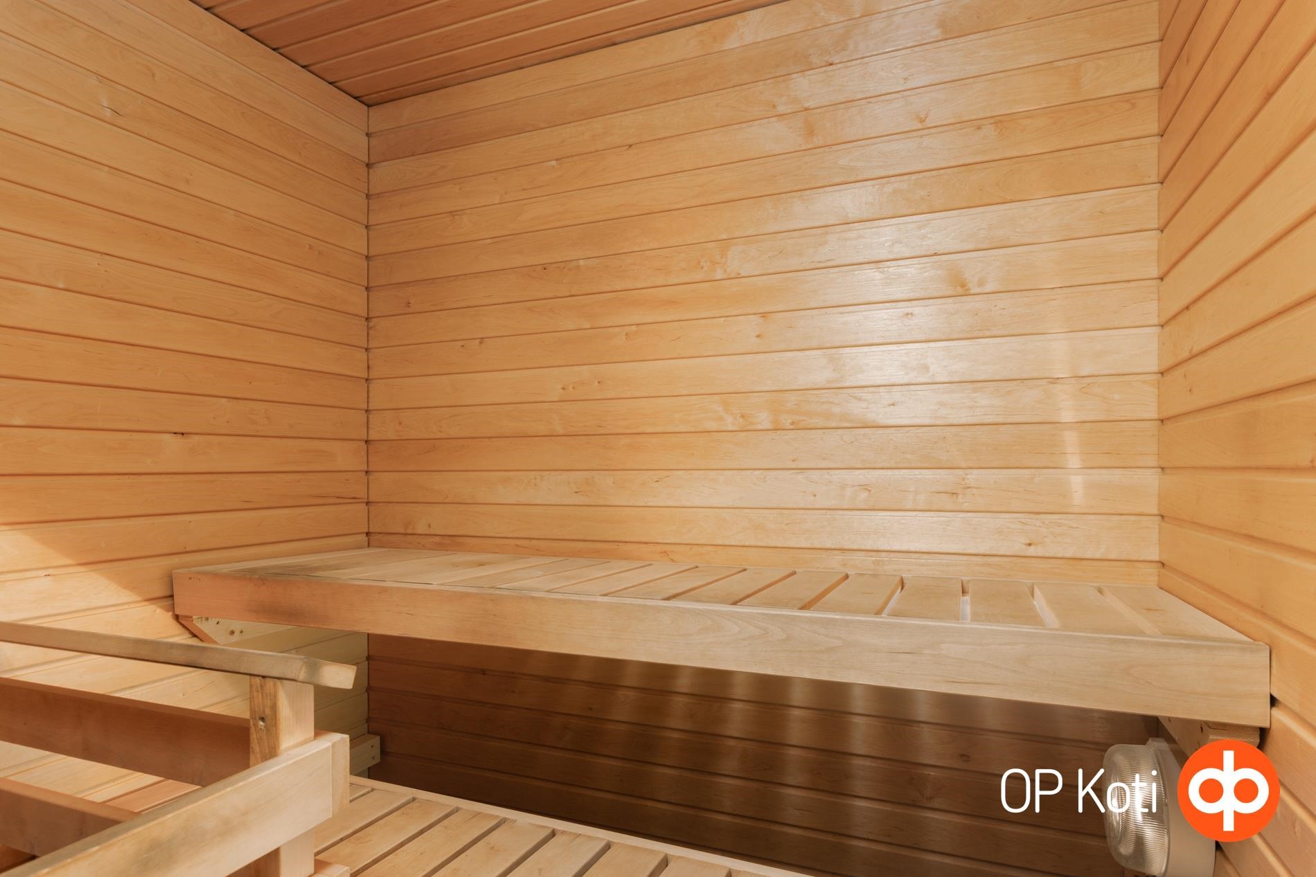 - Sauna, sähkökiuas, kylpyhuone, suihku, suihkuseinä, peilikaappi, kaapit, pesukoneliitäntä, lattialämmitys, kiinteät valaisimet.