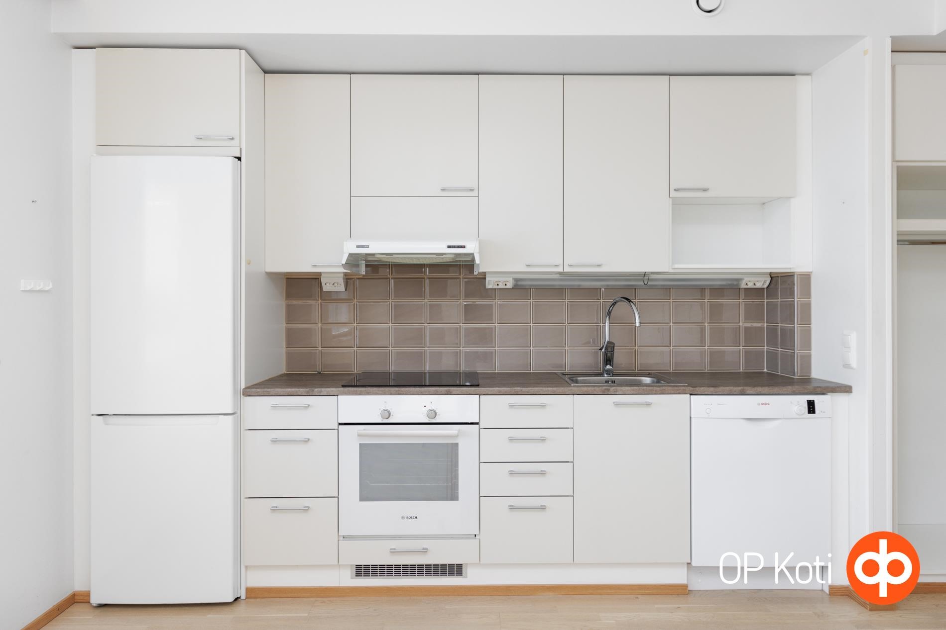 - Jääkaappipakastin, erillisuuni, keraaminen liesi (liesitaso), liesikupu, astianpesukone, kiinteät valaisimet.