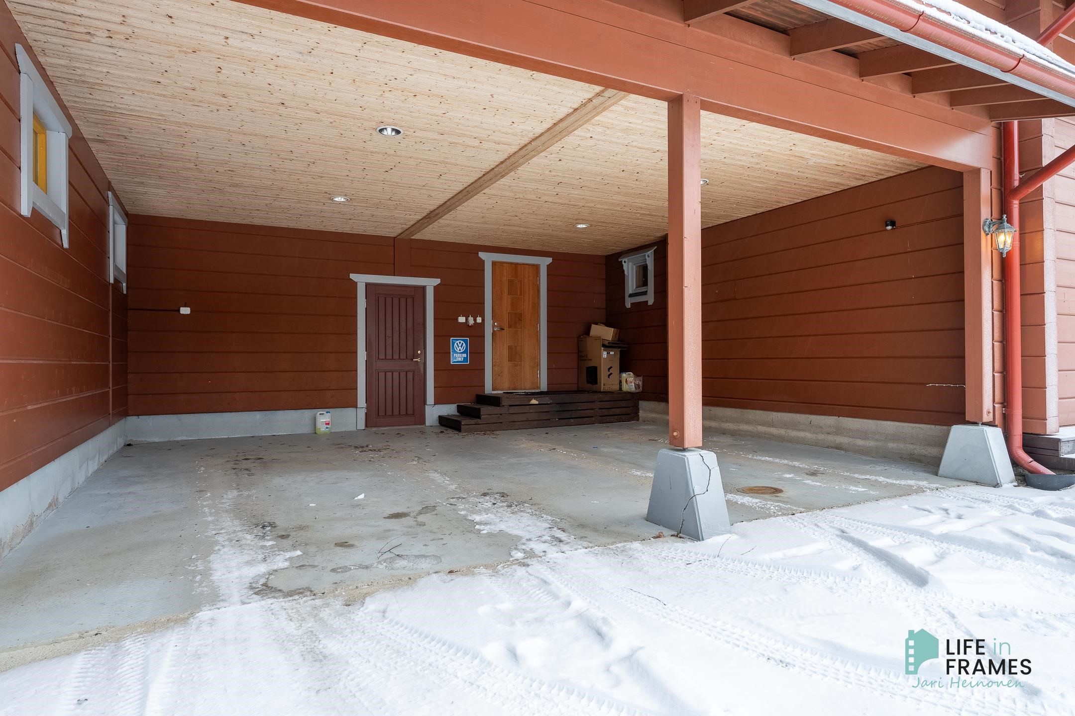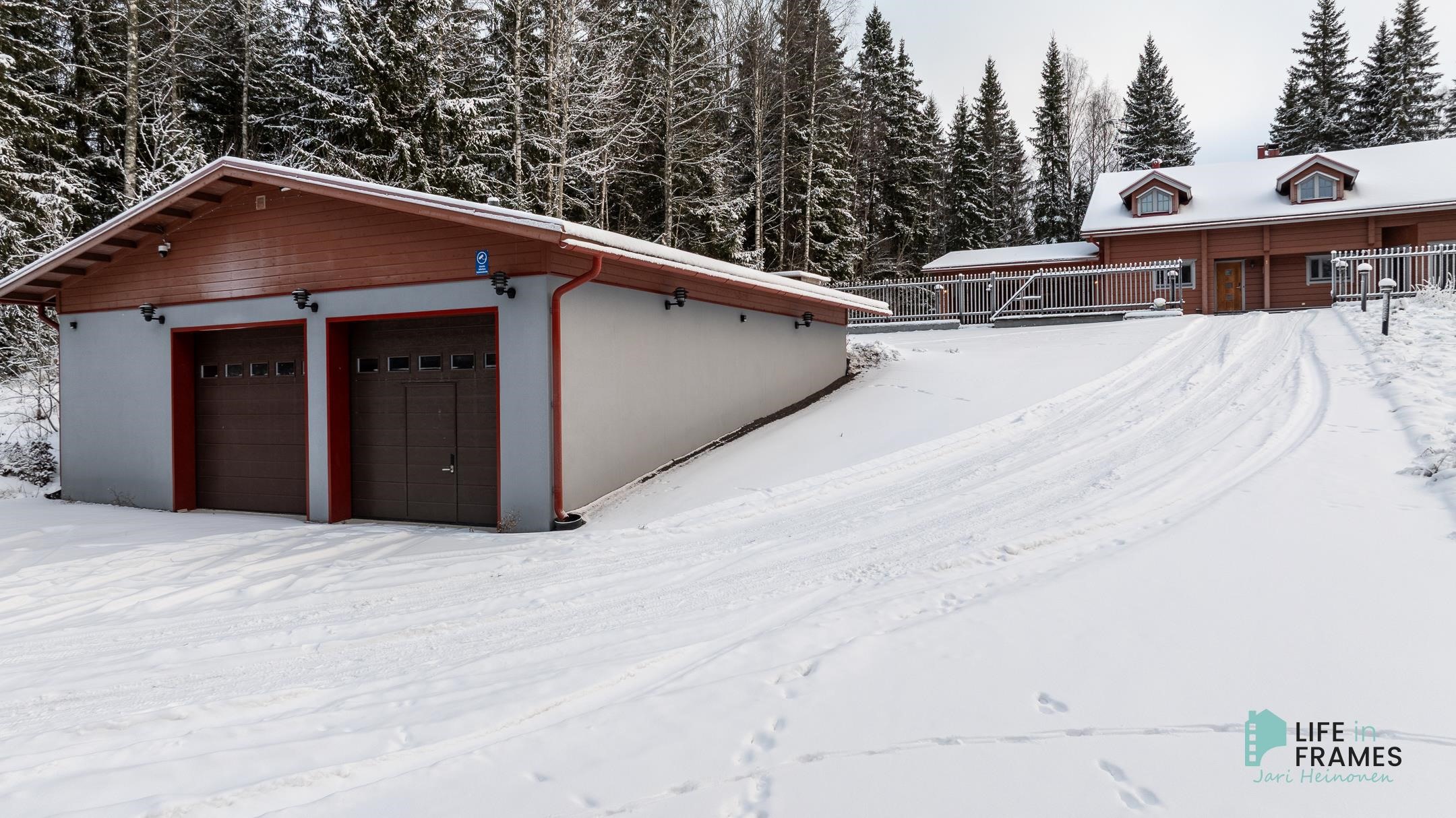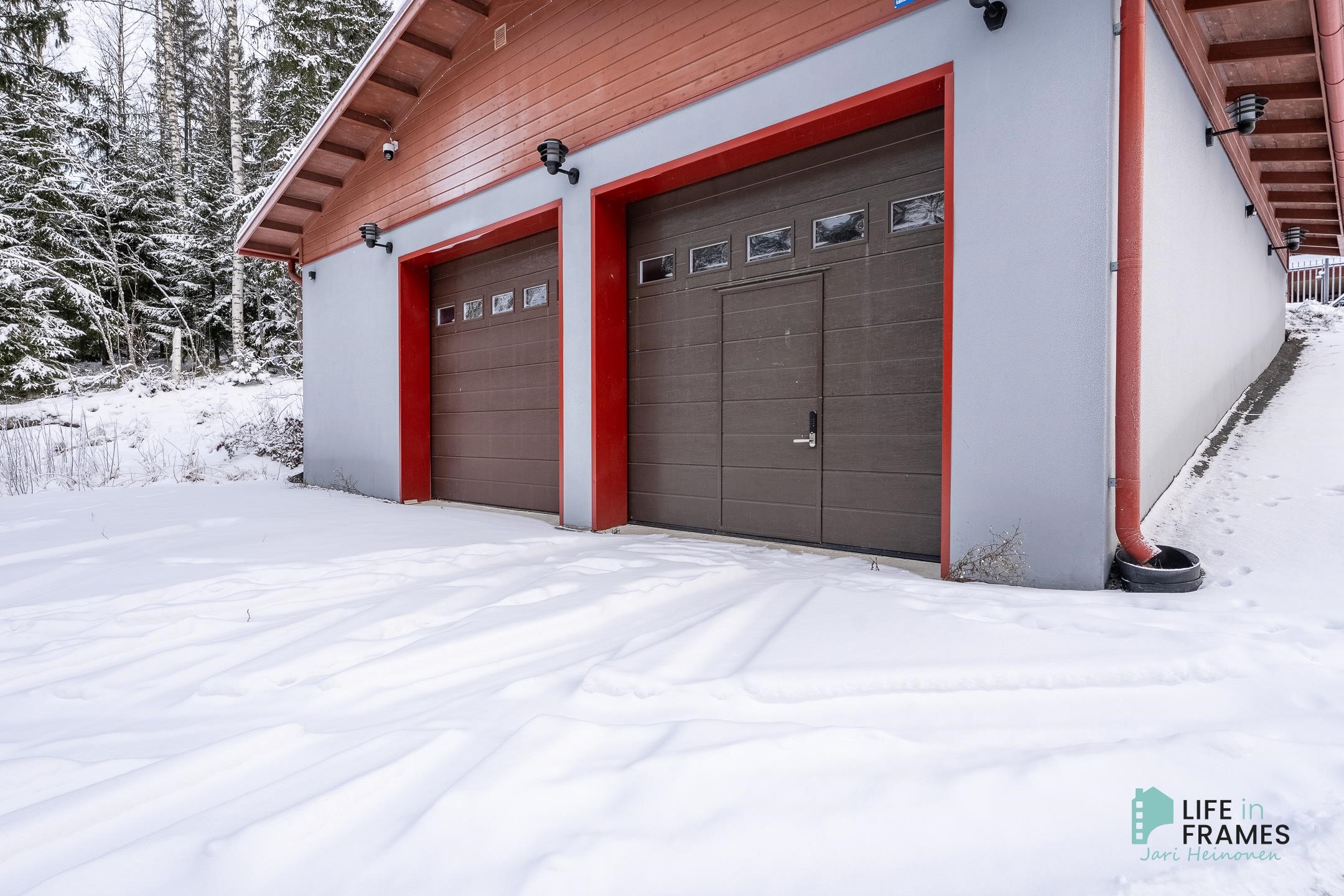 Erillinen lämmin autotalli alapihalla johon mahtuu kaksikin autoa. Asfaltoitu piha helpottaa kunnossapitoa.