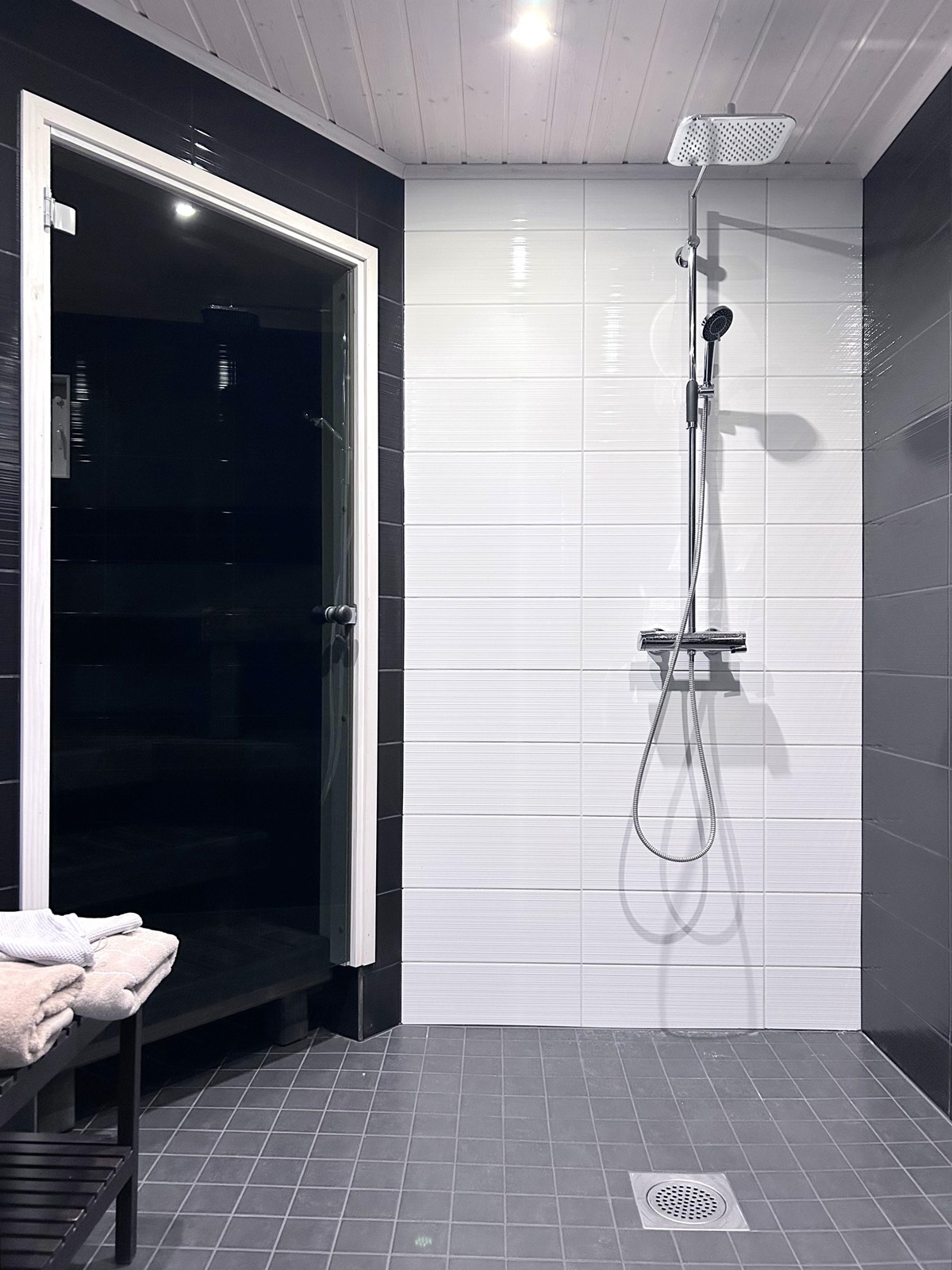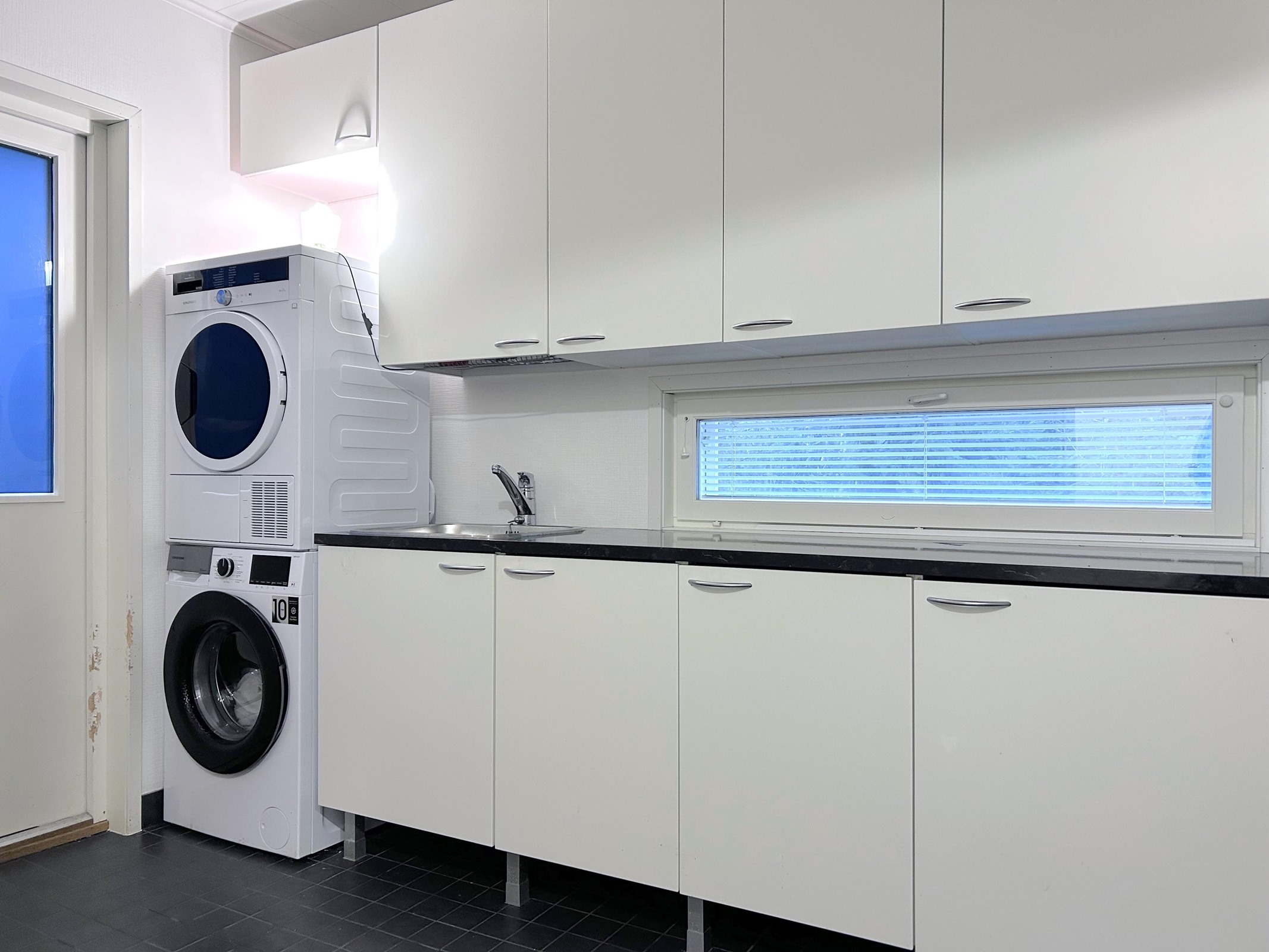 Kodinhoitohuone uloskäynnillä tukee arjen askareita, ja kaksi erillistä wc:tä sekä tilava kylpyhuone ja saunaosasto varmistavat, että kiireisimpinäkin aamuina kaikki sujuu mutkattomasti.
