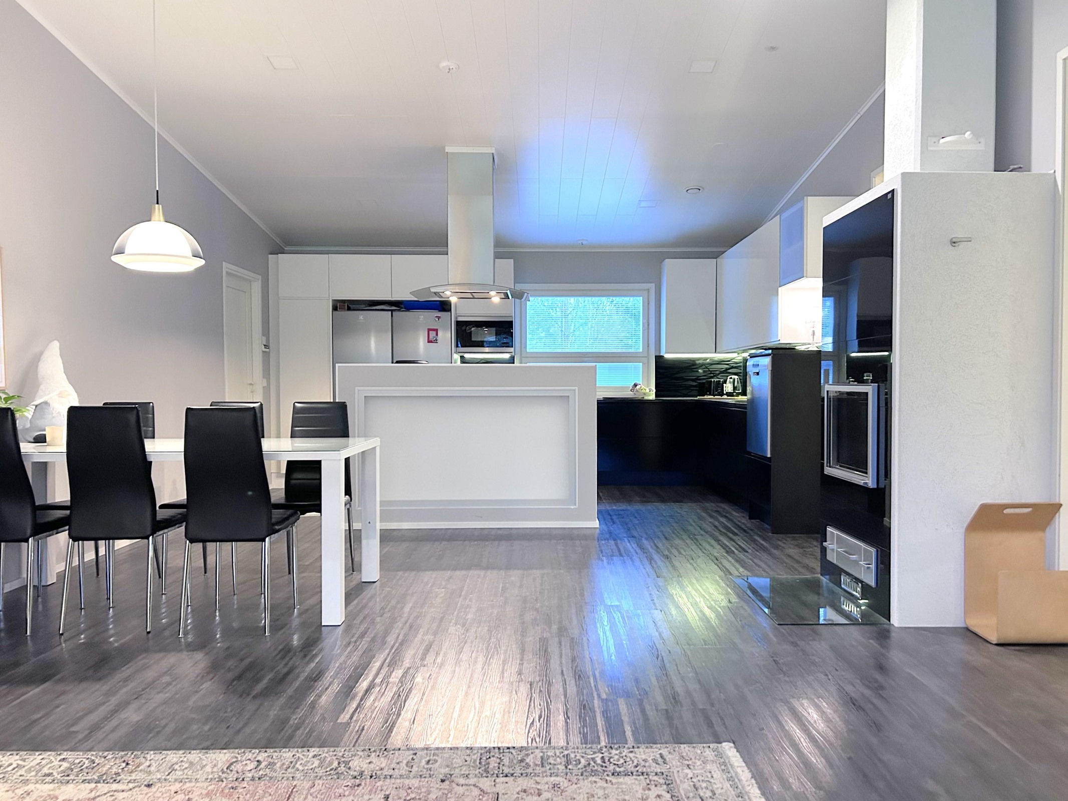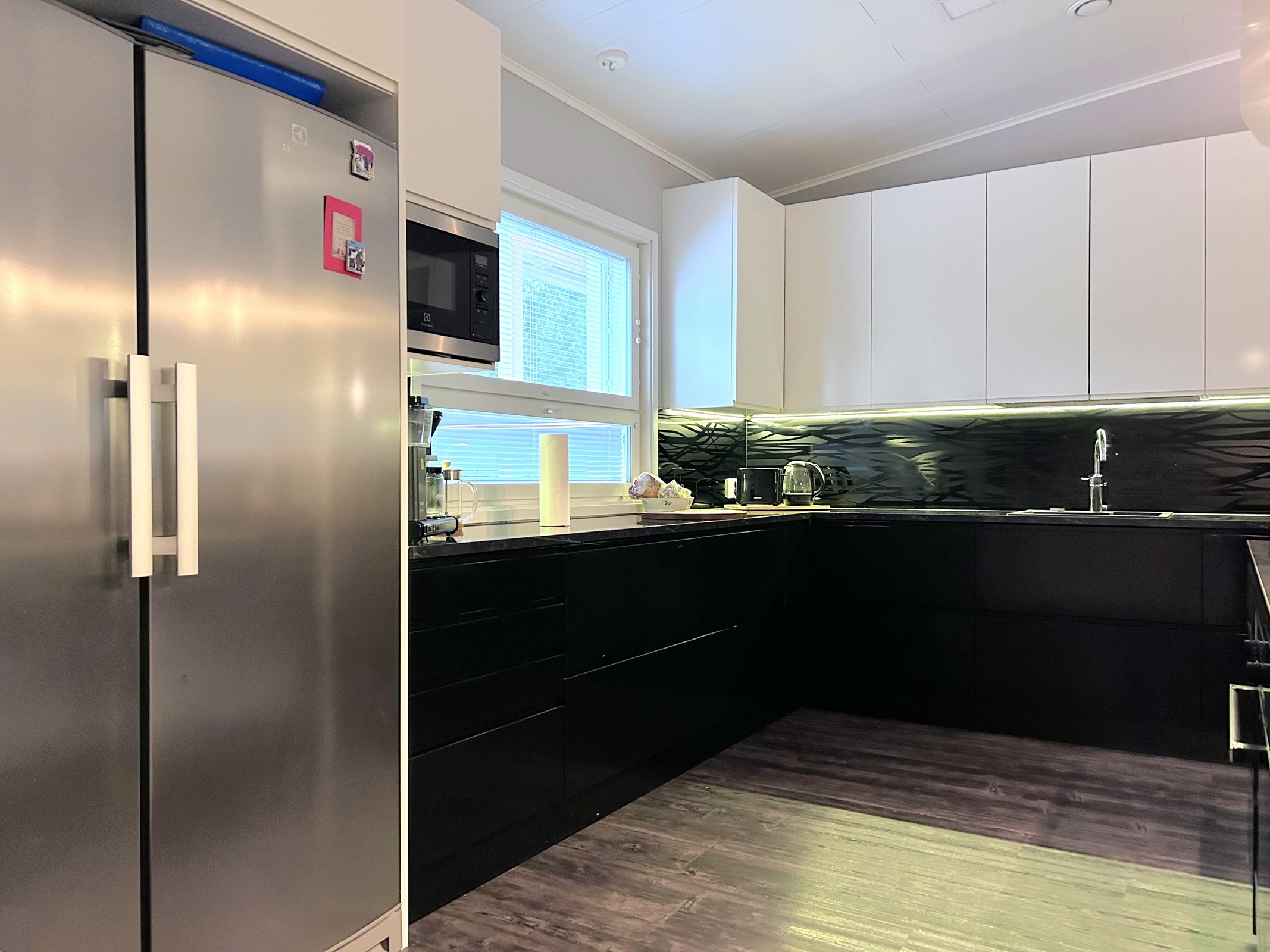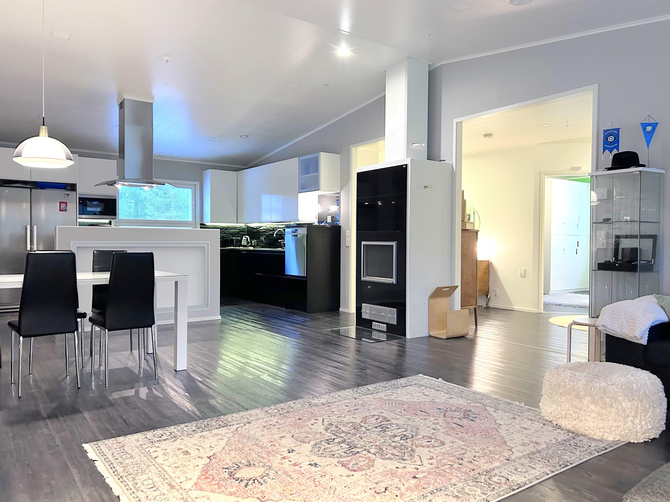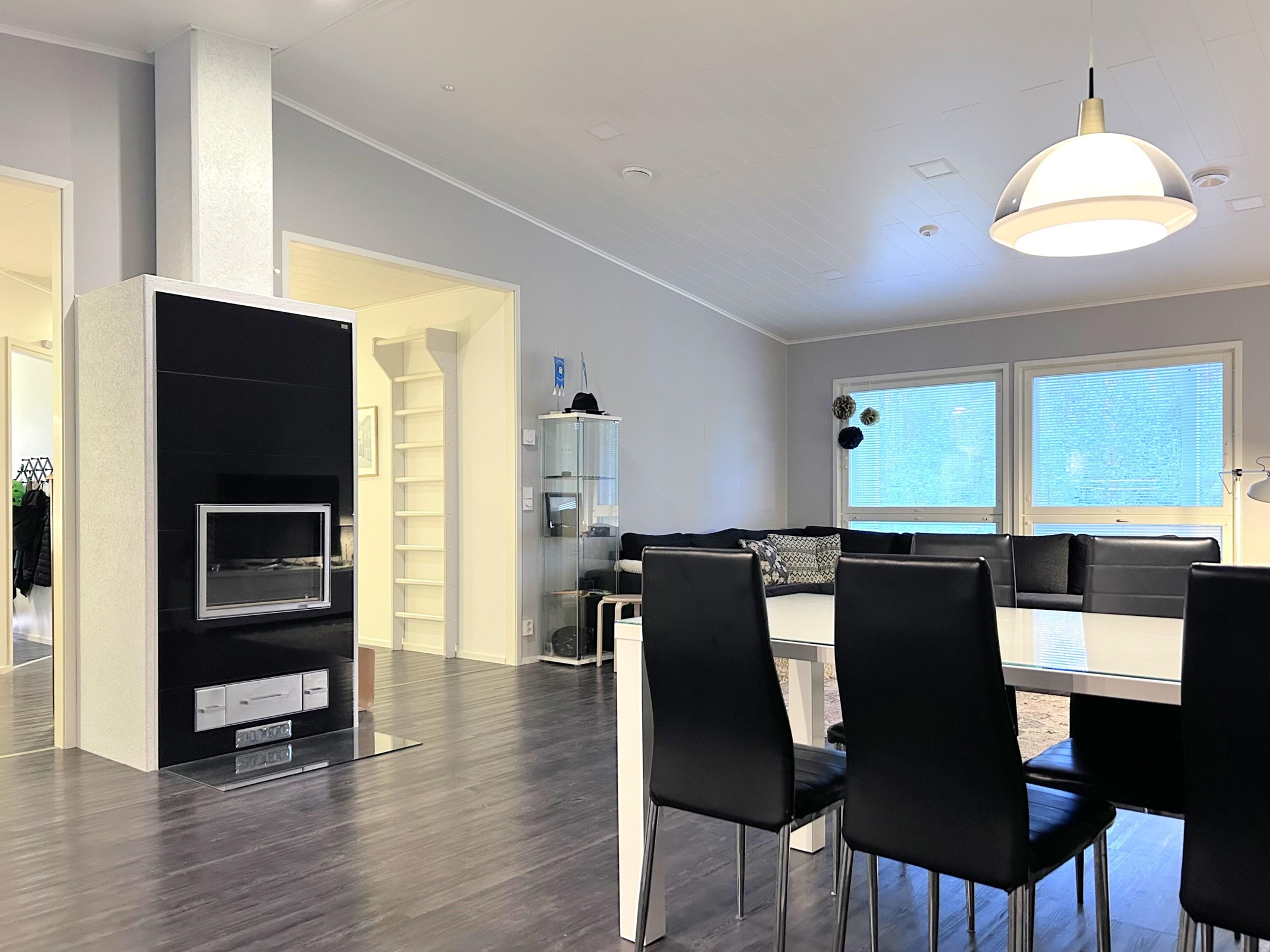 Kodissa on suuri ja valoisa olokeittiö, ja tila toimiikin kodin sydämenä. Tunnelmallinen takka luo lämpöä ja kutsuu kokoontumaan yhteisiin hetkiin. Viiden makuuhuoneensa ansiosta koti majoittaa isonkin perheen tai tarjoaa toimivat tilat etätyöskentelyyn.