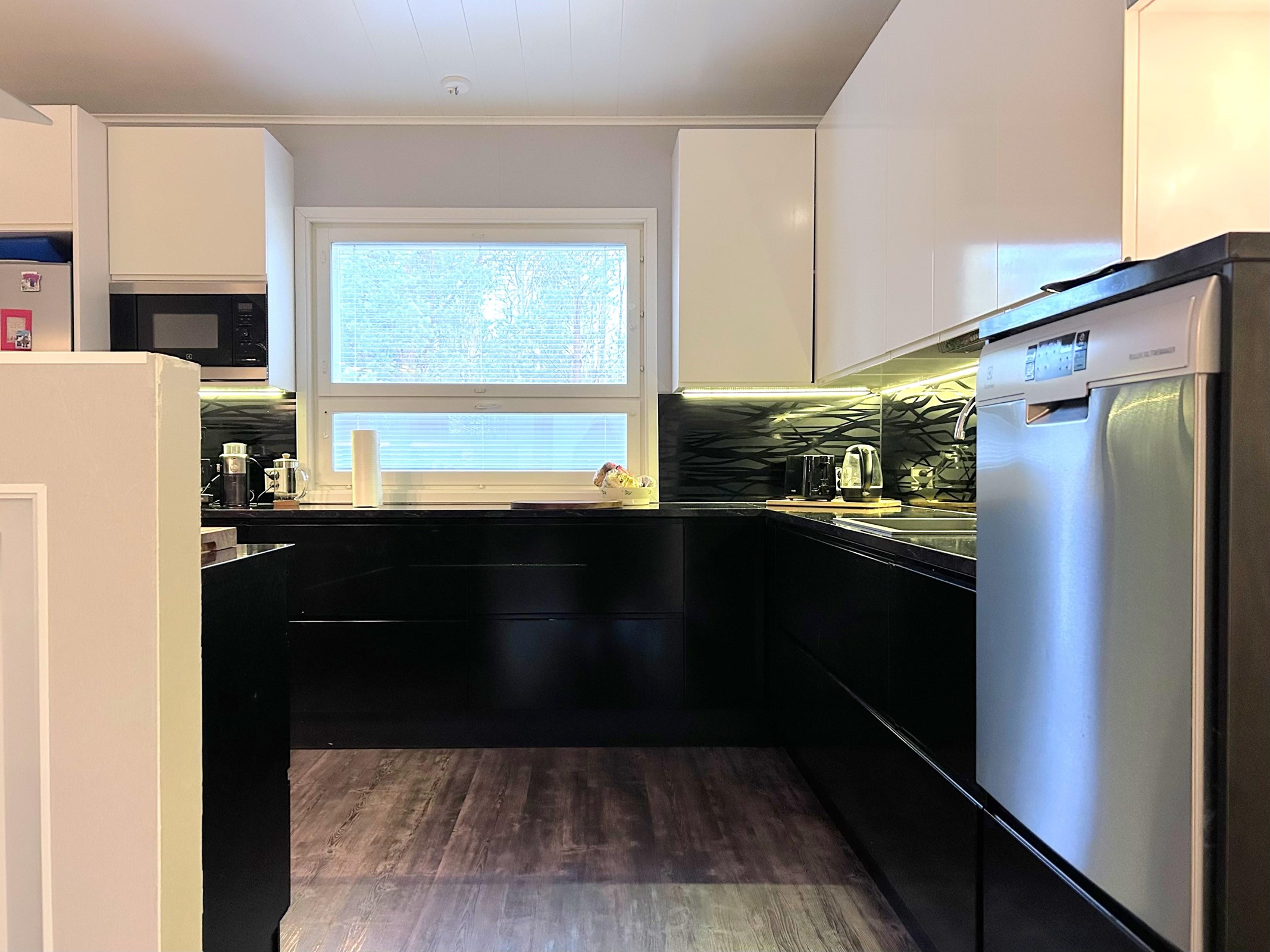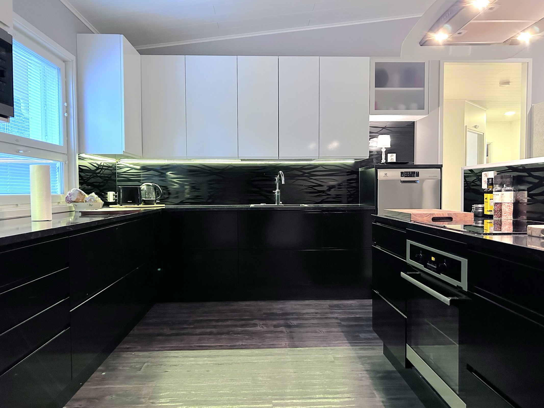 - Keittiön erottelee olohuoneesta saareke, jossa on induktioliesitason lisäksi runsaasti säilytystilaa. Kodin keittiön suunnittelussa on otettu huomioon käytännöllisyys, sillä tilassa on hulppeat säilytystilat sekä runsaat työskentely- ja laskutilat. Keittiön varusteina jääkaappi, pakastekaappi, erillisuuni, liesitaso, liesituuletin sekä astianpesukone.