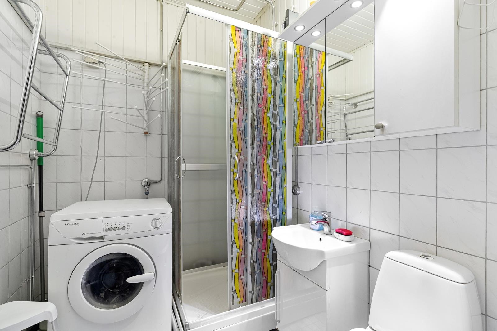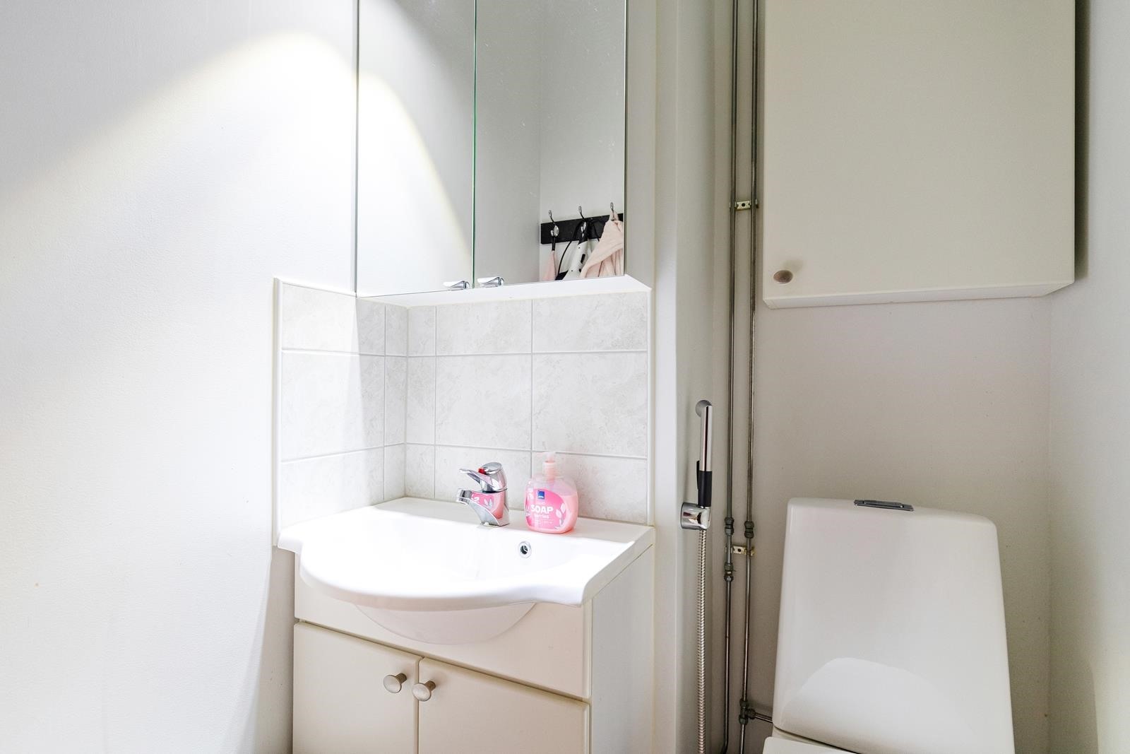 - Kylpyhuone, erillinen wc, suihku, suihkukaappi, peilikaappi, allaskaappi, pesukoneliitäntä, kiinteät valaisimet.