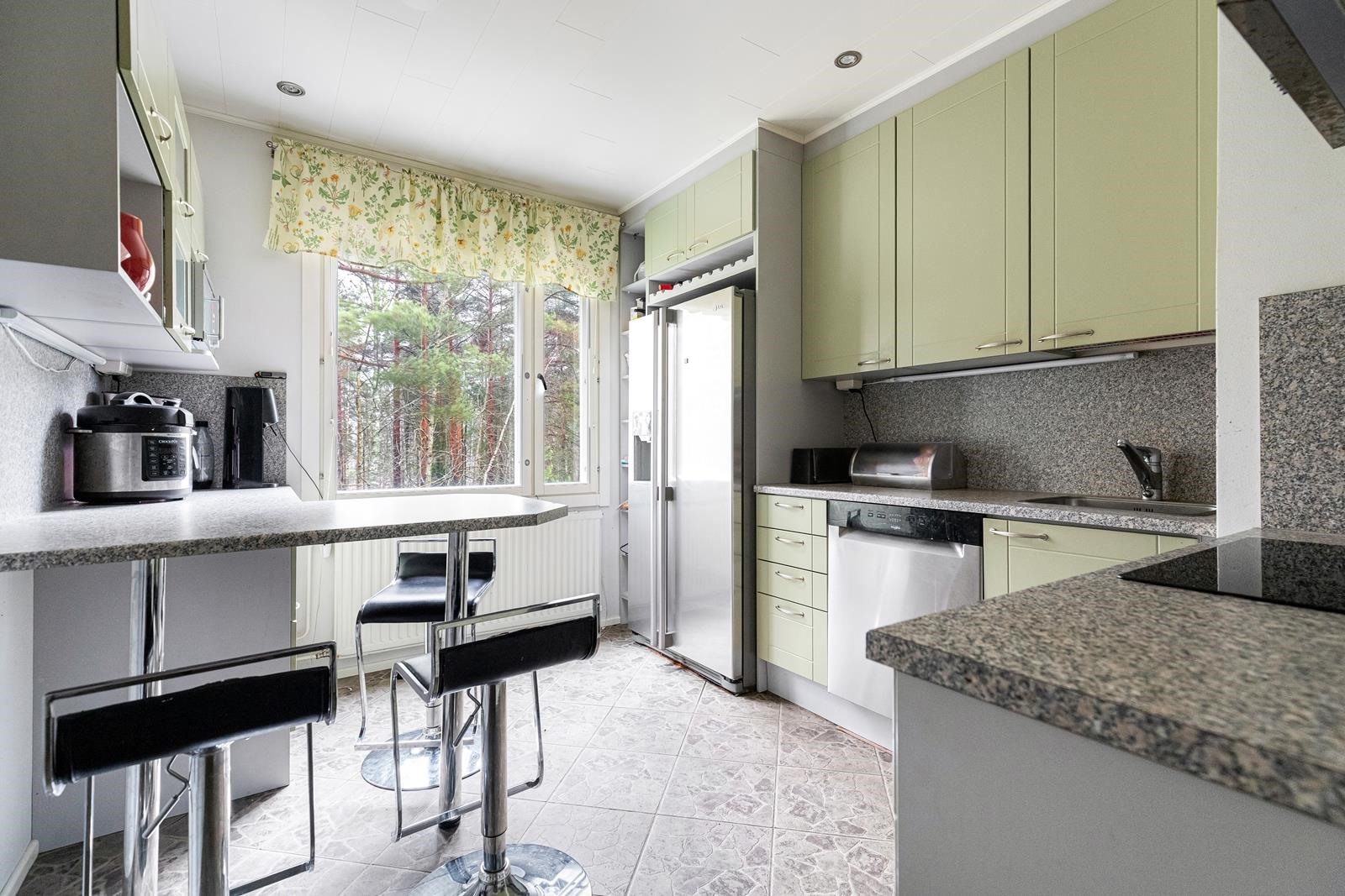 - Jääkaappipakastin, erillisuuni, keraaminen liesi, liesituuletin, astianpesukone, kaapistot, kiinteät valaisimet.