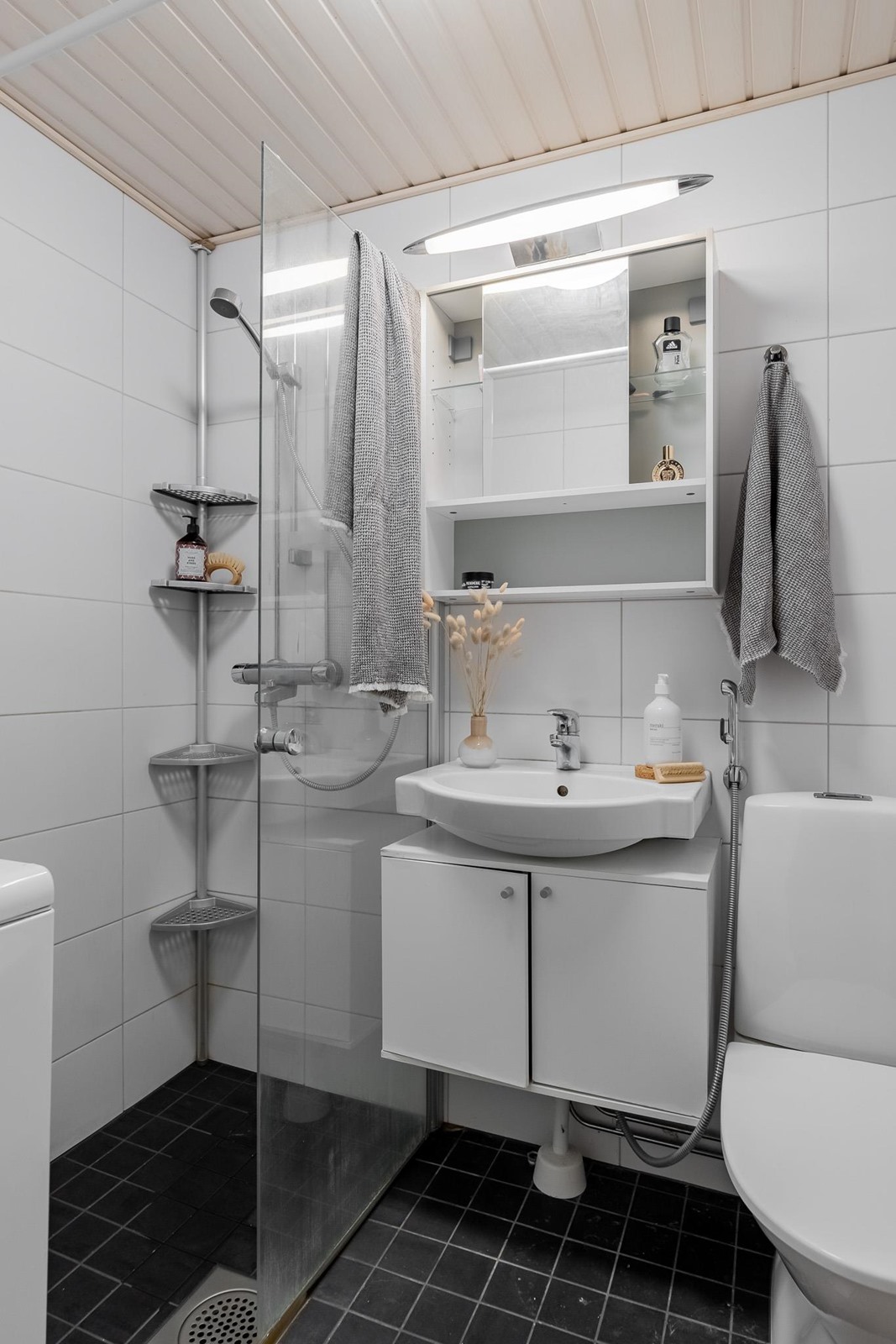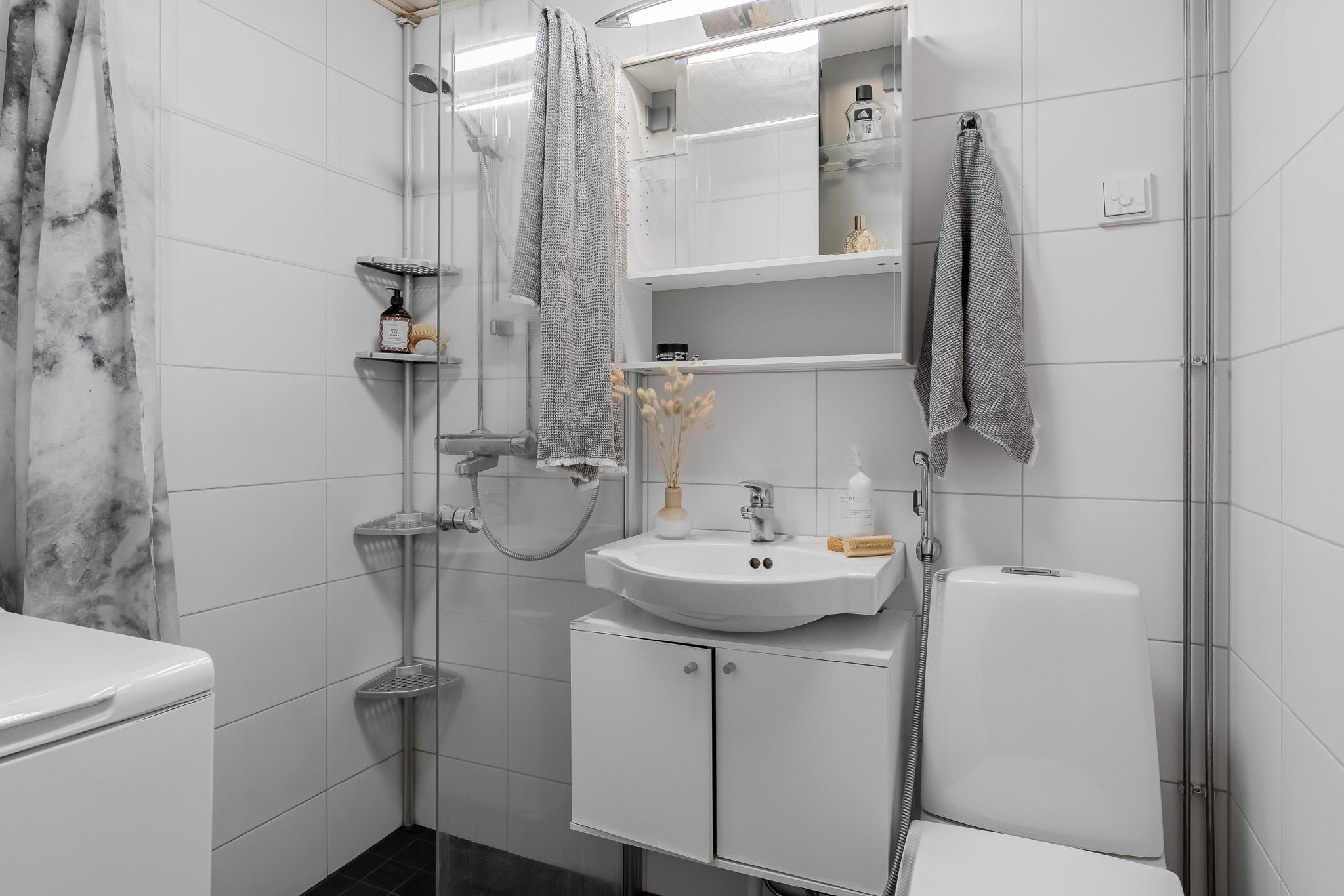 - Kylpyhuone, suihku, suihkuseinä, peilikaappi, allaskaappi, pesukoneliitäntä, kiinteät valaisimet.