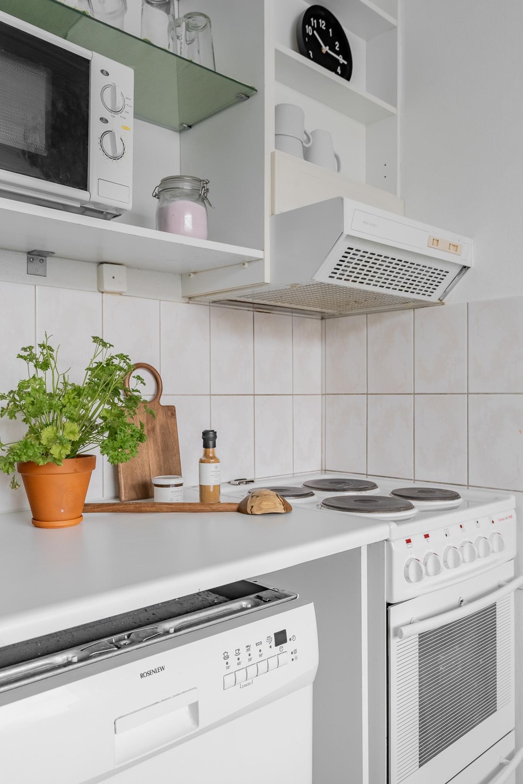 - Jääkaappipakastin, lattialiesi, liesituuletin, astianpesukone, kaapistot, kiinteät valaisimet.