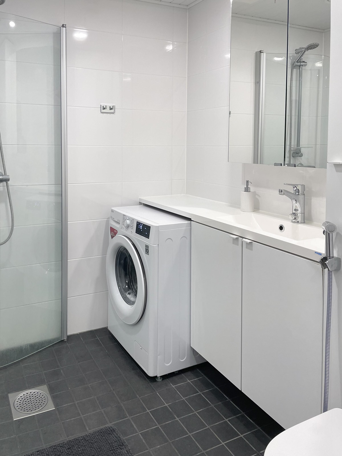 - Kylpyhuone, suihku, suihkuseinä, peilit, allaskaappi, pesukoneliitäntä, lattialämmitys, kiinteät valaisimet.
