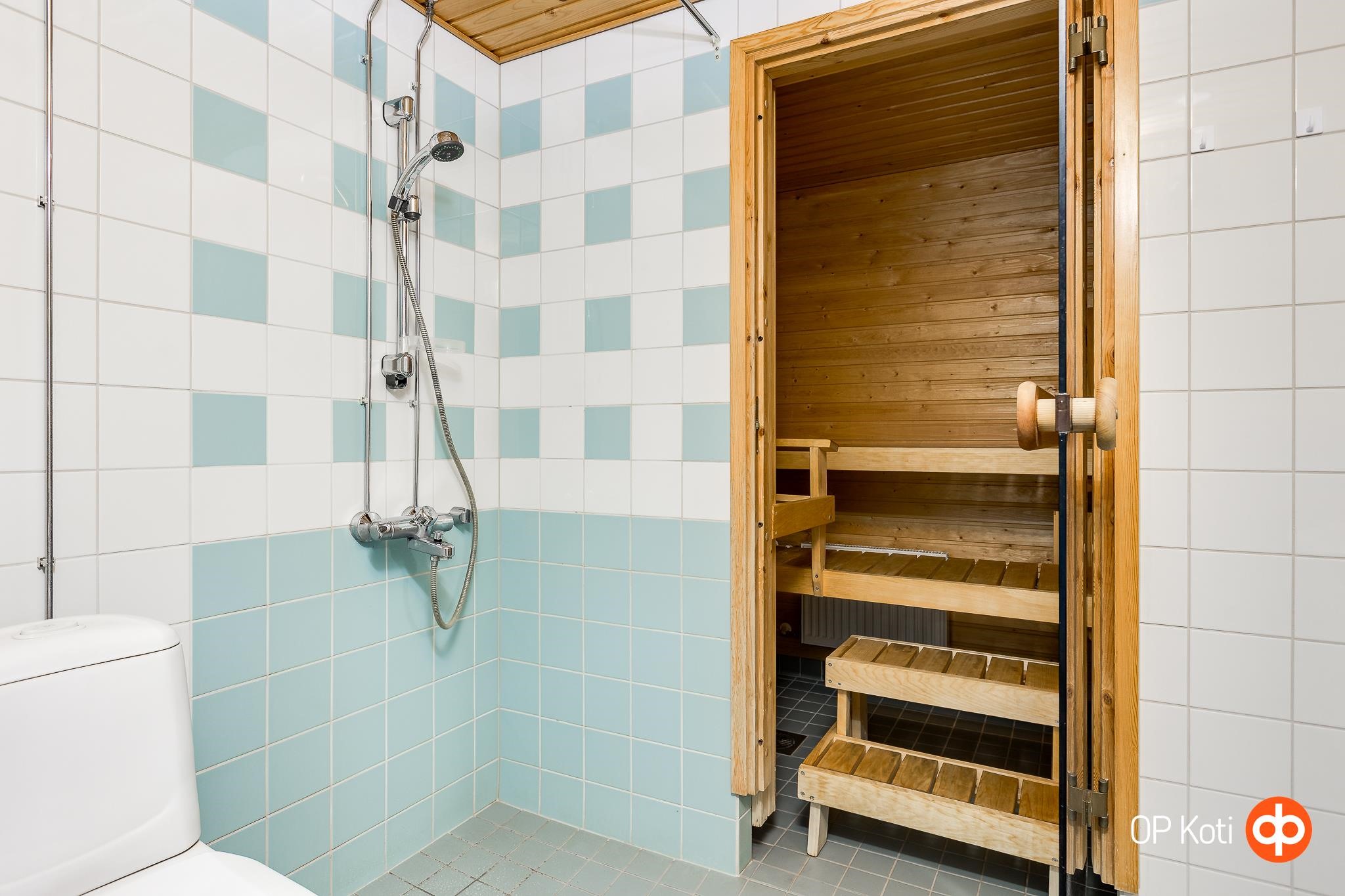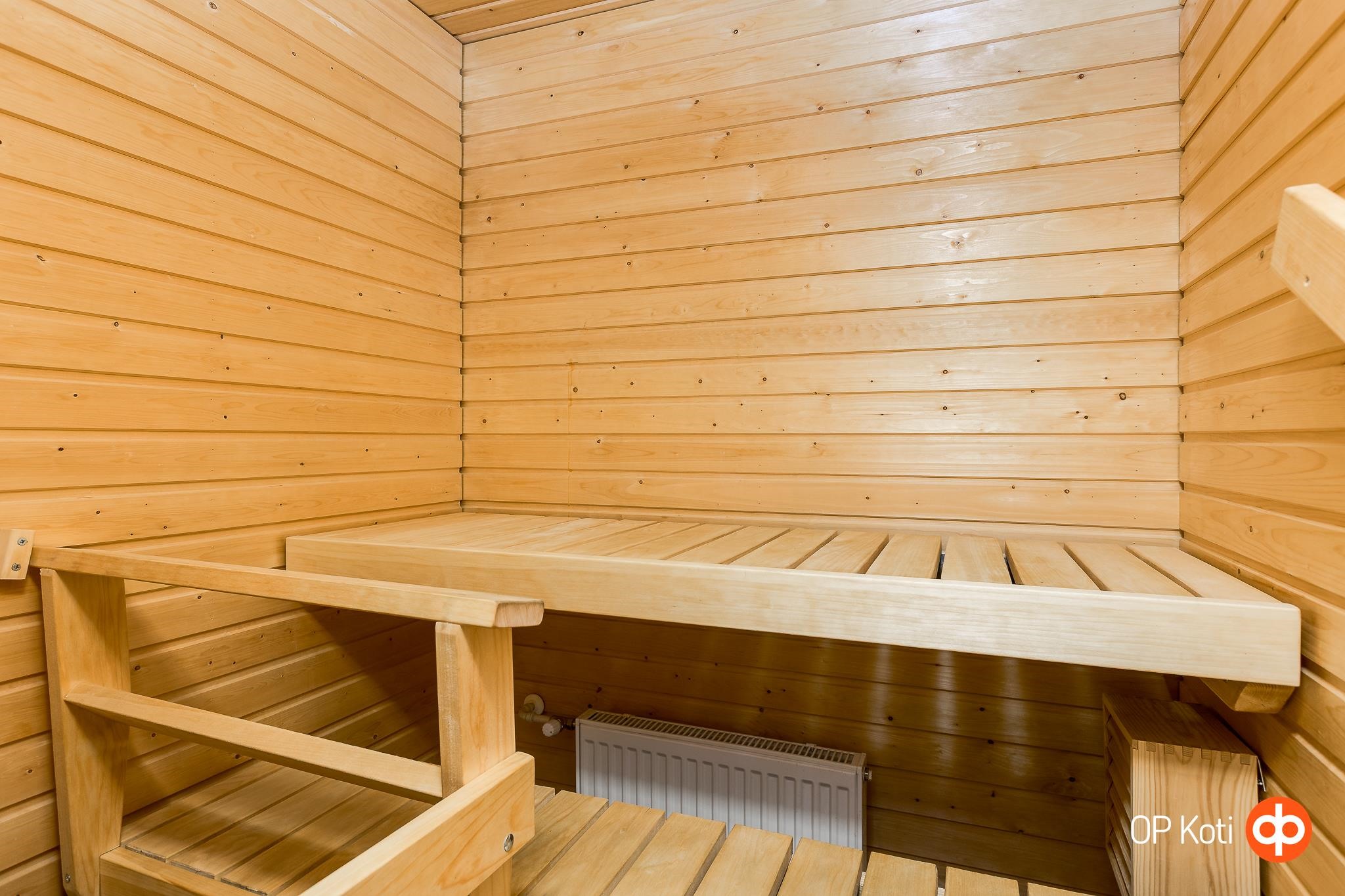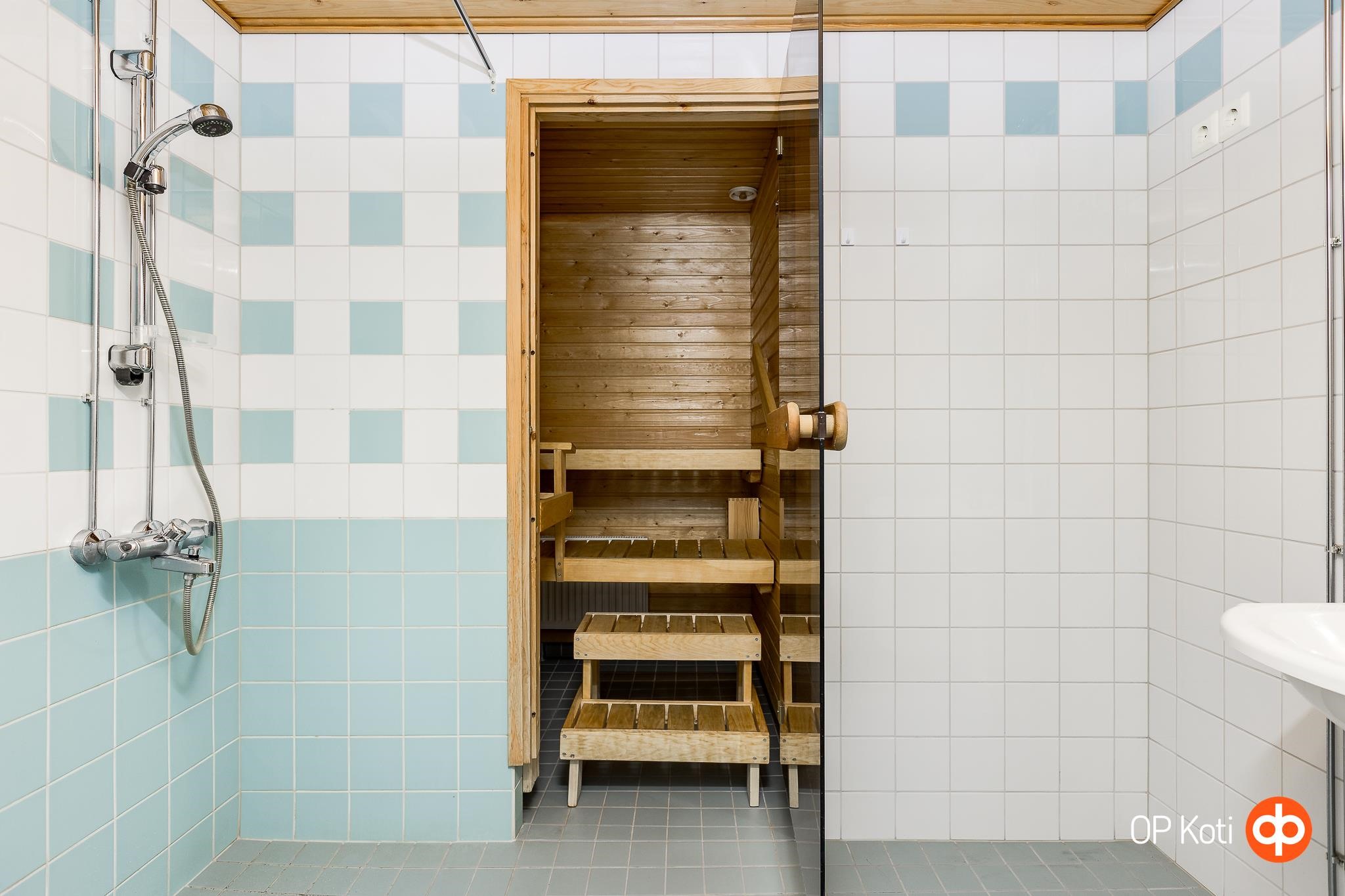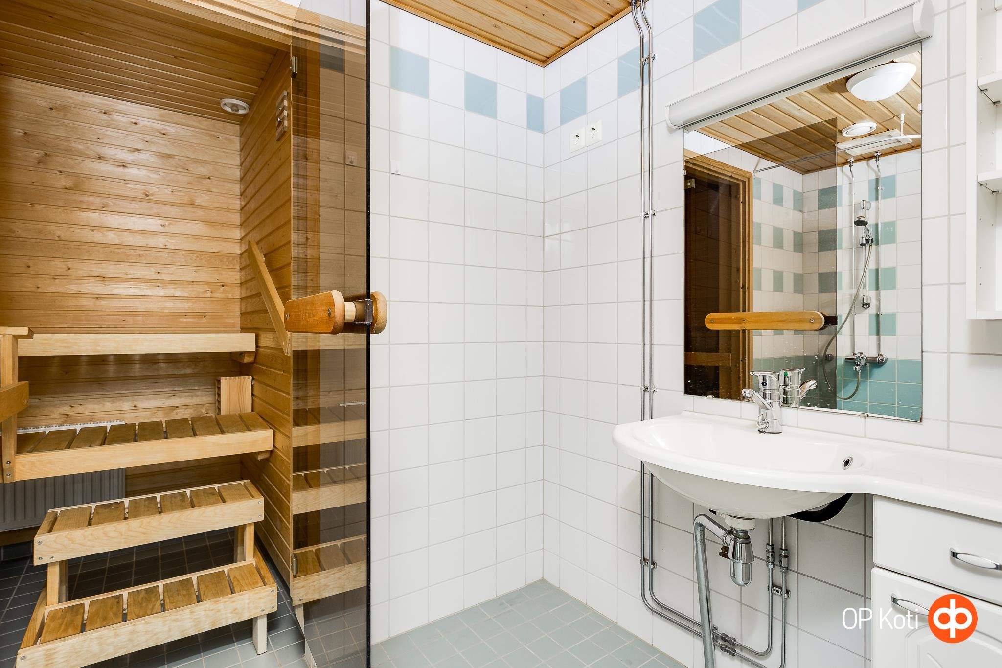 - Sauna, sähkökiuas, kylpyhuone, suihku, peilit, allaskaappi, kiinteät valaisimet.