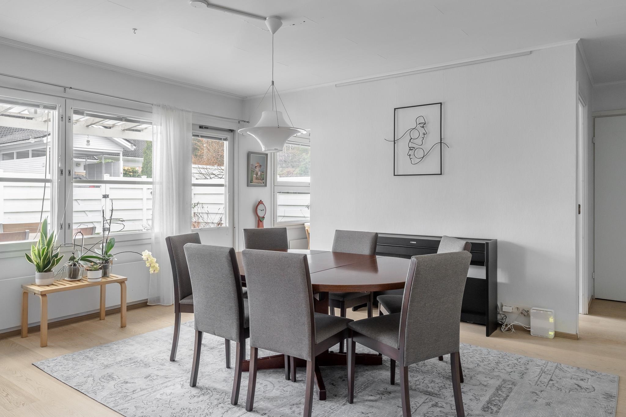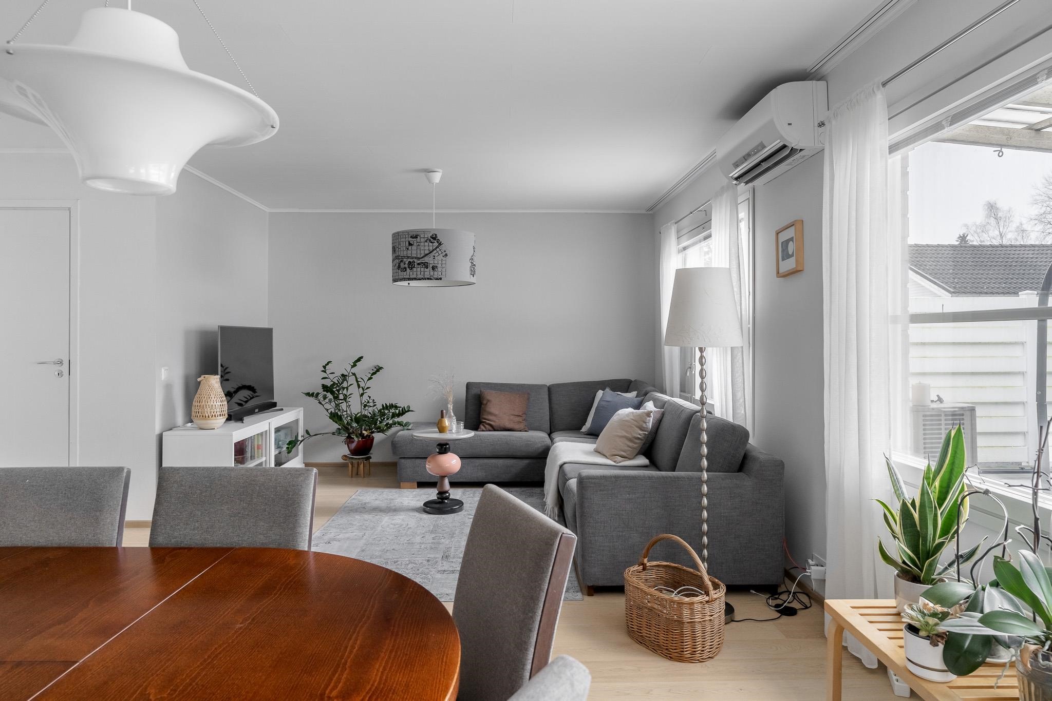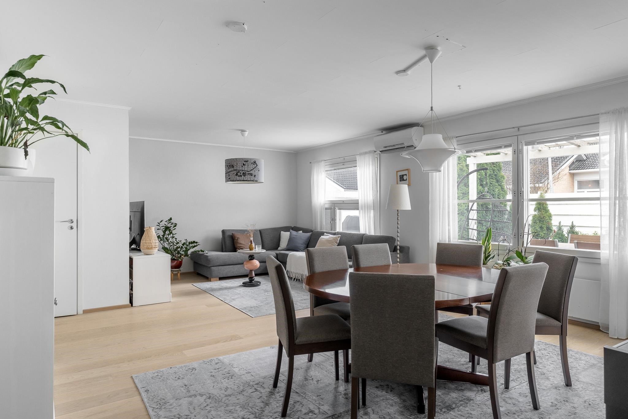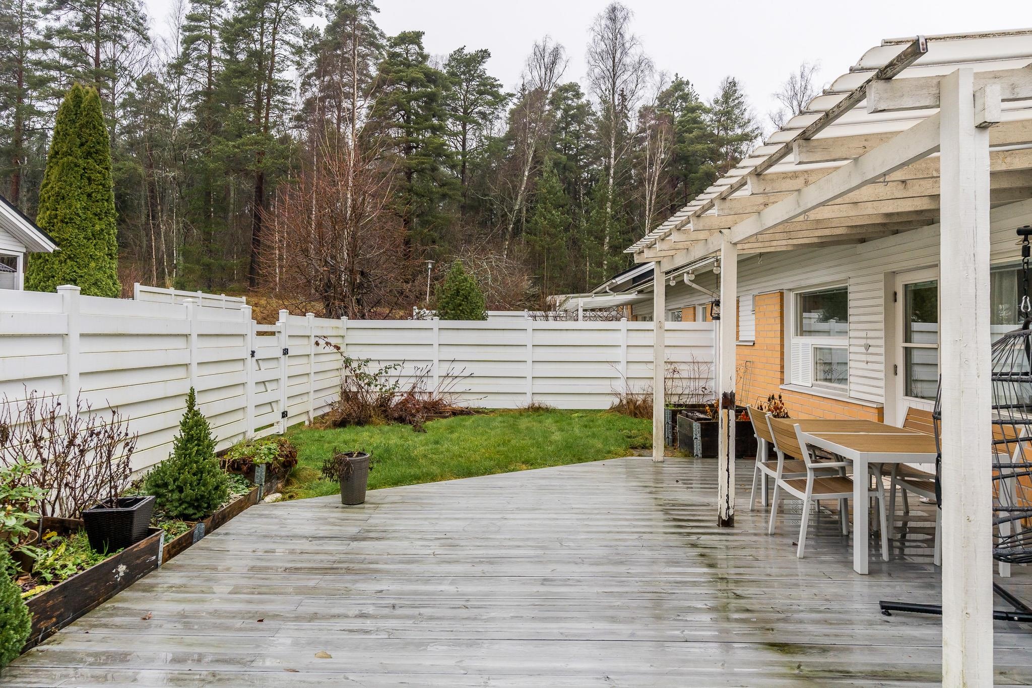 Tämä koti tarjoaa avaruutta ja viihtyisyyttä rauhallisella sijainnilla päättyvän tien varrella. Iso olohuone kutsuu viettämään aikaa yhdessä ja sen suurista ikkunoista avautuu näkymä omalle, suojaisalle terassipihalle, jossa ilta-aurinko luo tunnelmaa. Terassi on osittain katettu ja viherpeukaloillekin on jätetty tilaa istutuksille.