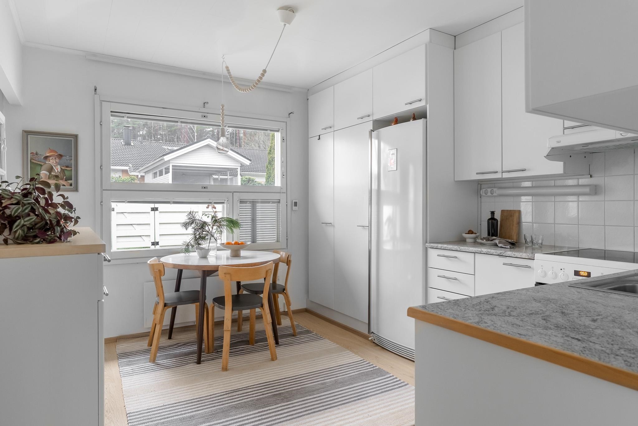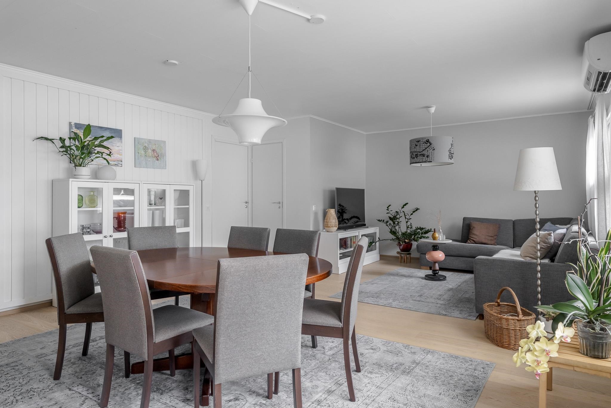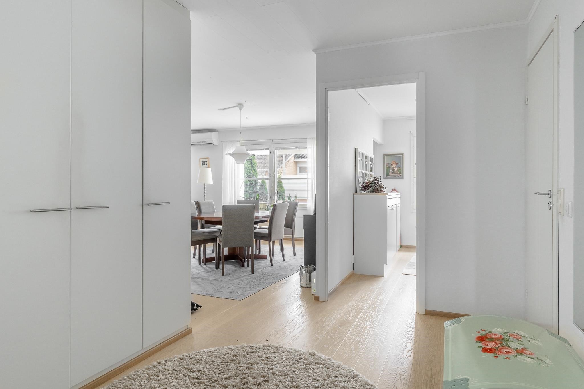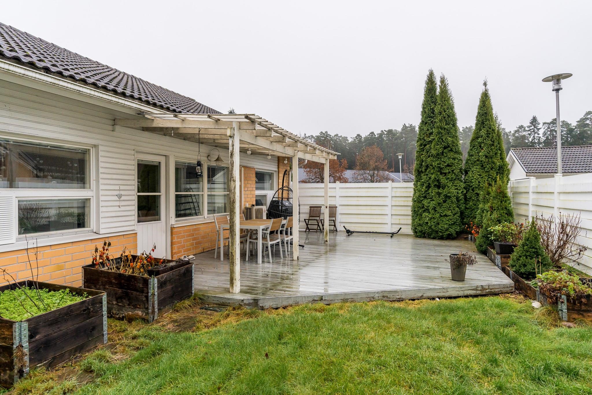 Tämä koti tarjoaa avaruutta ja viihtyisyyttä rauhallisella sijainnilla päättyvän tien varrella. Iso olohuone kutsuu viettämään aikaa yhdessä ja sen suurista ikkunoista avautuu näkymä omalle, suojaisalle terassipihalle, jossa ilta-aurinko luo tunnelmaa. Terassi on osittain katettu ja viherpeukaloillekin on jätetty tilaa istutuksille.