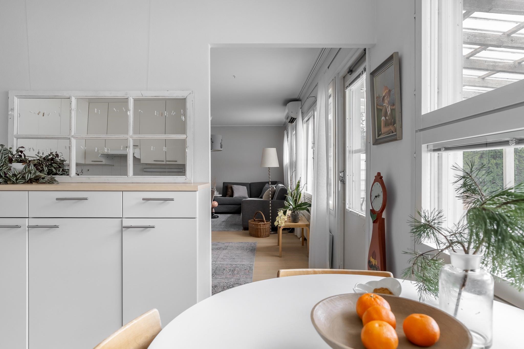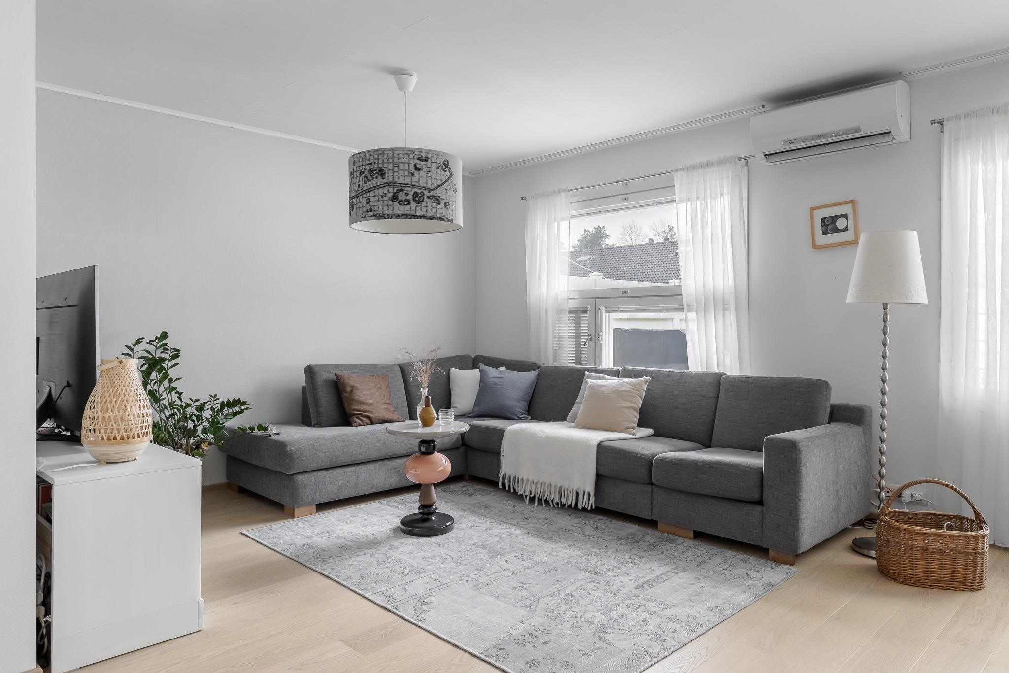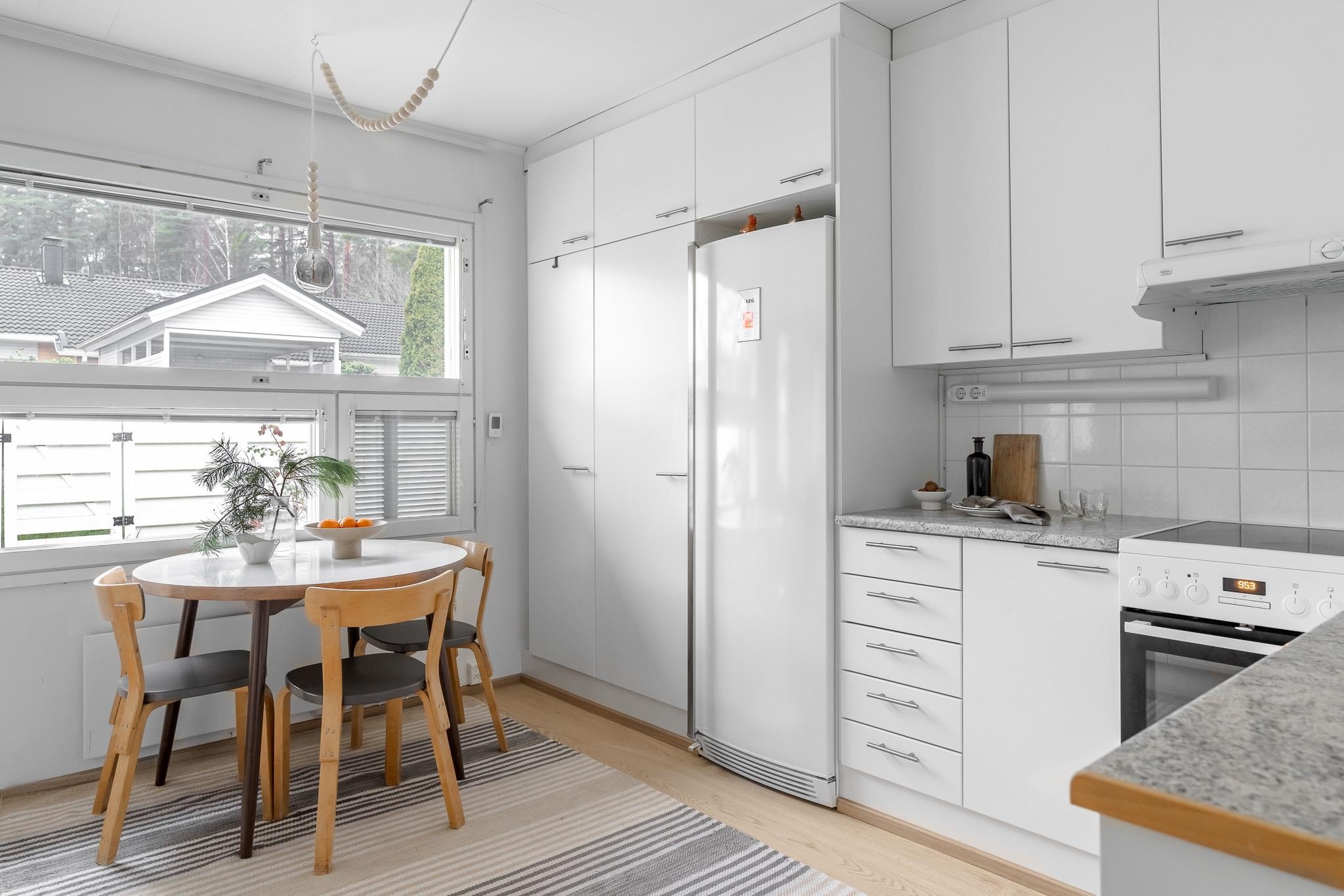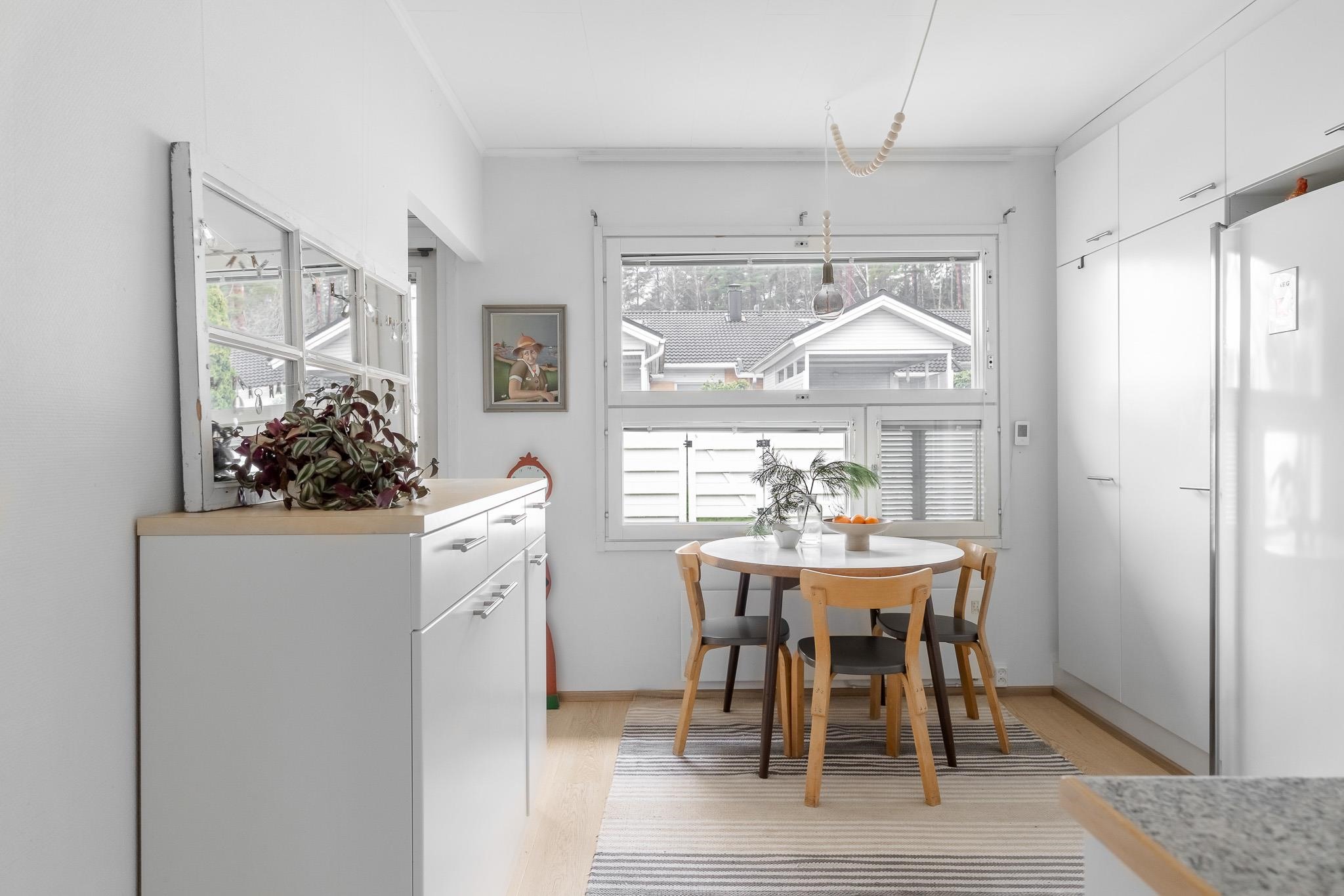 Tämä koti tarjoaa avaruutta ja viihtyisyyttä rauhallisella sijainnilla päättyvän tien varrella. Iso olohuone kutsuu viettämään aikaa yhdessä ja sen suurista ikkunoista avautuu näkymä omalle, suojaisalle terassipihalle, jossa ilta-aurinko luo tunnelmaa. Terassi on osittain katettu ja viherpeukaloillekin on jätetty tilaa istutuksille.