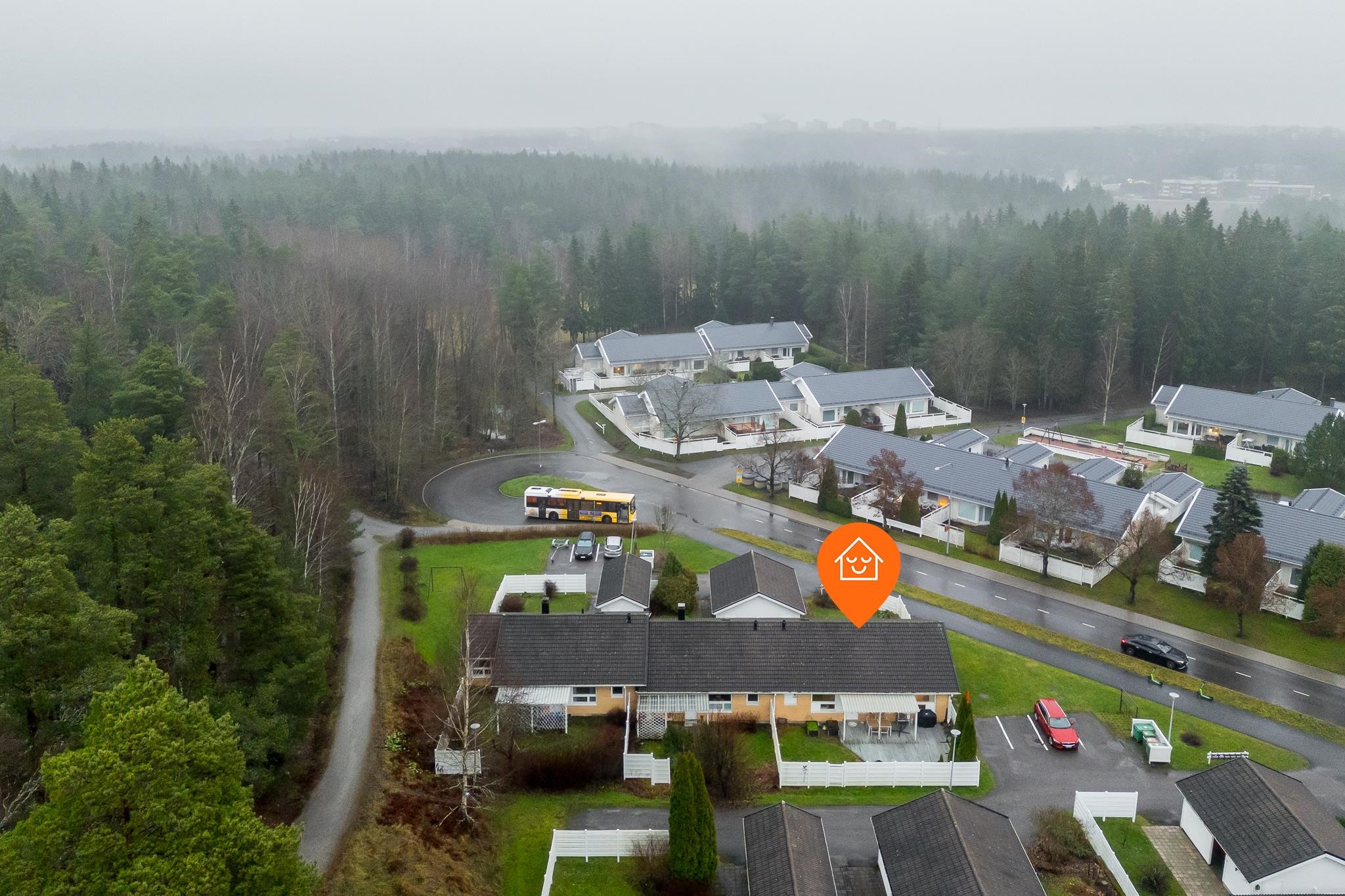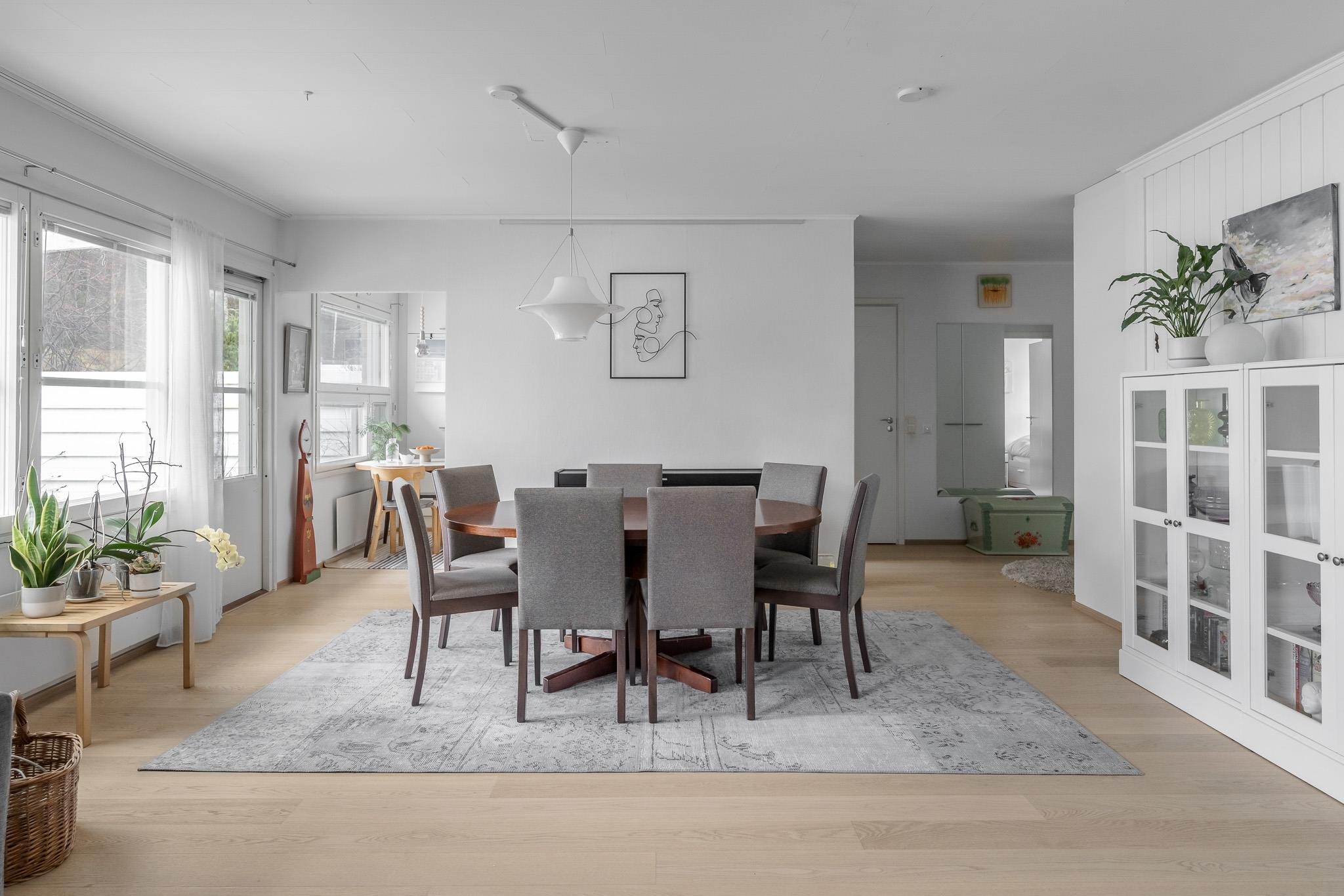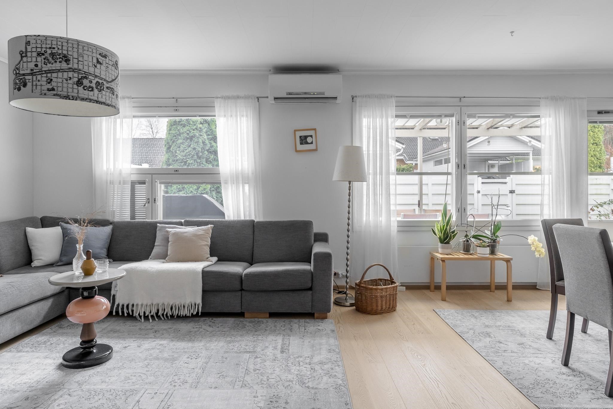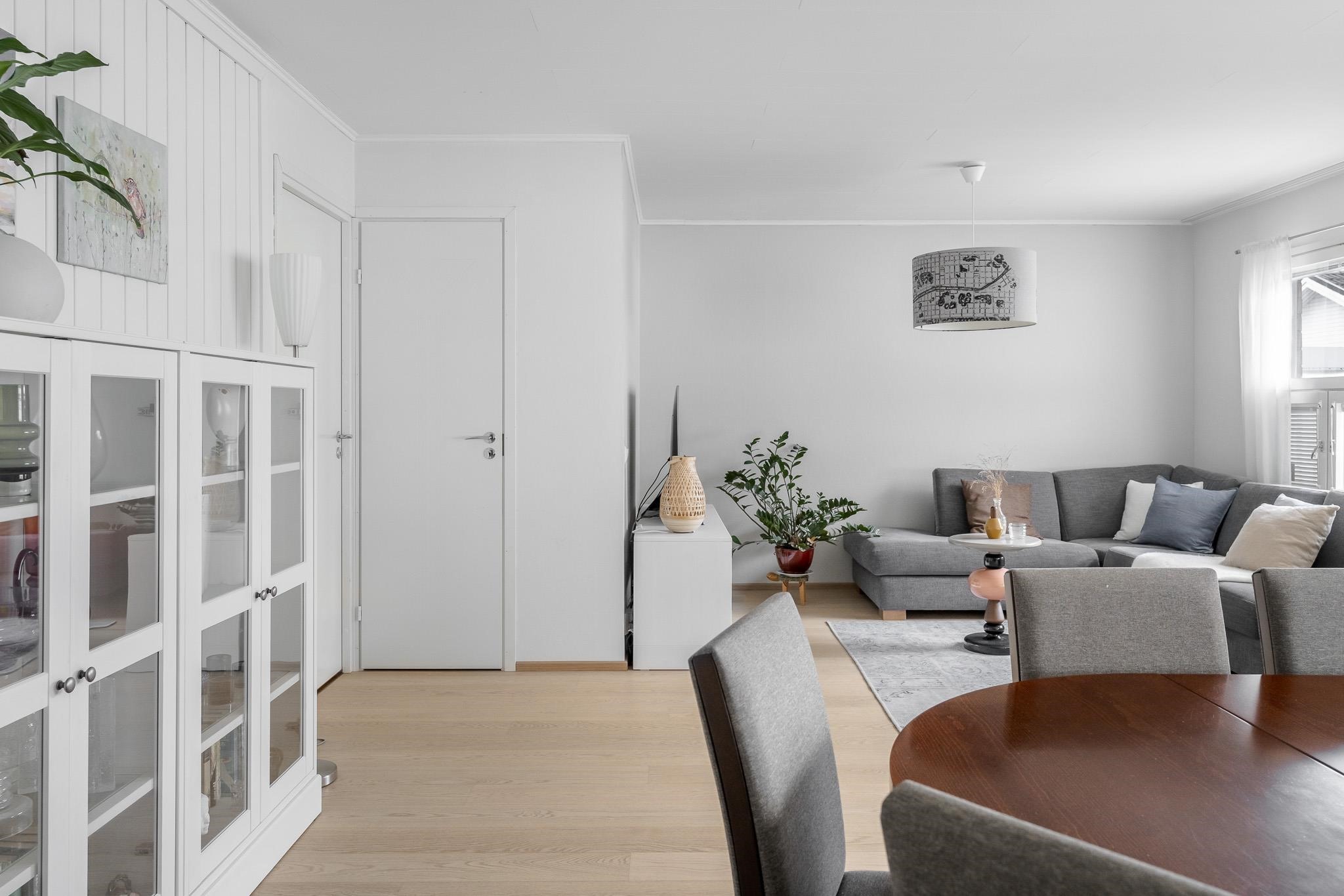 Tämä koti tarjoaa avaruutta ja viihtyisyyttä rauhallisella sijainnilla päättyvän tien varrella. Iso olohuone kutsuu viettämään aikaa yhdessä ja sen suurista ikkunoista avautuu näkymä omalle, suojaisalle terassipihalle, jossa ilta-aurinko luo tunnelmaa. Terassi on osittain katettu ja viherpeukaloillekin on jätetty tilaa istutuksille.