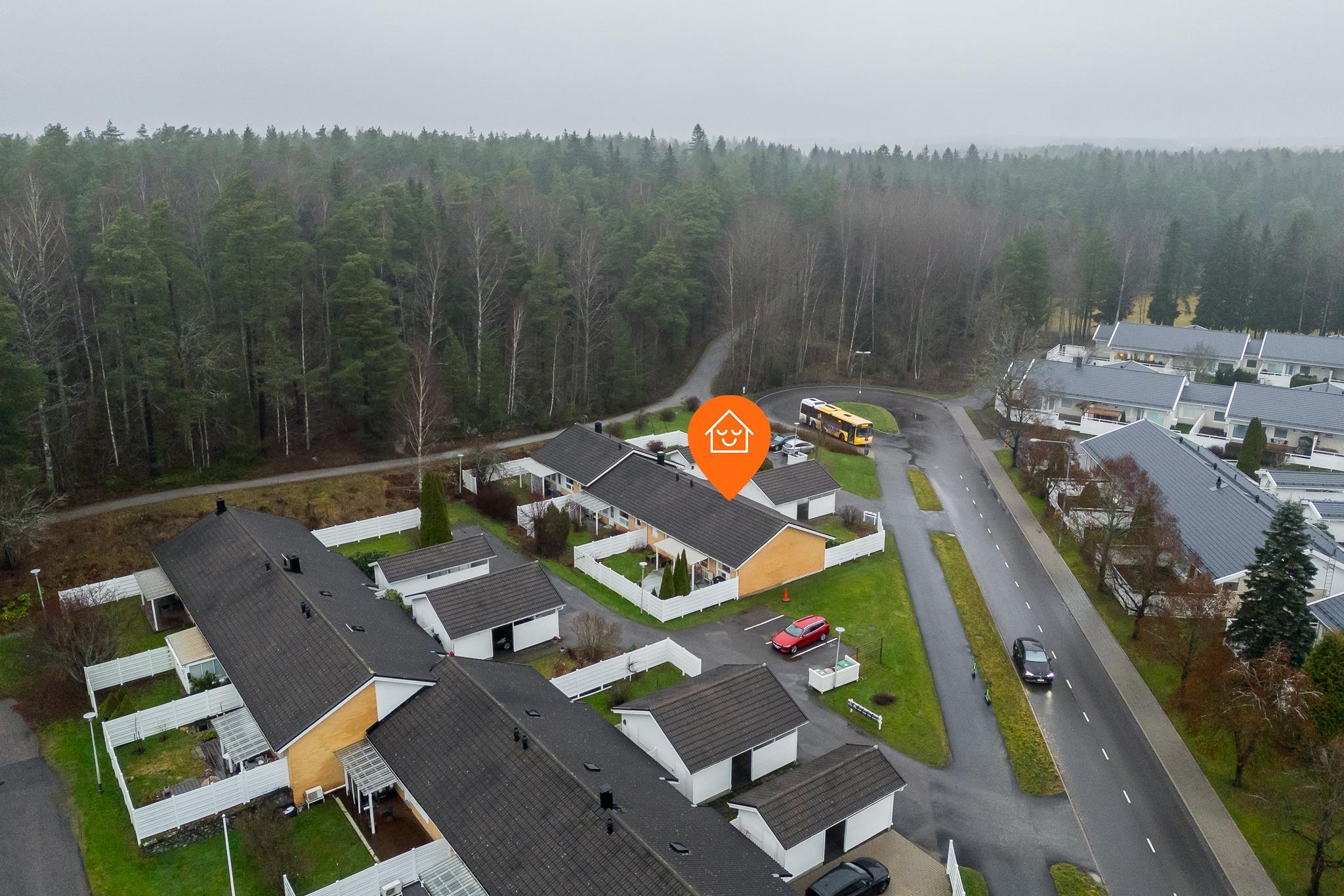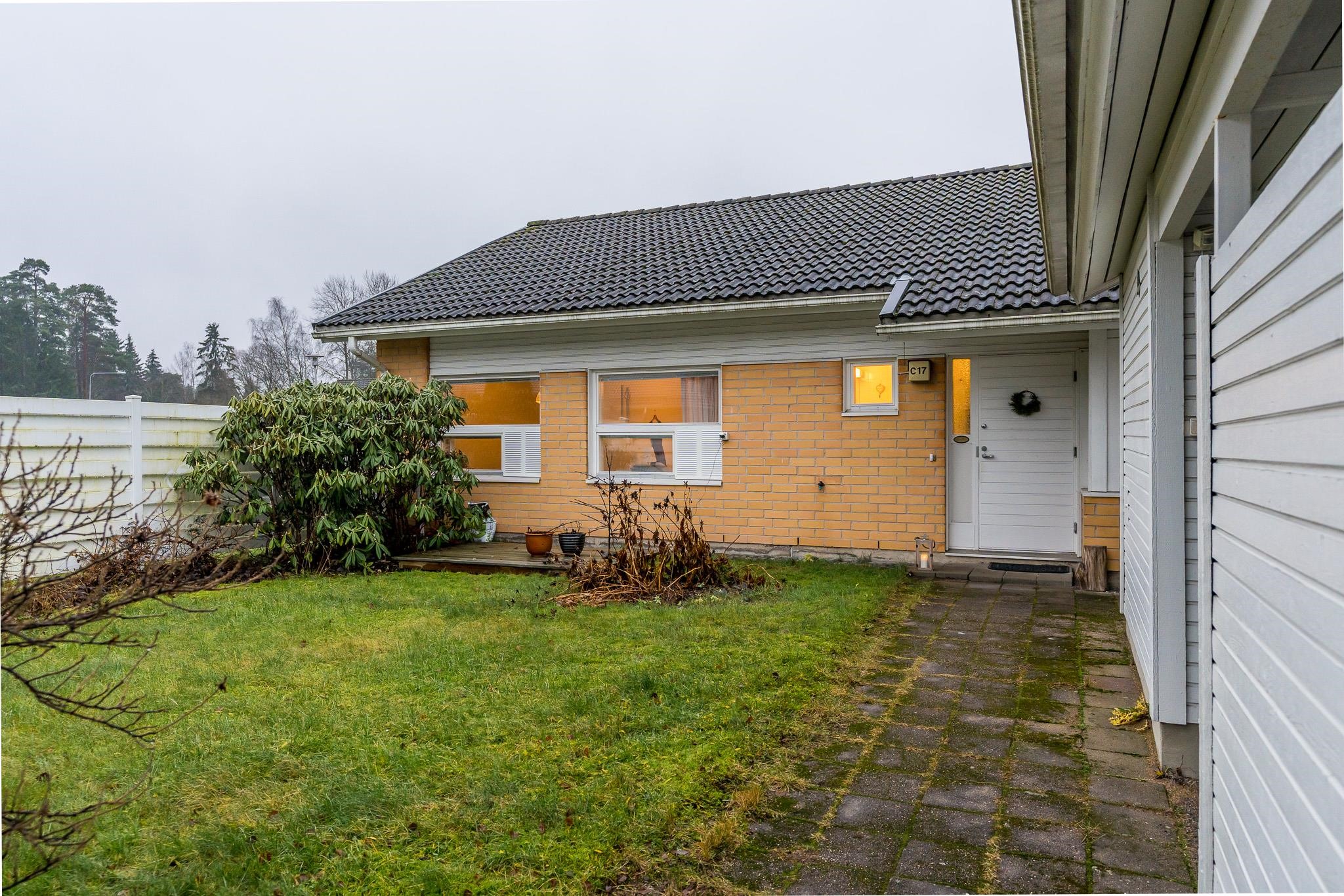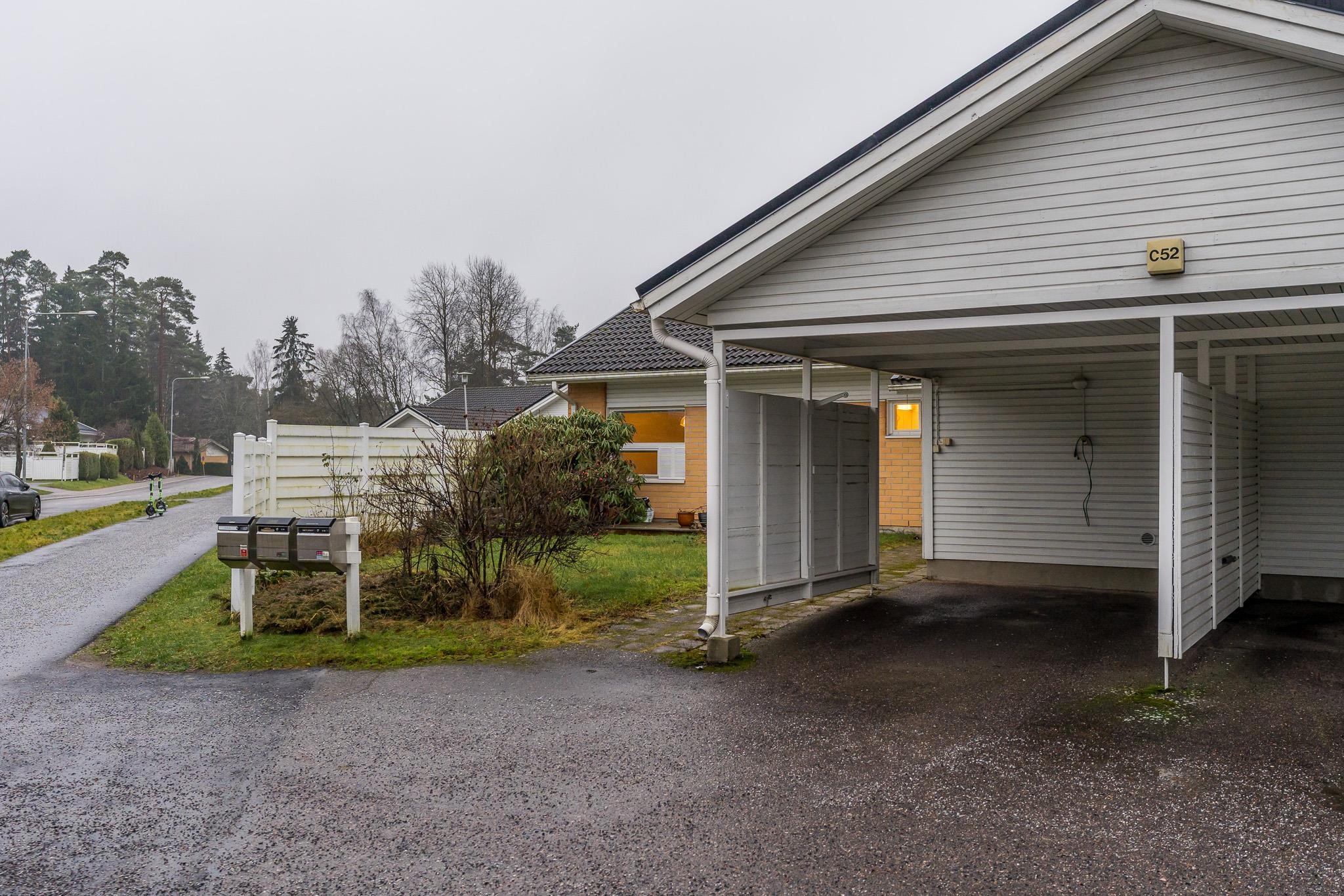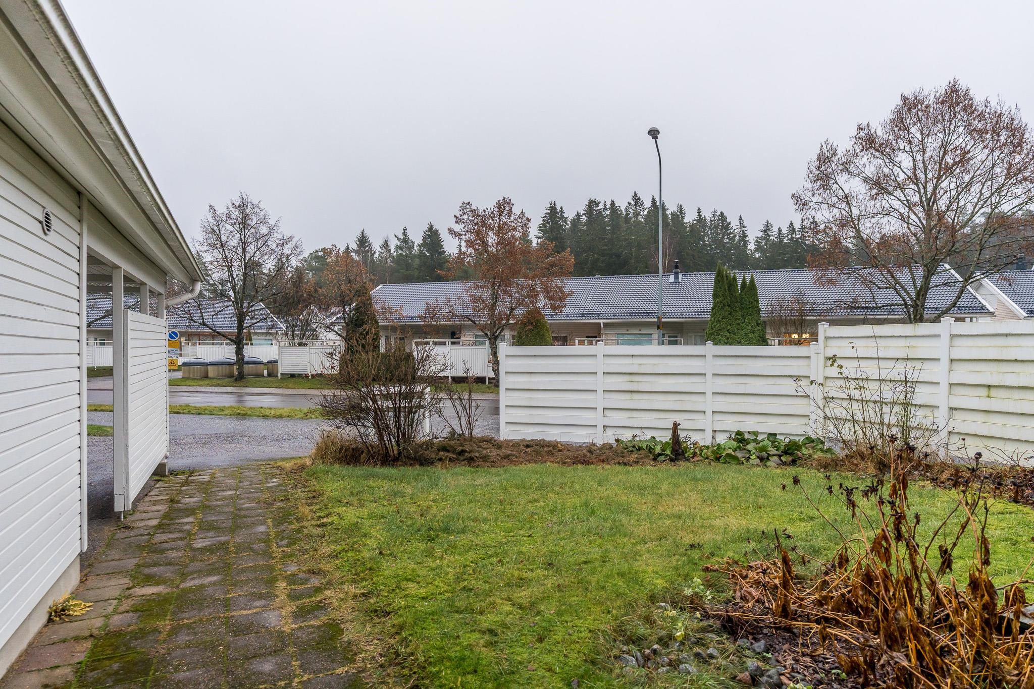 Etupihalla, aamuauringon puolella, on aidattu ja istutuksin viimeistelty piha-alue. Oman autokatospaikan ja tilavan ulkovaraston ansiosta arki on helppoa ja toimivaa.
