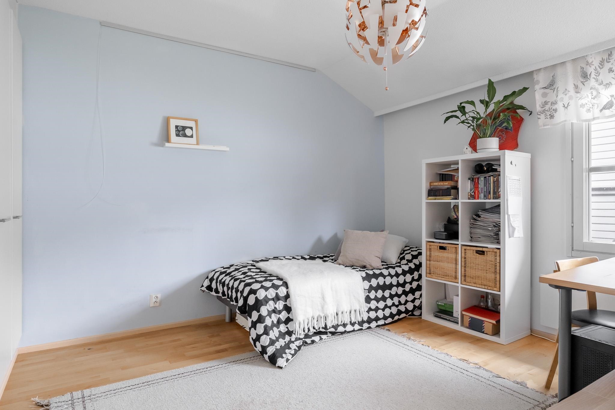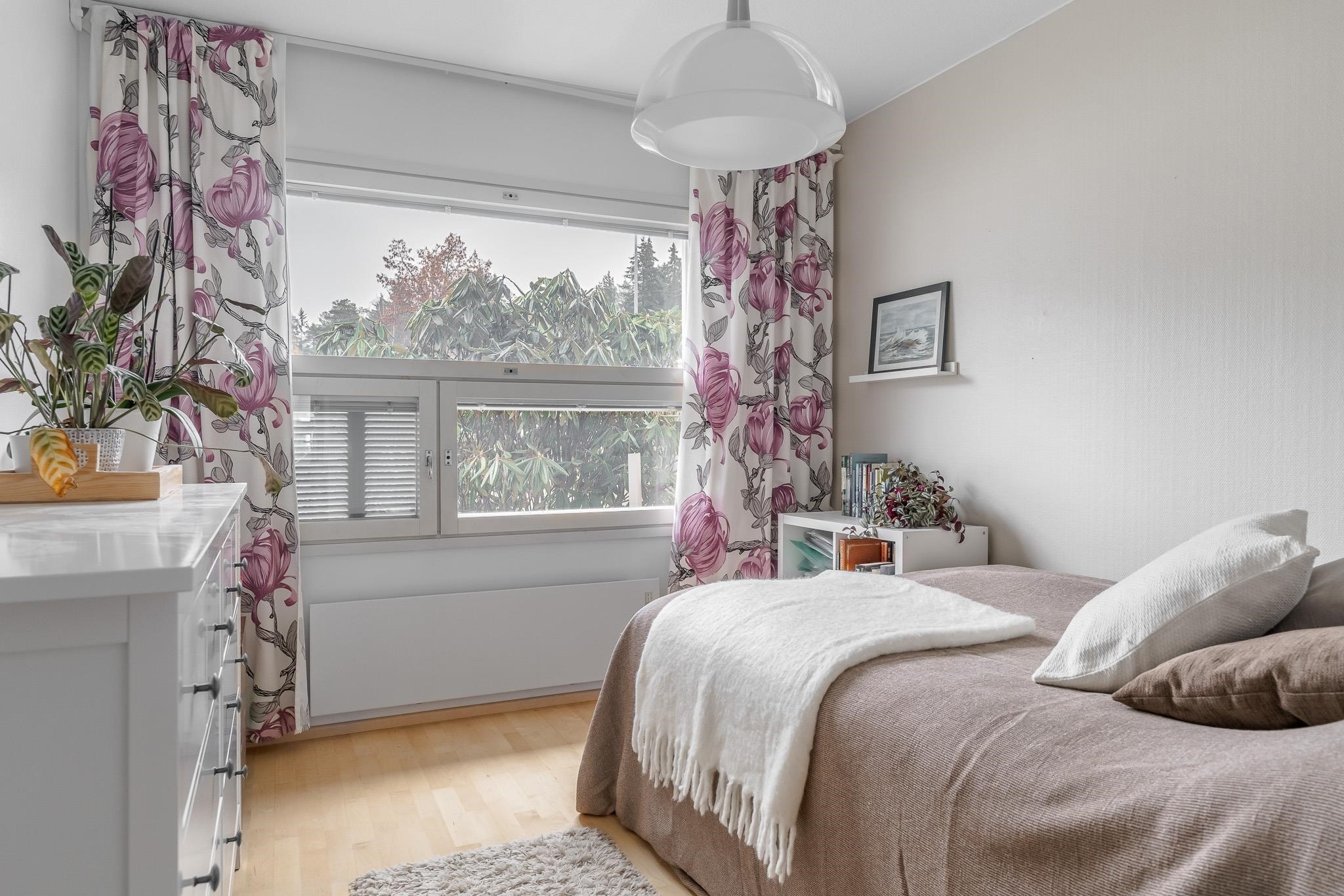 Keittiö on käytännöllinen ja makuuhuoneita on kolme - tai tarvittaessa neljä, jos haluat jakaa olohuoneen yhtiöjärjestyksen mukaisesti kahdeksi huoneeksi. Pesuhuone on tilava ja sen yhteydessä on sauna, jonka ikkuna tuo kylpemiseen lisää tunnelmaa. Erillinen wc lisää arjen sujuvuutta.