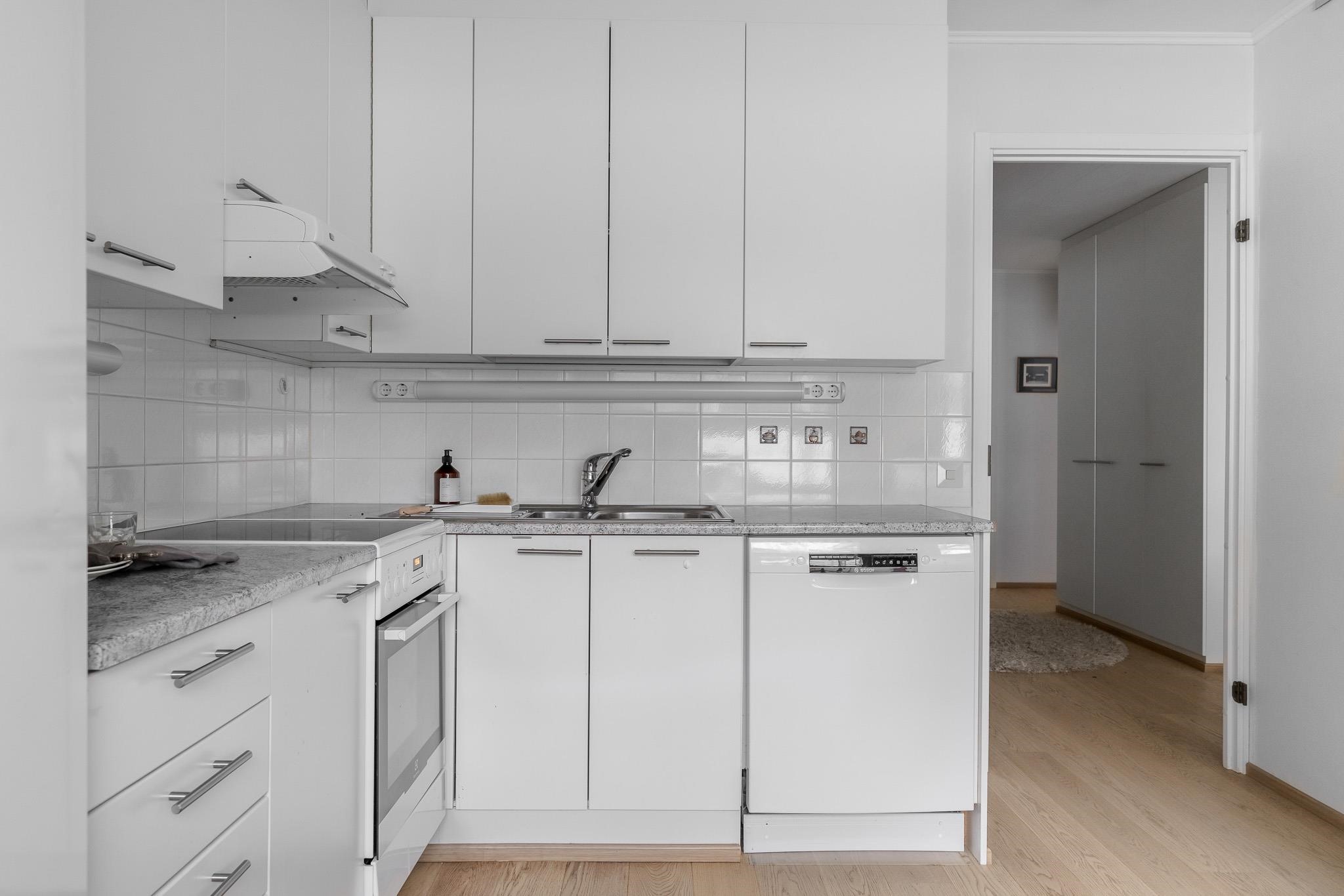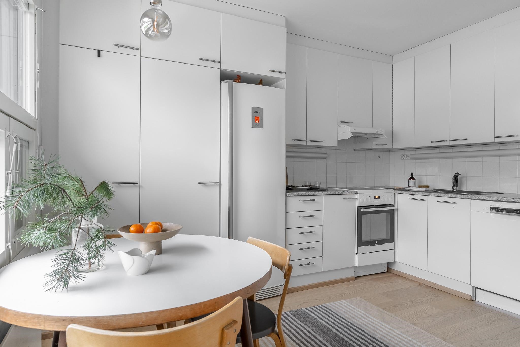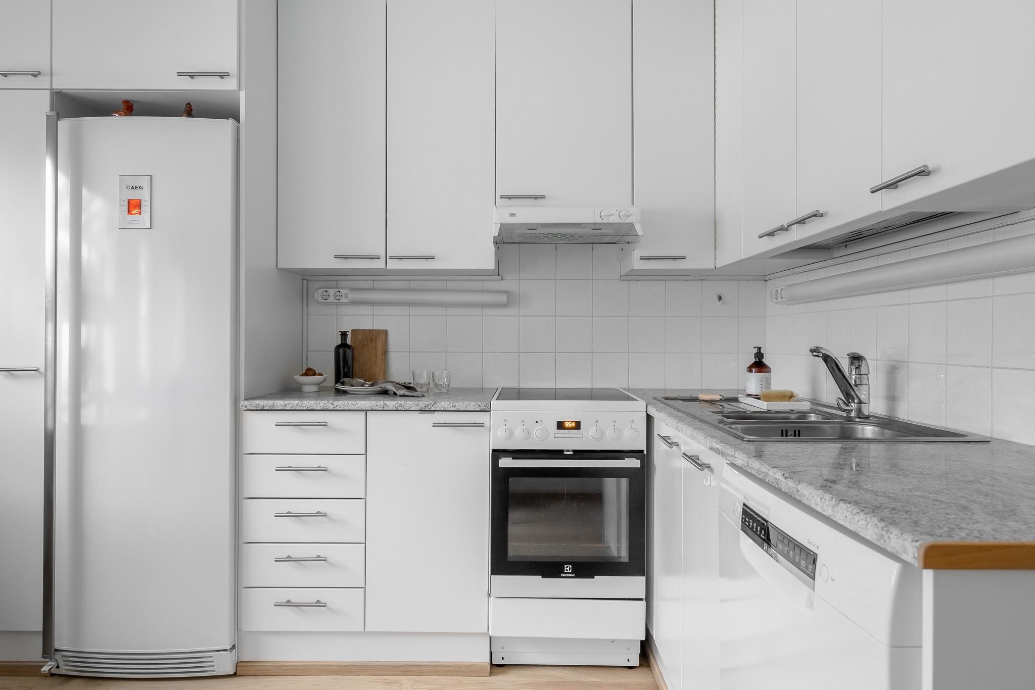 - Jääkaappi, induktioliesi, liesituuletin, astianpesukone, kaapistot, kiinteät valaisimet.