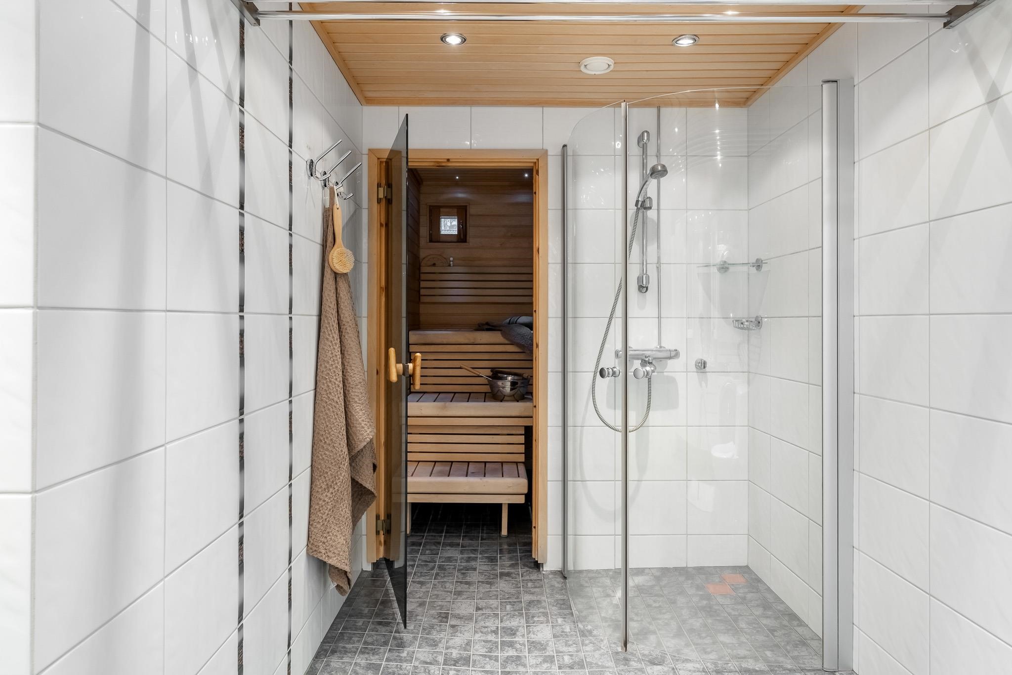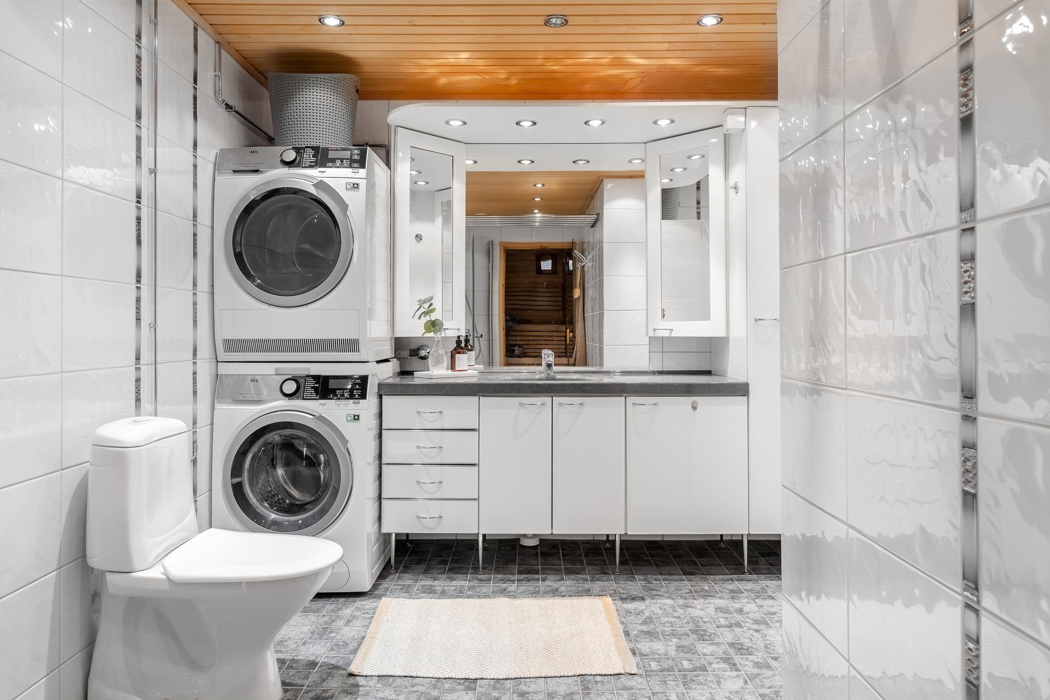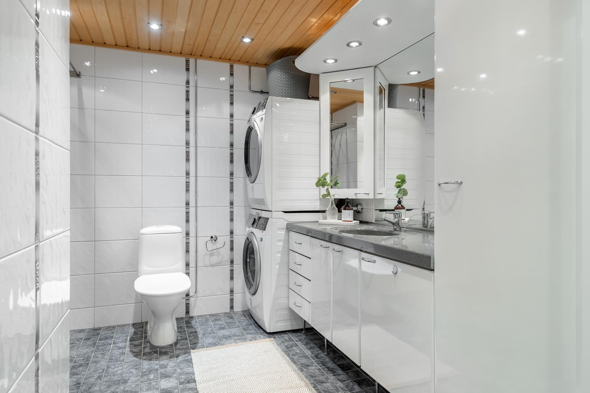 - Sauna, sähkökiuas, kylpyhuone, erillinen wc, suihku, suihkuseinä, peilikaappi, allaskaappi, pesukoneliitäntä, lattialämmitys kylpyhuoneessa, kiinteät valaisimet. Kylpyhuone remontoitu tietämän mukaan 2000 -luvun alkupuolella.