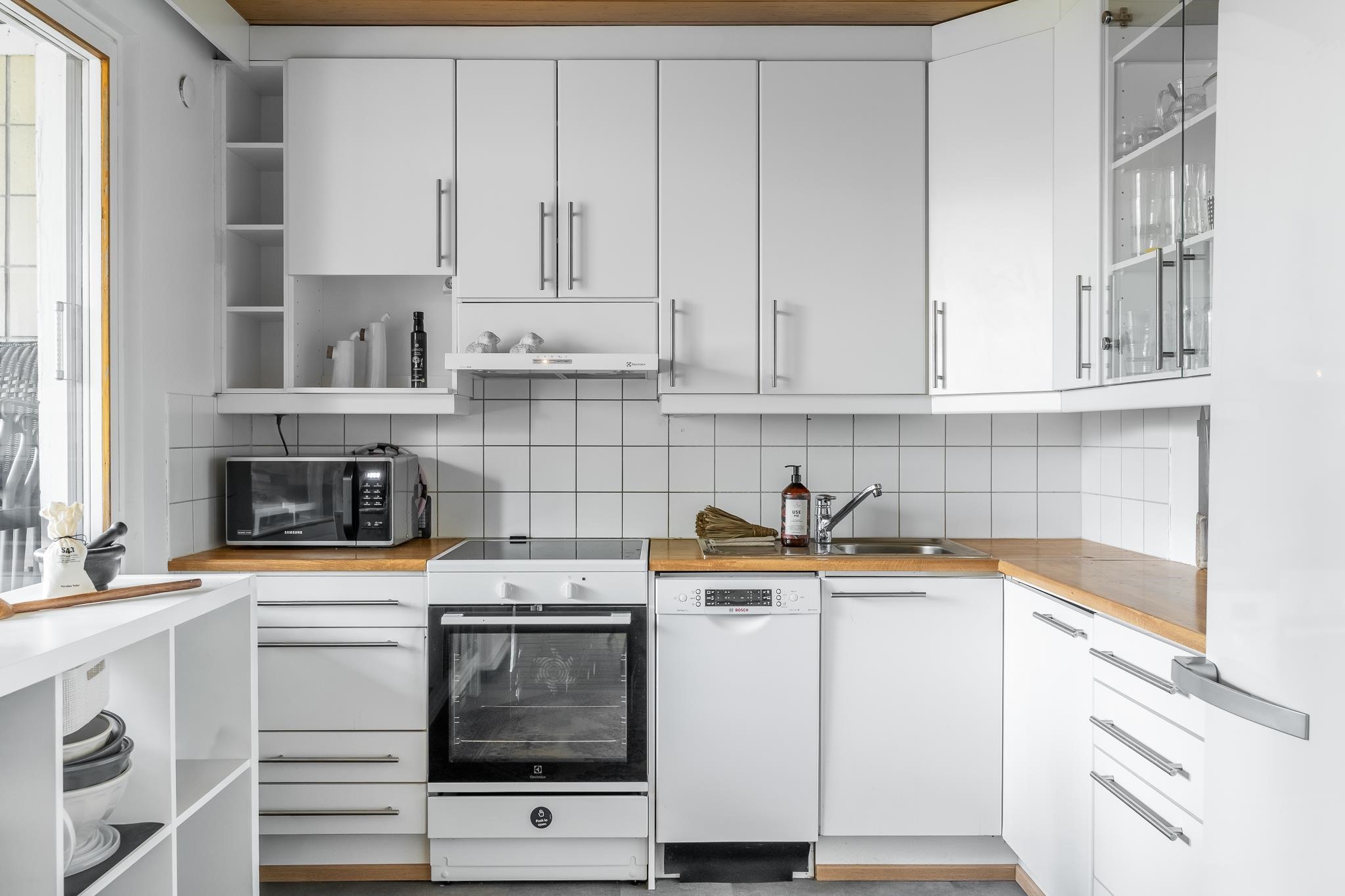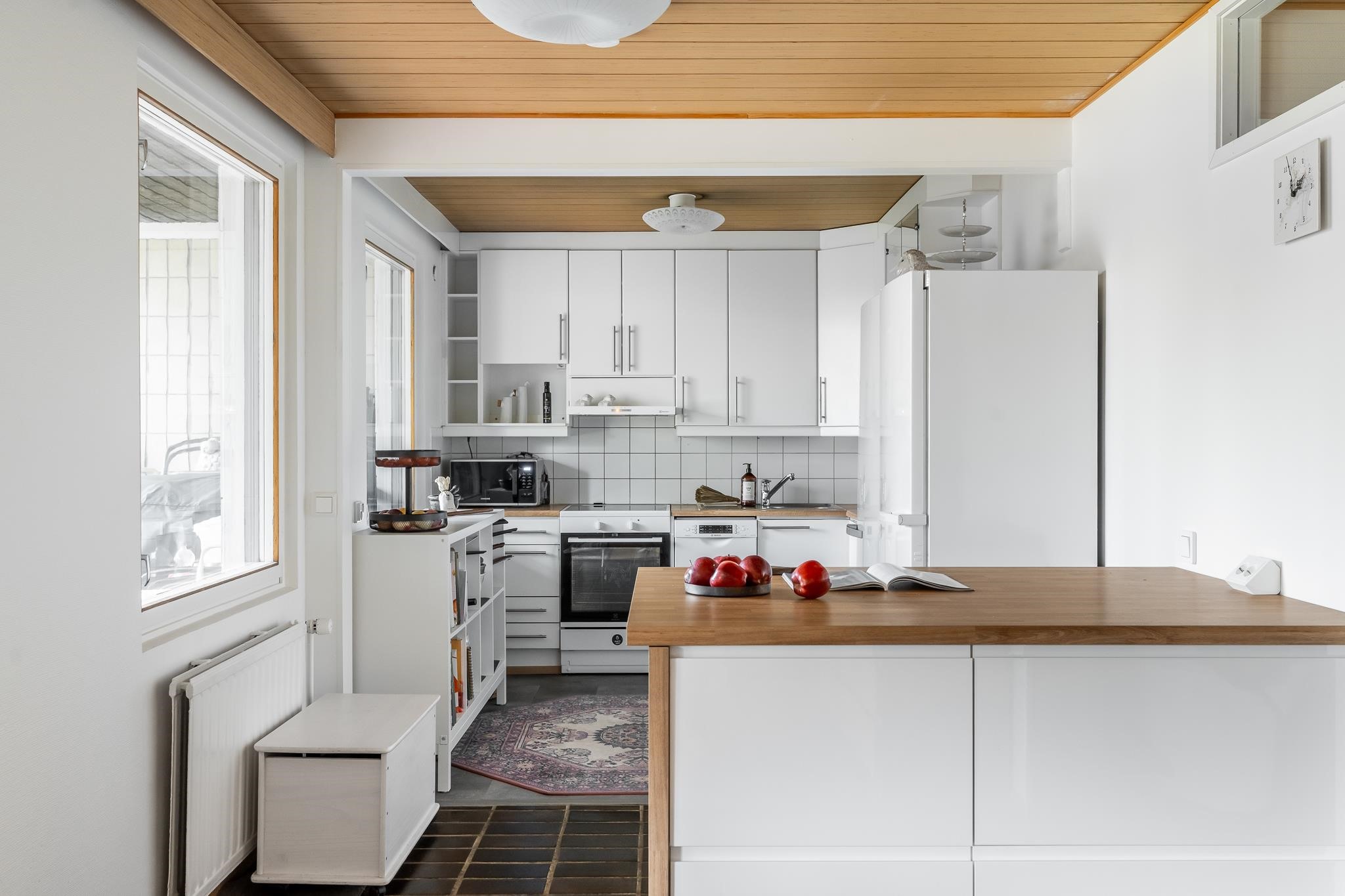 - Jääkaappi, pakastekaappi, induktioliesi, mikroaaltouuni, astianpesukone, kaapistot, kiinteät valaisimet. keittiön saareke v. 2025