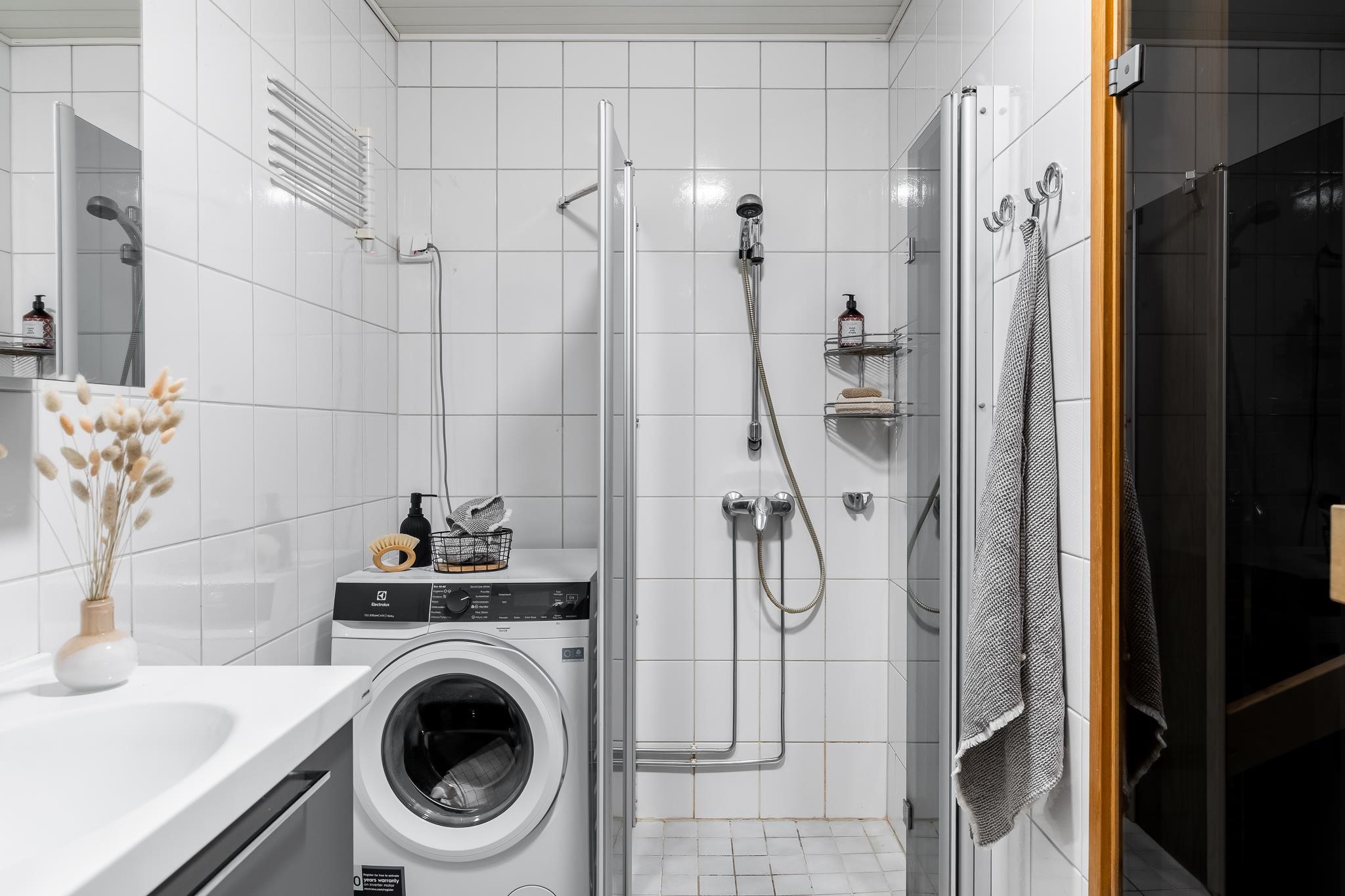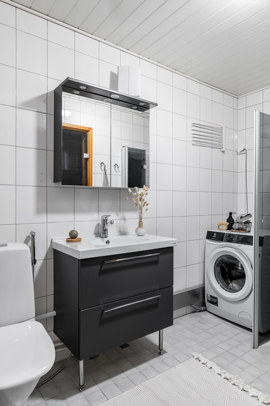 - Sauna, sähkökiuas pilarikiuas 2025, kylpyhuone, erillinen wc, suihku, peilikaappi kph + wc, allaskaappi kph + wc, pesukoneliitäntä, lattialämmitys kph:ssa, kiinteät valaisimet.