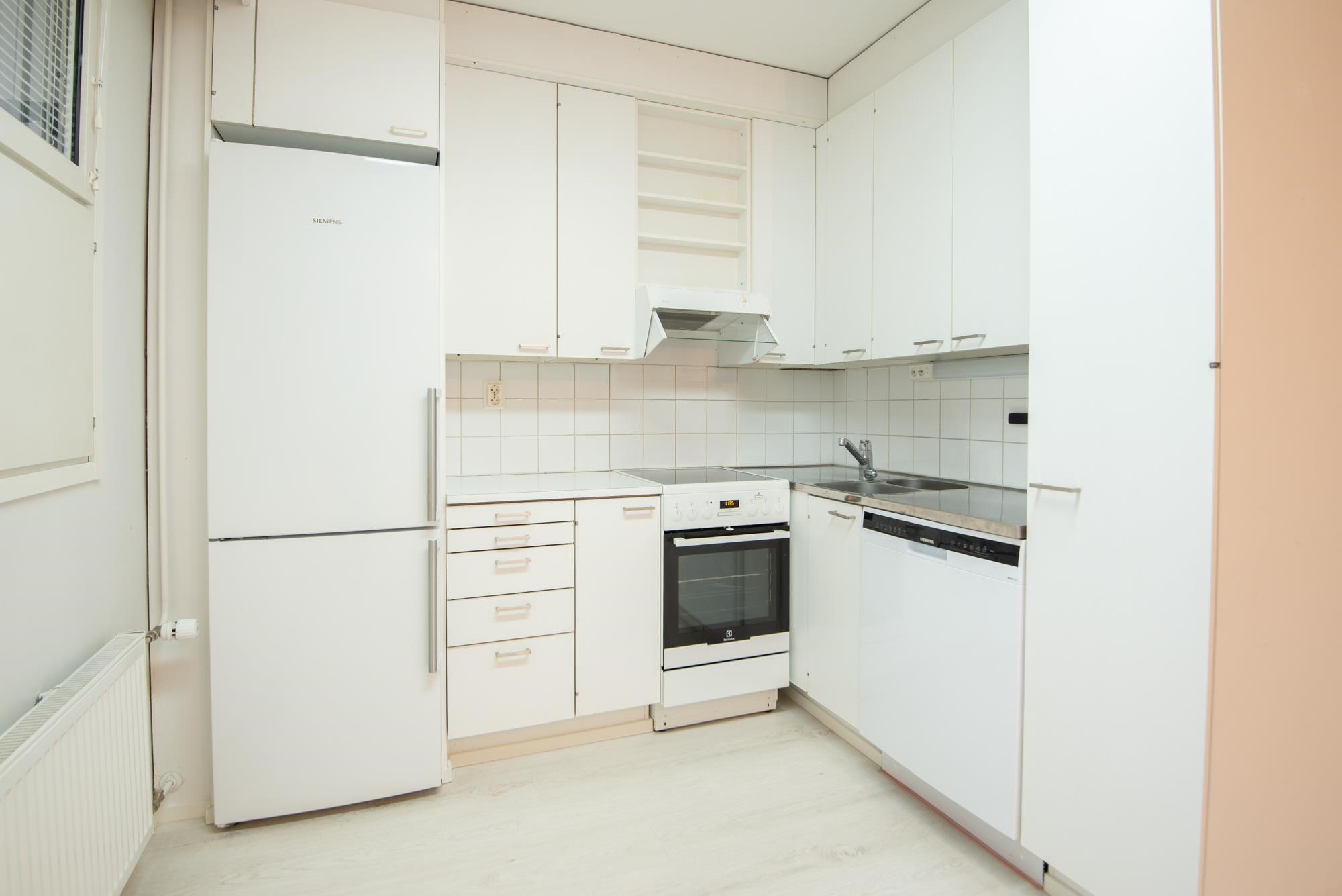 - Jääkaappipakastin, lattialiesi keraaminen, astianpesukone, kaapistot, kiinteät valaisimet.