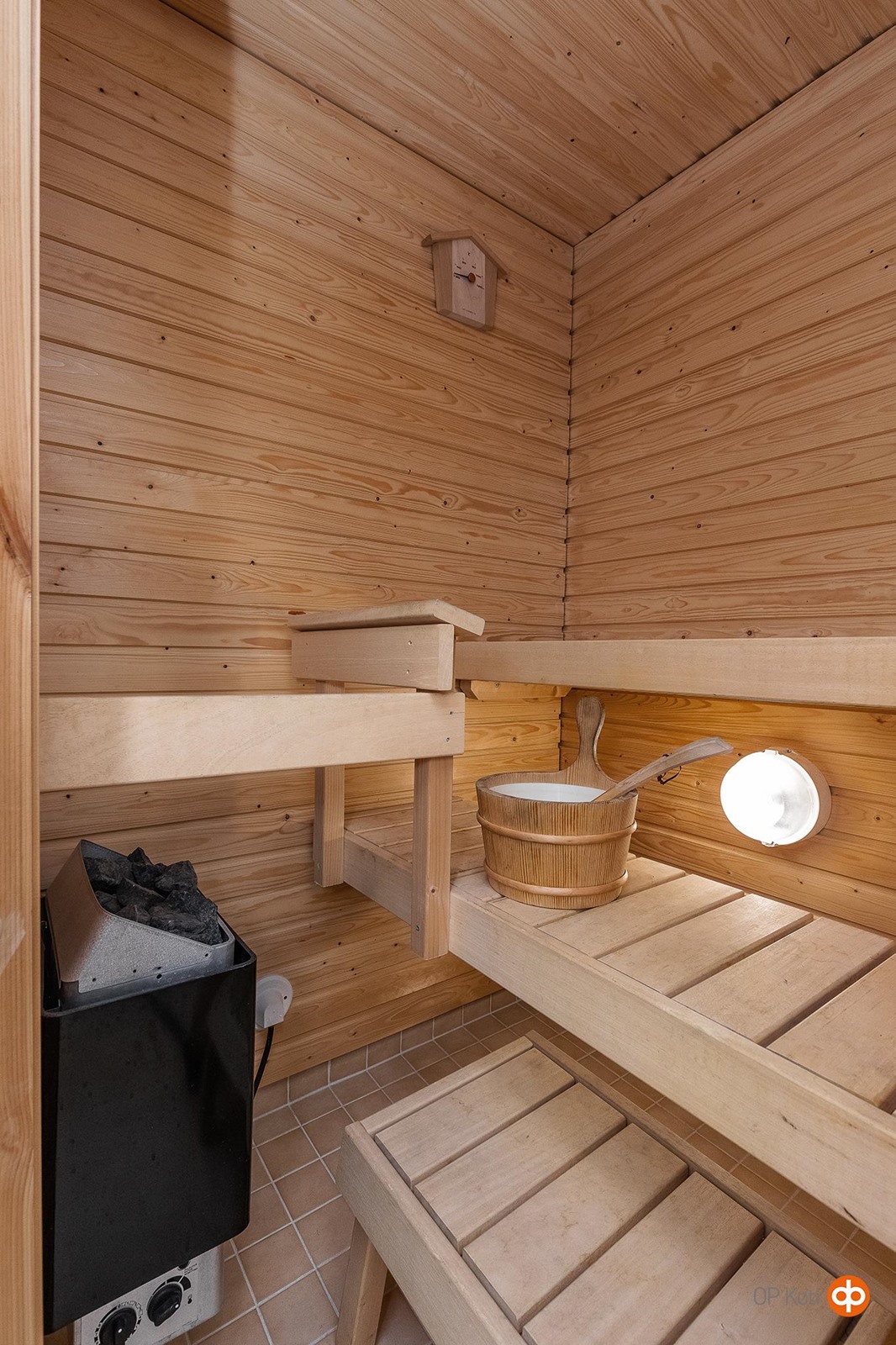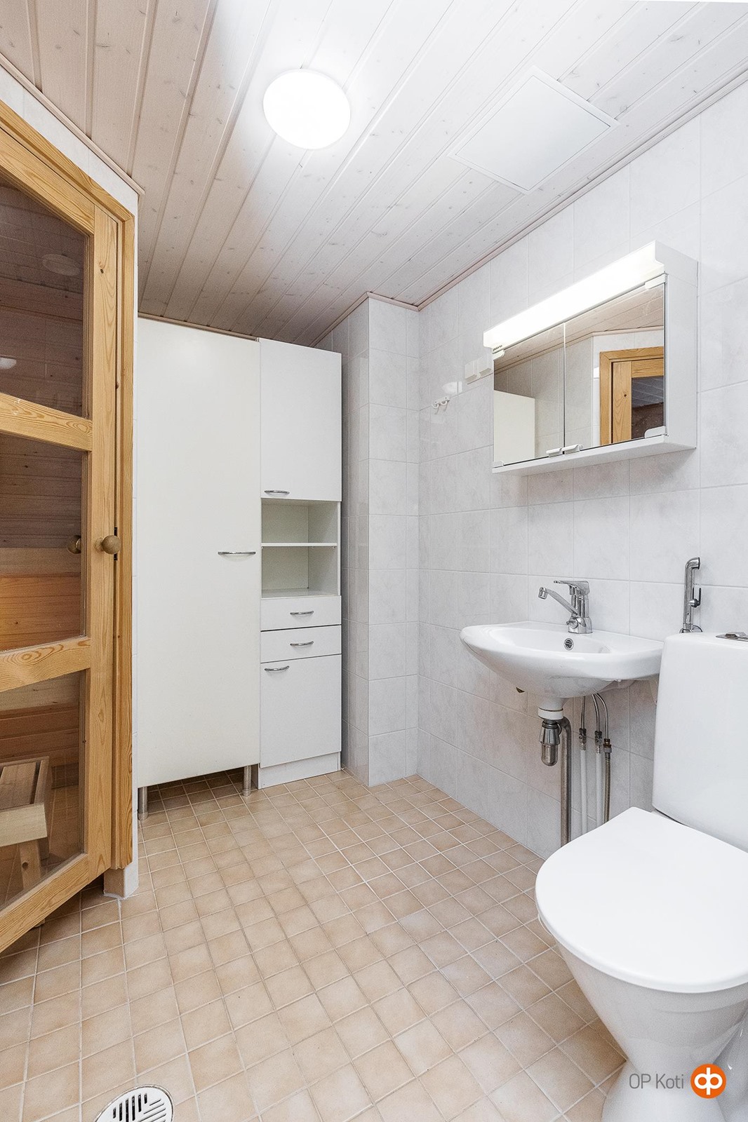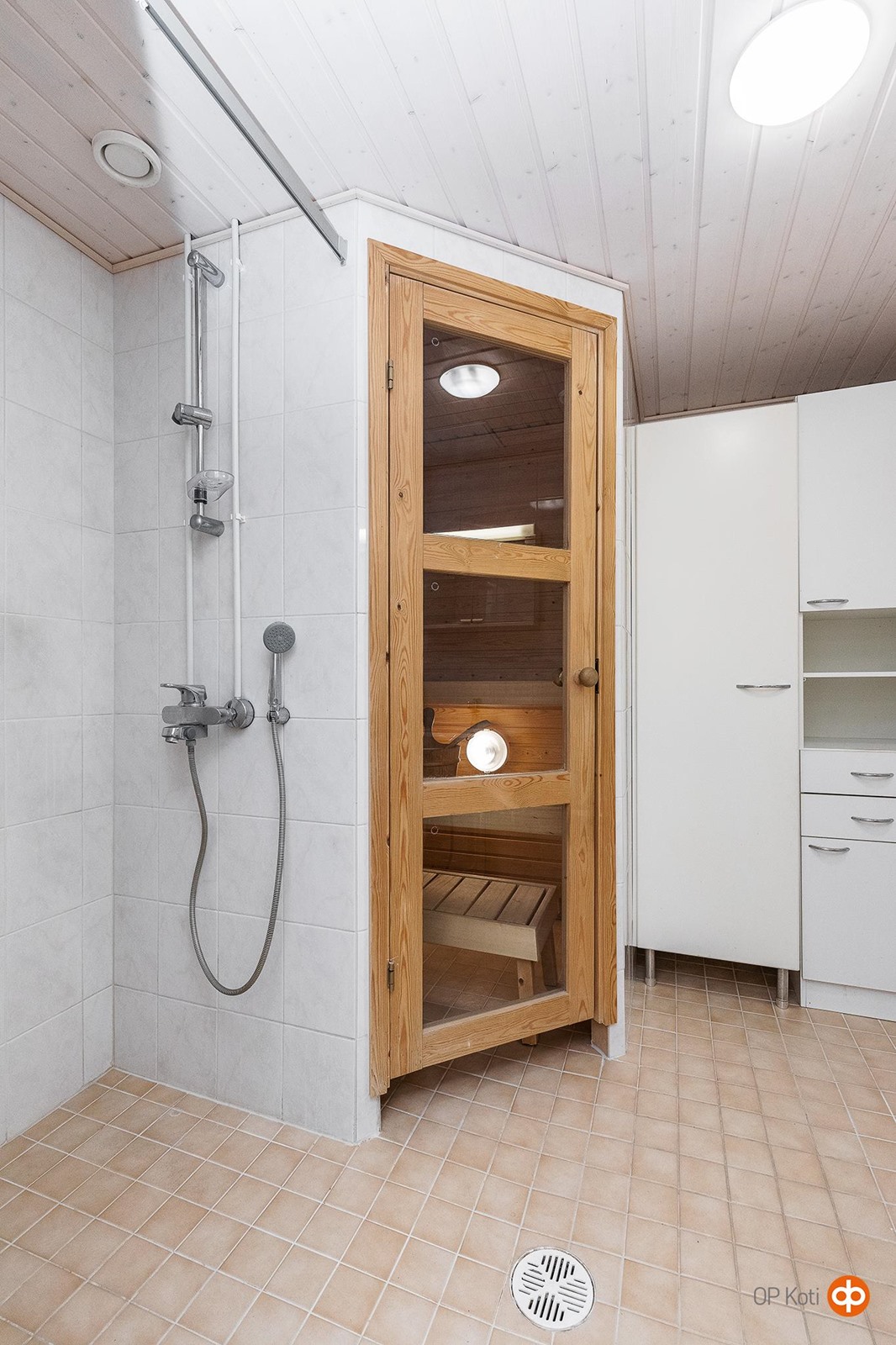 - Sauna, sähkökiuas, kylpyhuone, suihku, peilikaappi, kaapit kylpyhuone, 2 kpl, allaskaappi, pesukoneliitäntä kylpyhuone, lattialämmitys kylpyhuone, kiinteät valaisimet. Kauttaaltaan kaakeloitu tilavahko kylpyhuone lähes käyttämättömällä saunalla. Hyvä tila pesukoneelle ja kylpyhuonetarvikkeille, mm. 2 kpl kaapistoja. Kylpyhuoneessa sähkötoiminen lattialämmitys.
