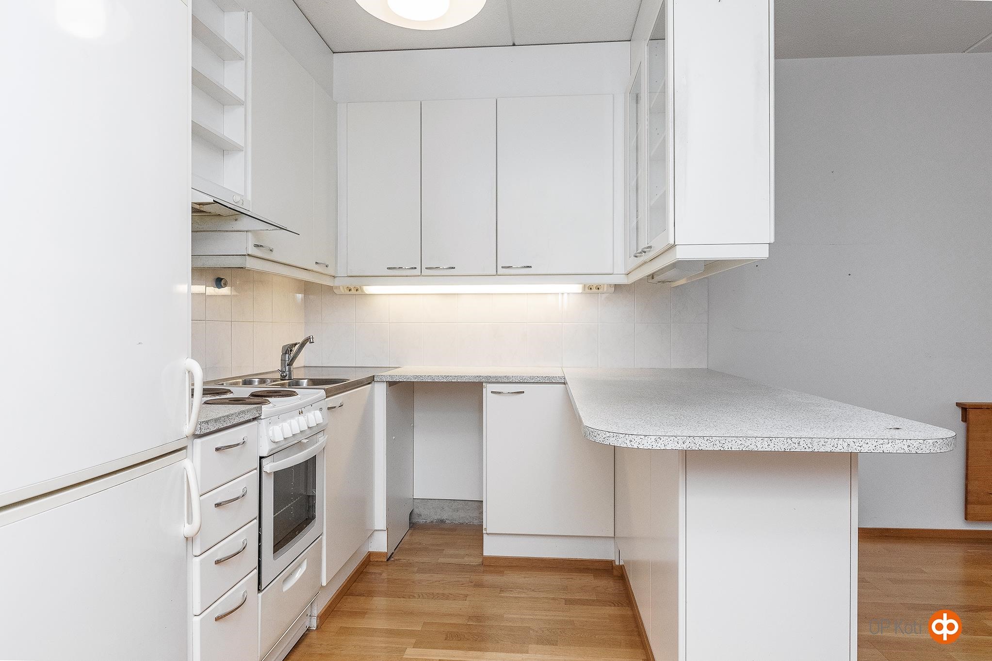- Jääkaappipakastin, sähköliesi, liesikupu, liesituuletin Talotuuletin, kaapistot, kiinteät valaisimet. Siistikuntoinen keittokomero, jossa mukavasti kaapistoja laskutilaa. Olohuoneessa paikka pienelle ruokapöydälle. Keittokomero onnistuneesti olohuoneen yhteydessä.