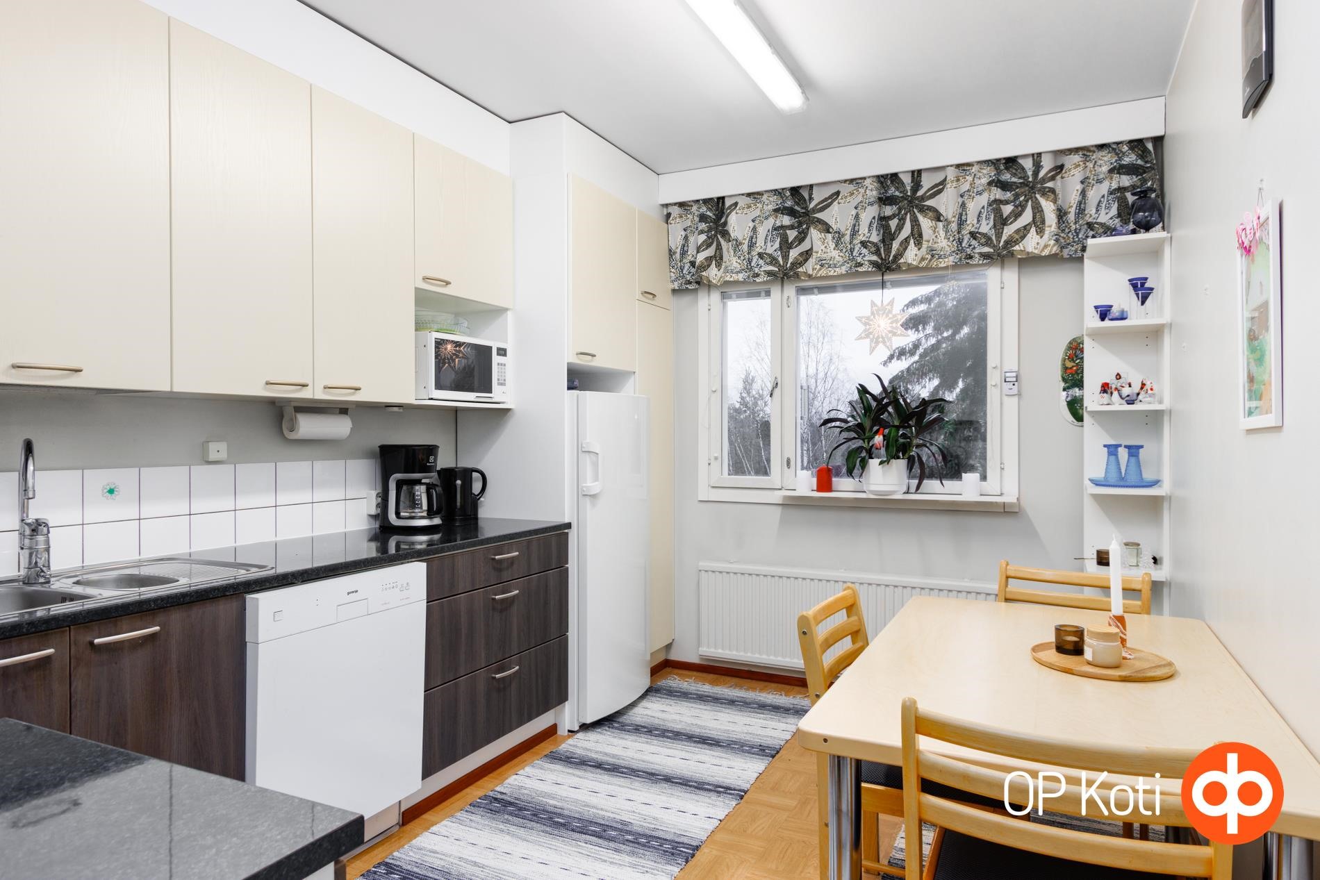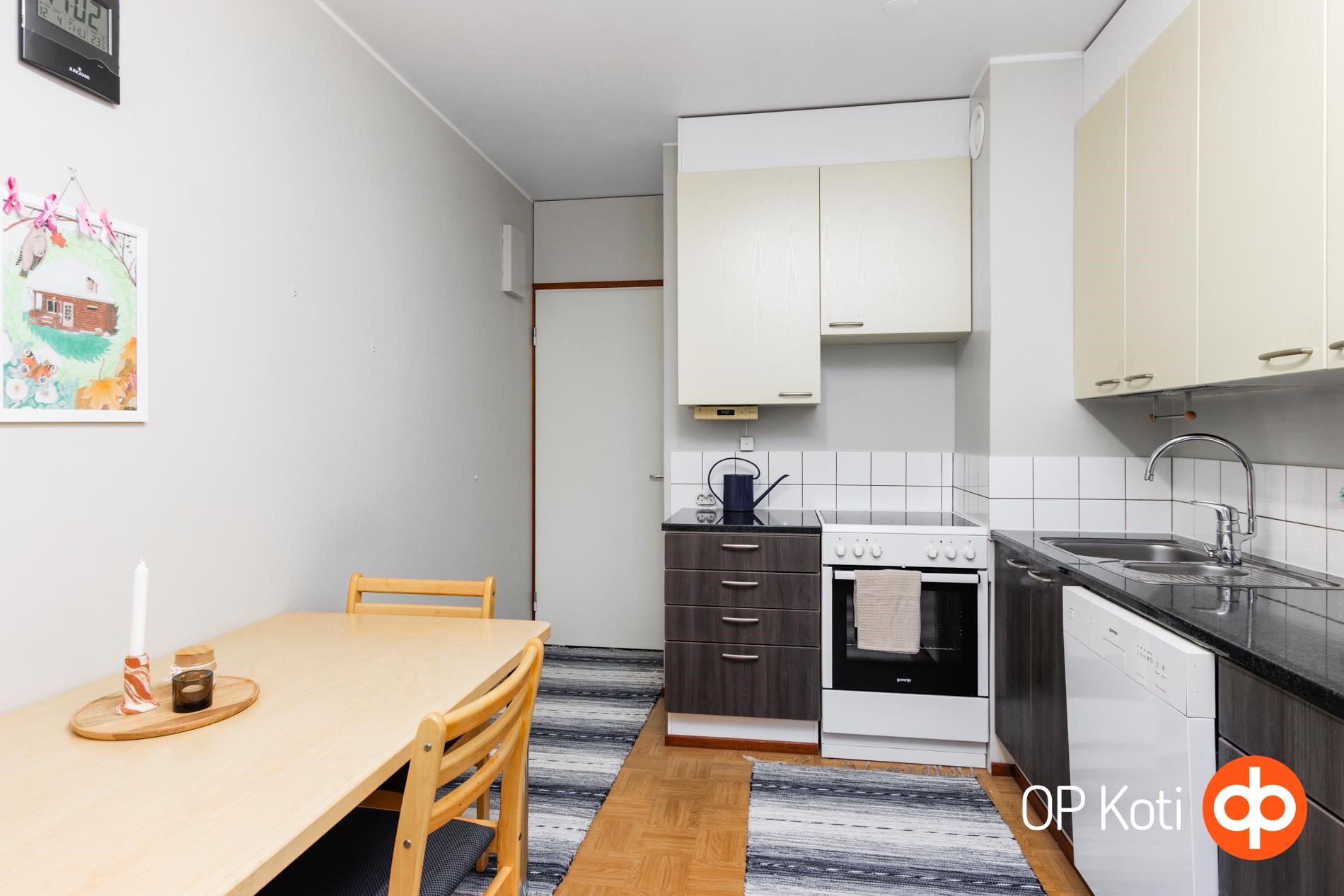 Keittiö on käytännöllinen ja tilava: sinne mahtuu reilun kokoinen ruokapöytä ja kaappi- sekä laskutilaa on runsaasti. Kylpyhuone on saneerattu lähivuosina ja tarjoaa erinomaiset puitteet arkeen: tilaan sopii hyvin myös pyykinpesukone.