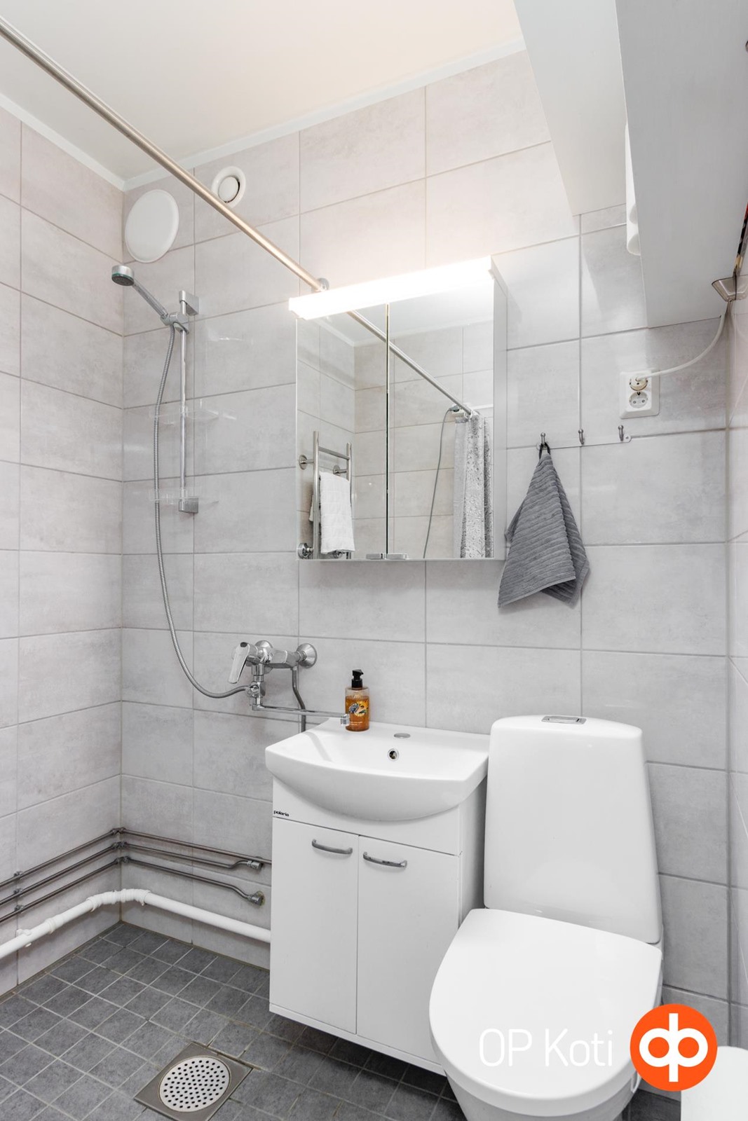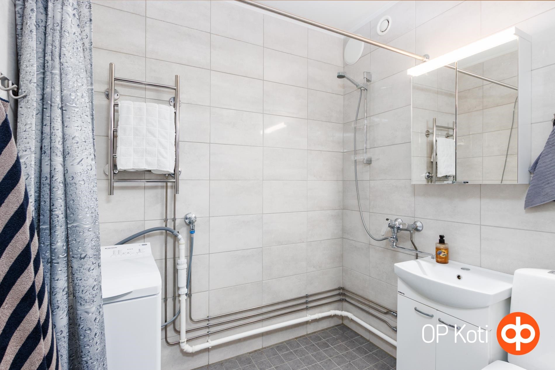- Kylpyhuone, suihku, peilikaappi, allaskaappi, pesukoneliitäntä, kiinteät valaisimet. Rättipatteri , Suihkuverho + tanko