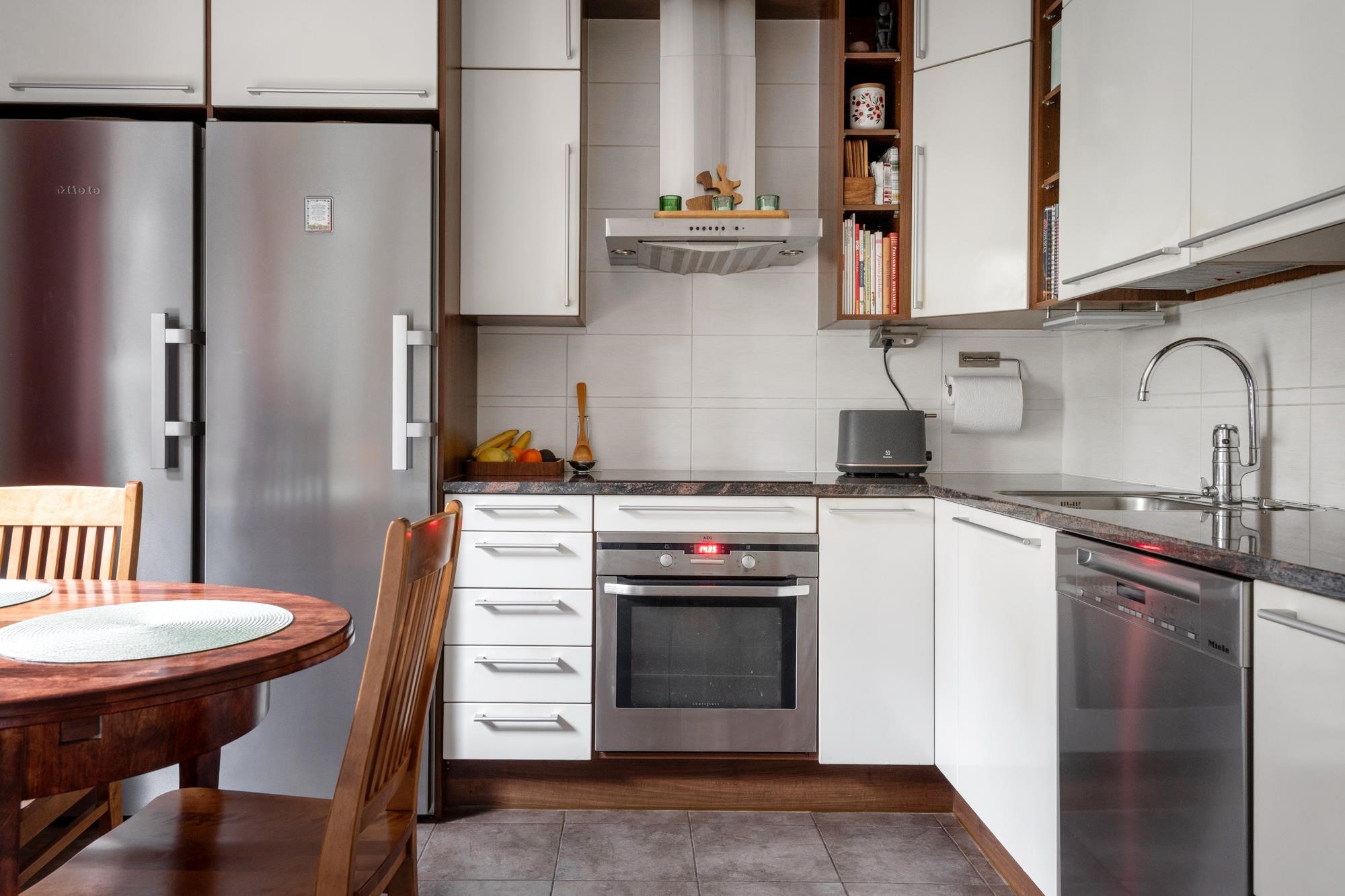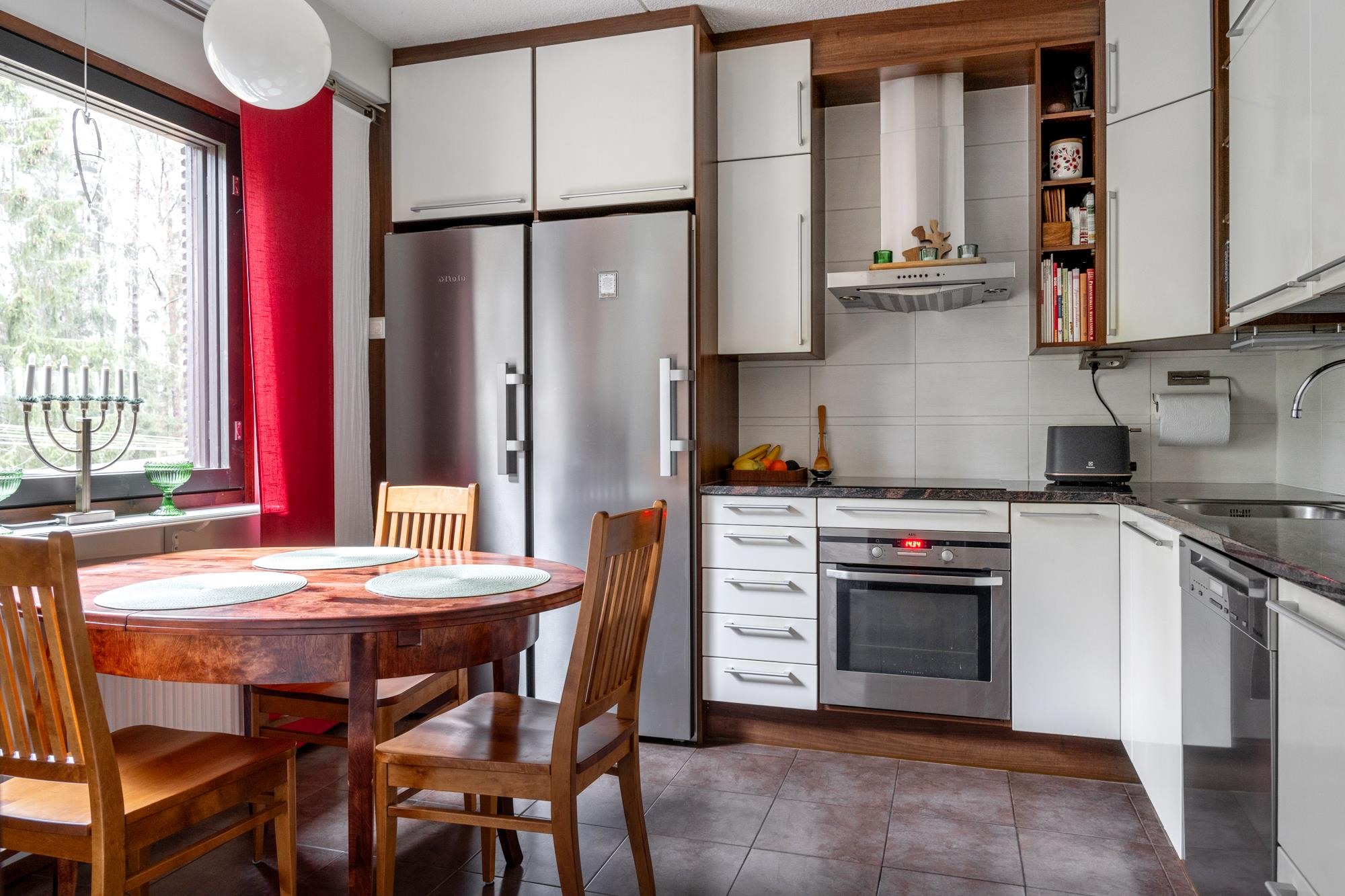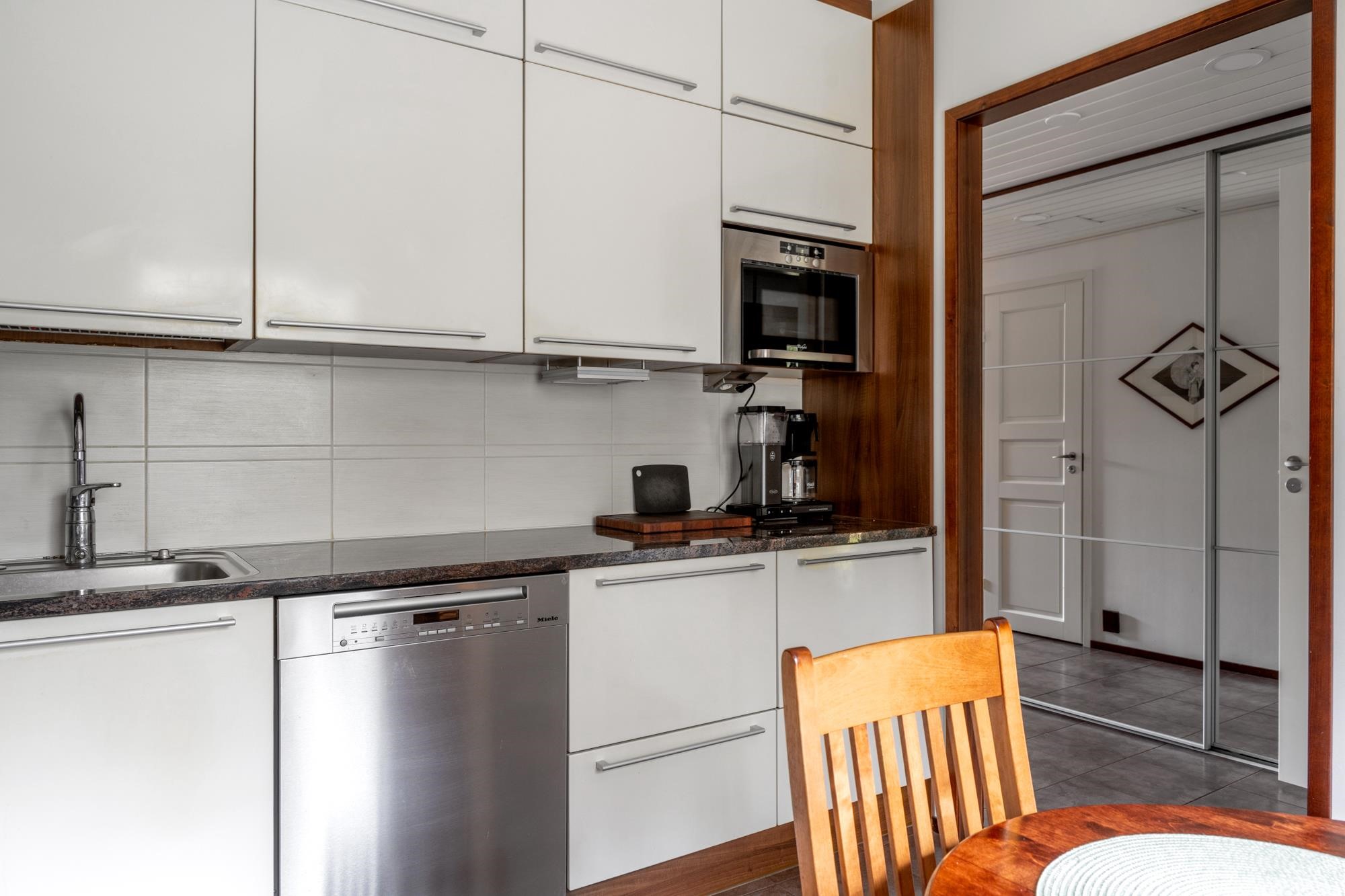 - Jääkaappi, pakastekaappi, erillisuuni kiertoilmauuni, induktioliesi, liesituuletin, mikroaaltouuni, astianpesukone, kaapistot, kiinteät valaisimet.