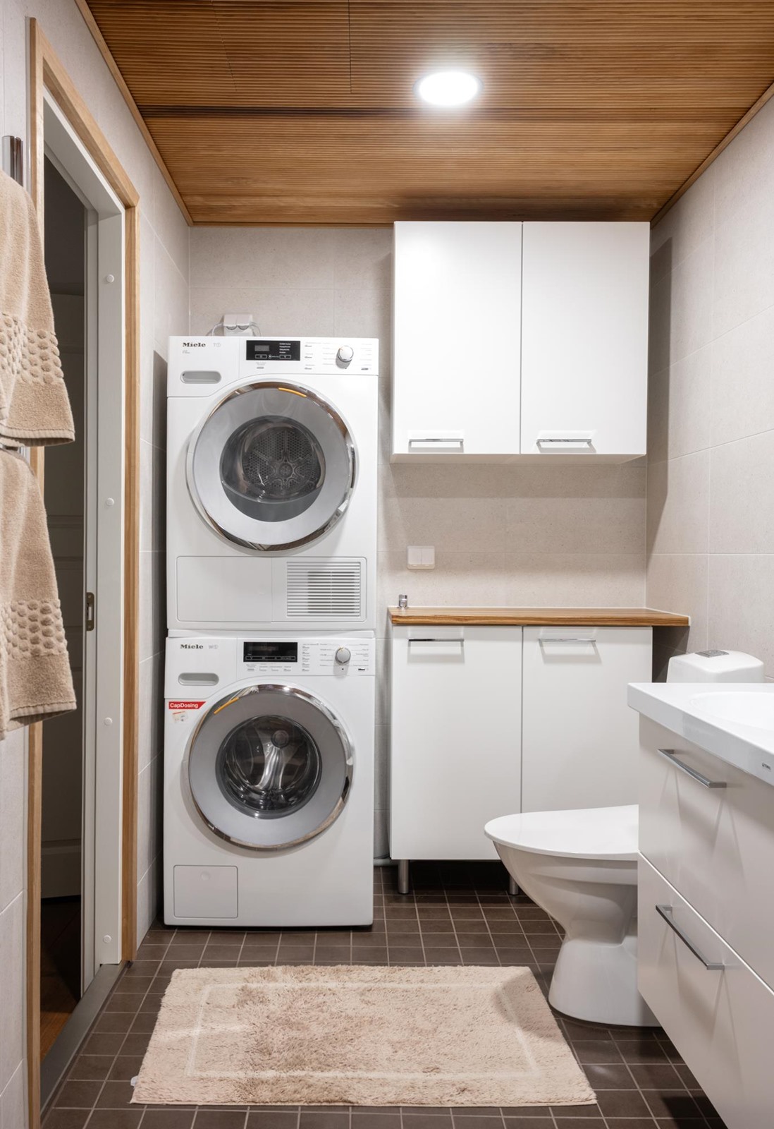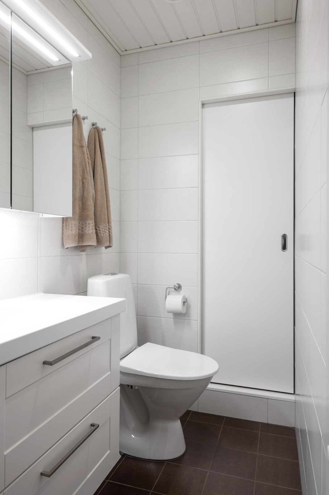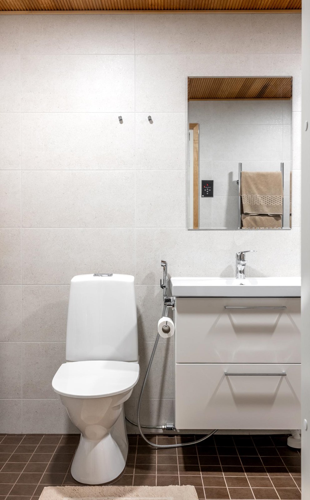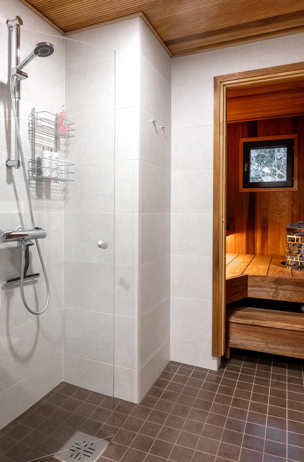 - Sauna, sähkökiuas, kylpyhuone, erillinen wc, suihku, suihkuseinä, peilit, allaskaappi, pesukoneliitäntä, lattialämmitys kylpyhuone, sähkökäyttöinen, kiinteät valaisimet. Pyyhekuivain sähkölämmitteinen