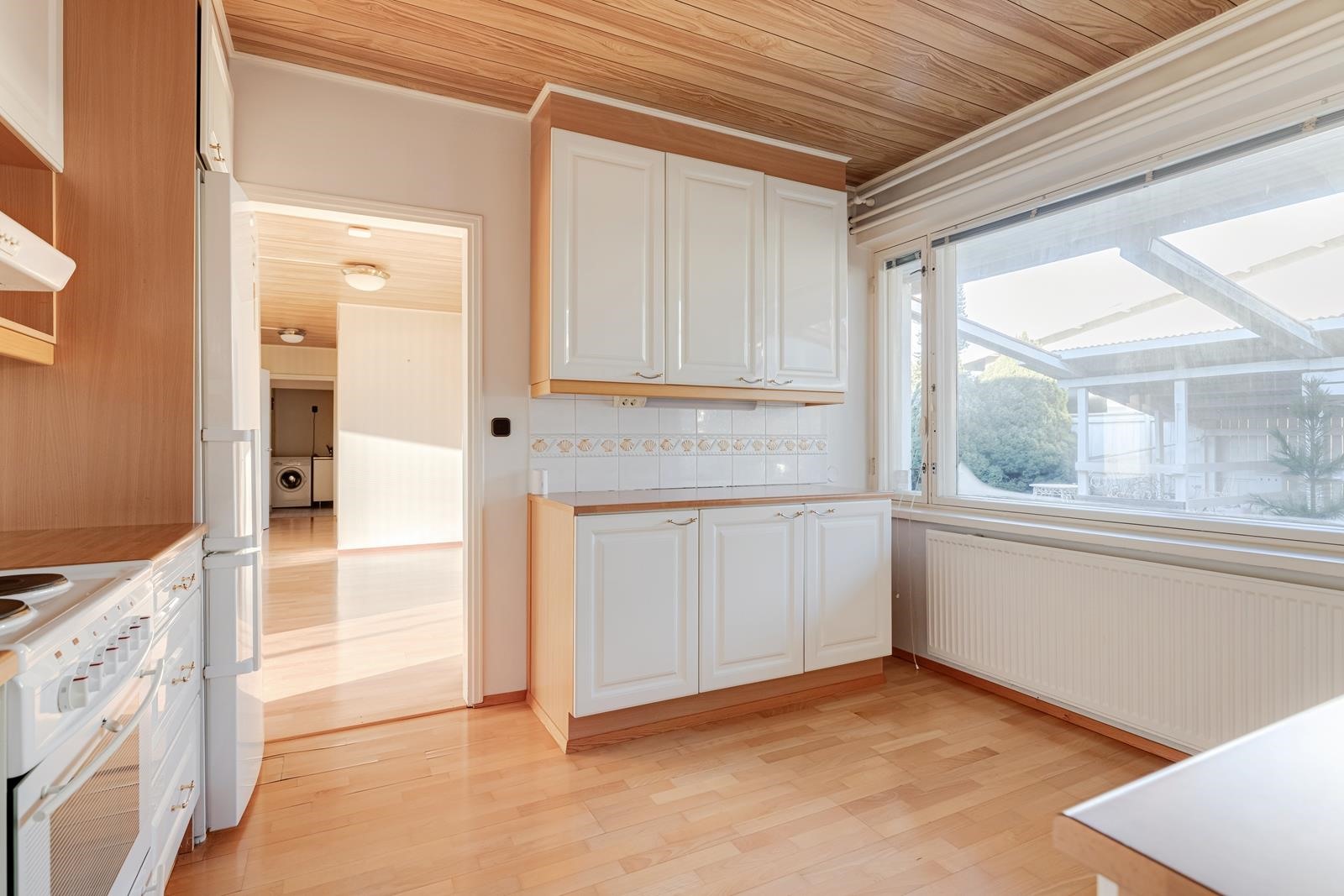 Asunnossa on 136 m² jaettuna neljään huoneeseen, keittiöön, ruokailutilaan, wc:hen, saunaan ja kodinhoitohuoneeseen. Parkettilattiat ja siistit pinnat luovat kodikkaan tunnelman. Asunnossa on vaatehuone, antennijärjestelmä ja ilmalämpöpumppu.
