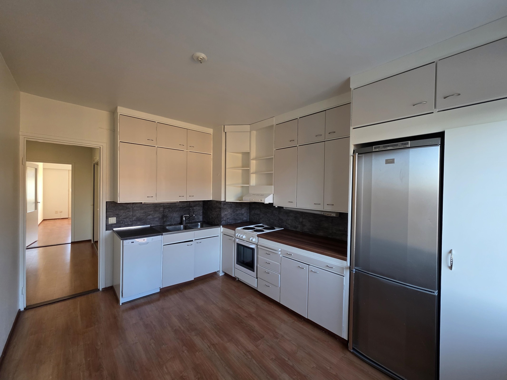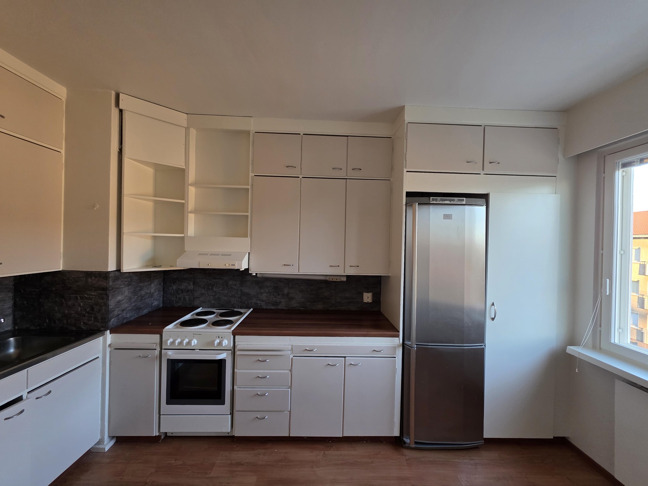 - Jääkaappipakastin, lattialiesi, liesituuletin, astianpesukone, kaapistot, kiinteät valaisimet.