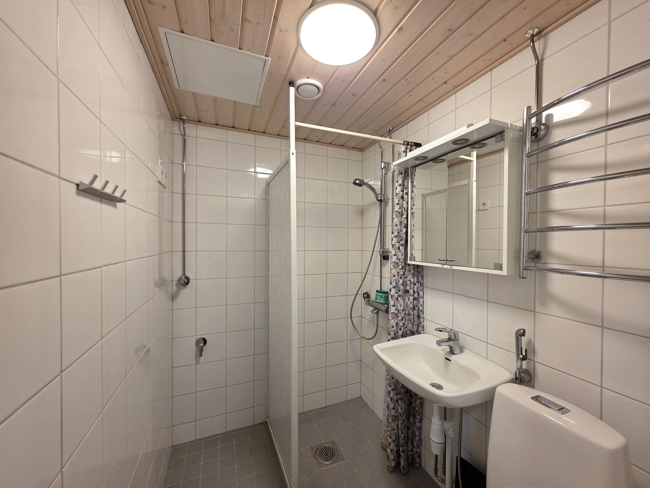 - Suihku, suihkuseinä, peilikaappi, pesukoneliitäntä, lattialämmitys, kiinteät valaisimet.
