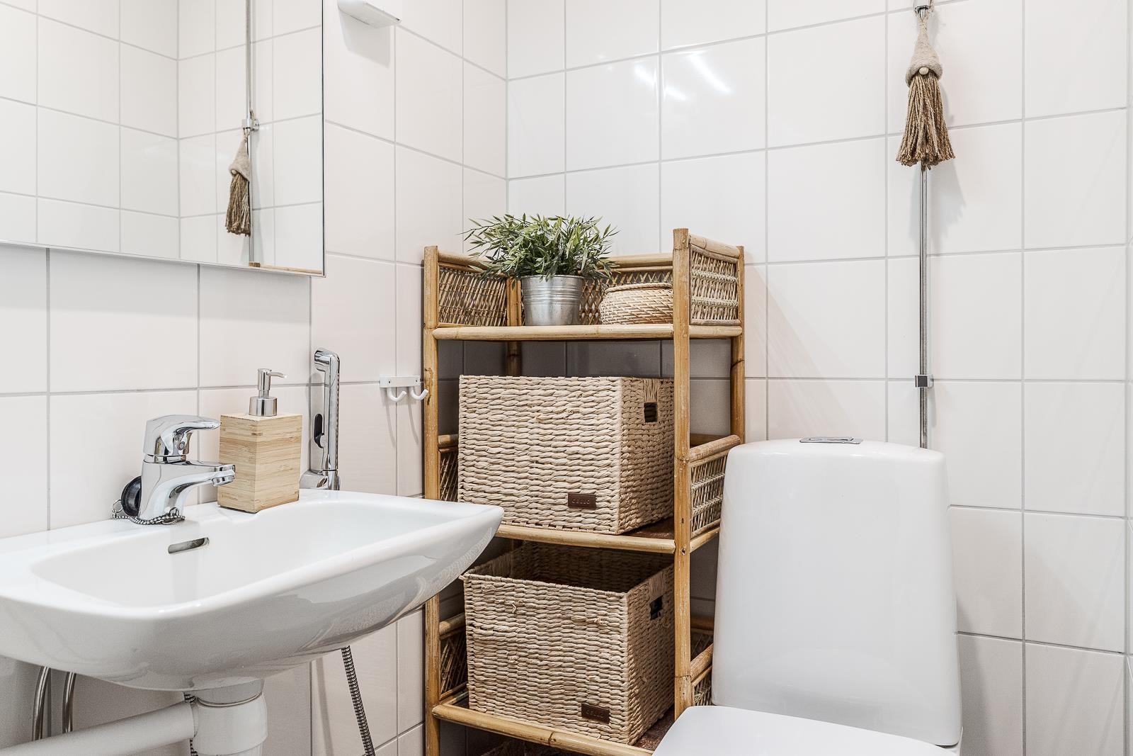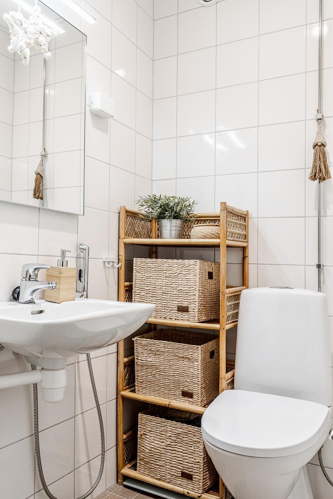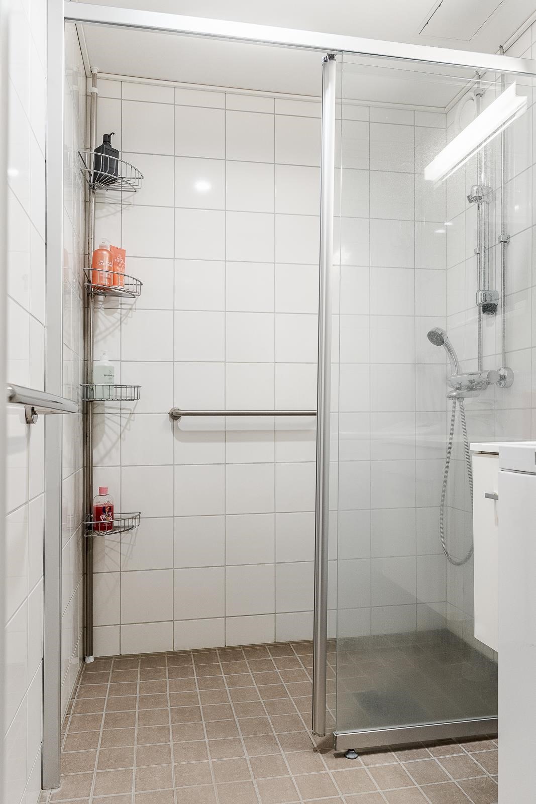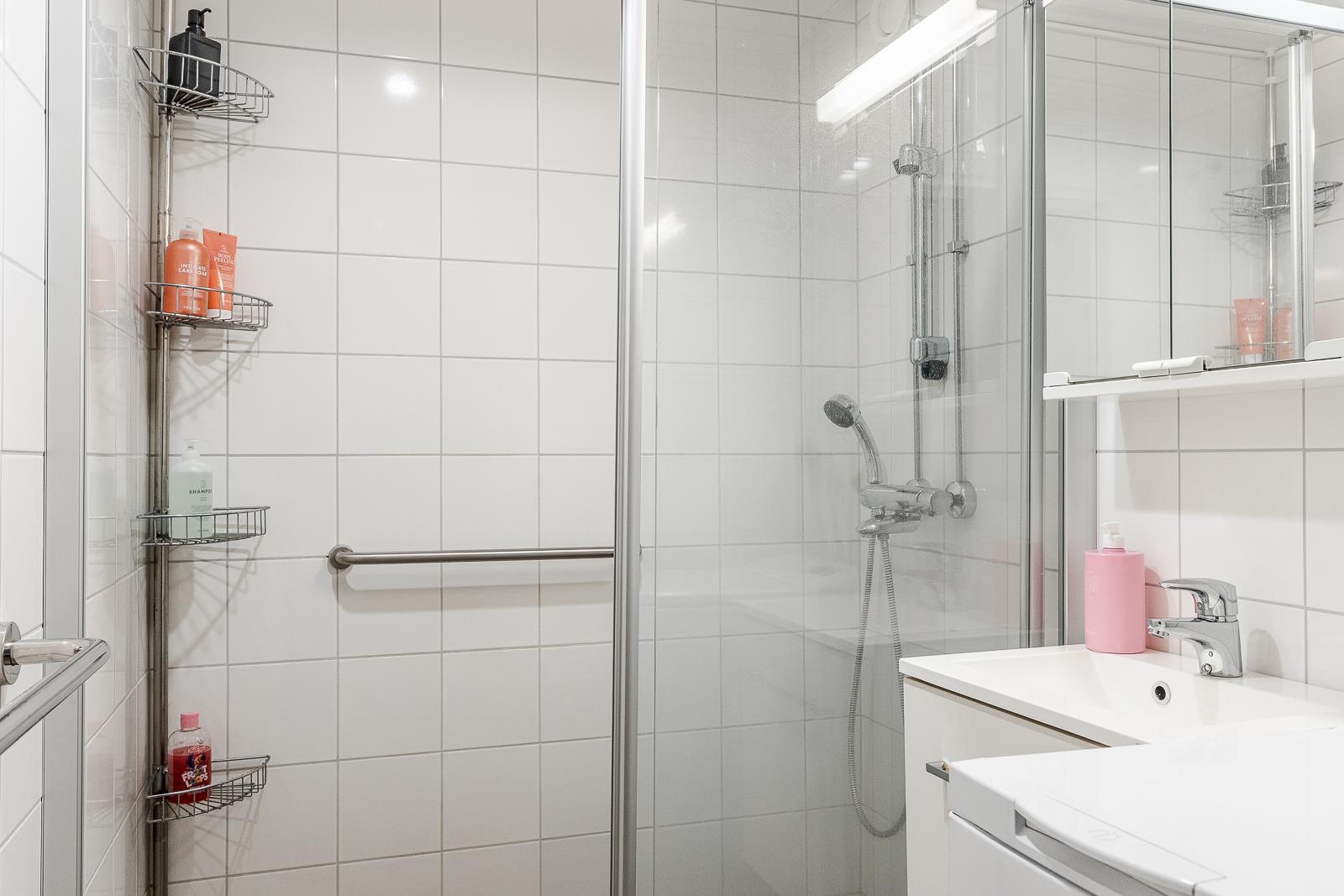 - Kylpyhuone, erillinen wc, suihku, suihkuseinä, peilit, peilikaappi, allaskaappi, pesukoneliitäntä, lattialämmitys, kiinteät valaisimet.