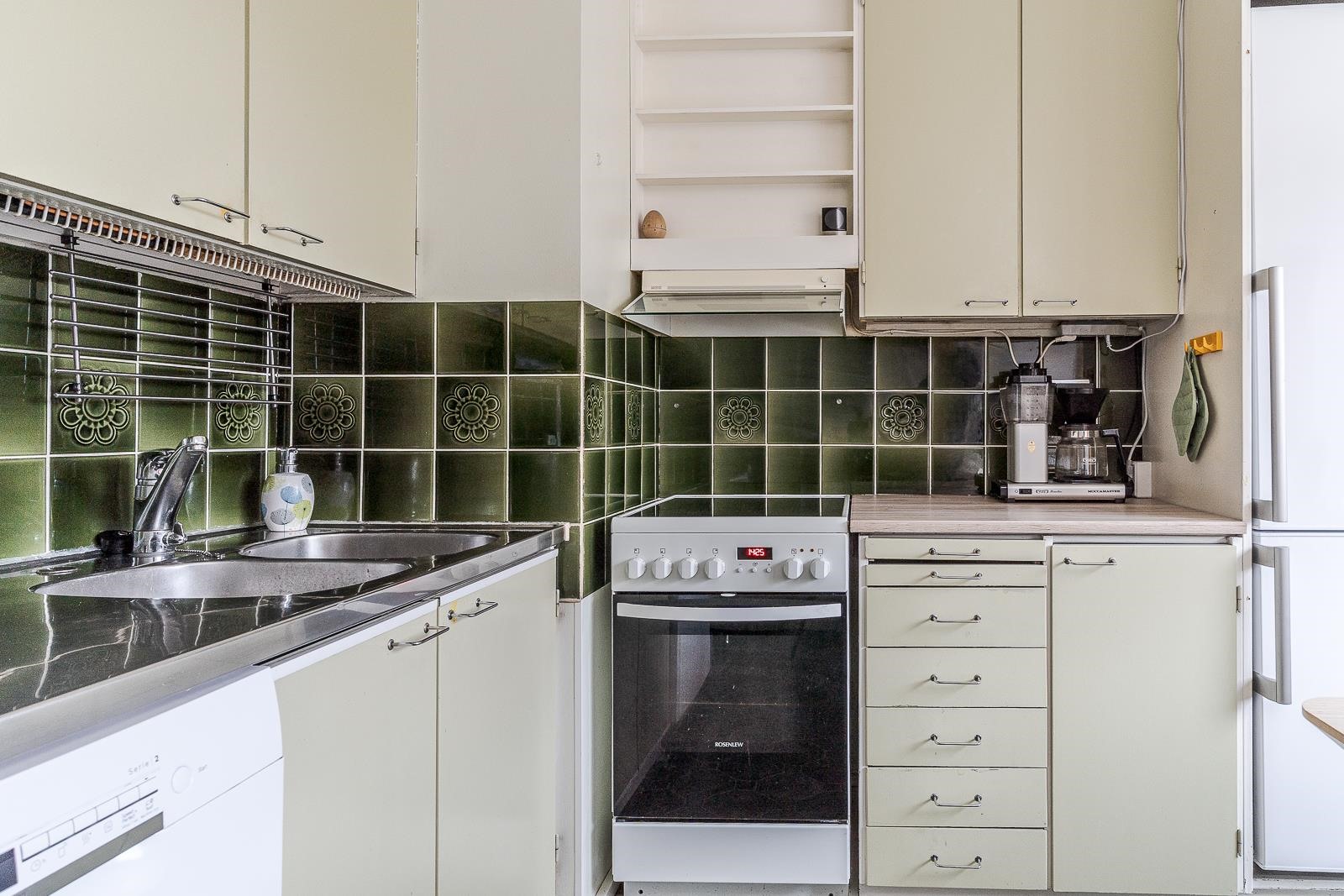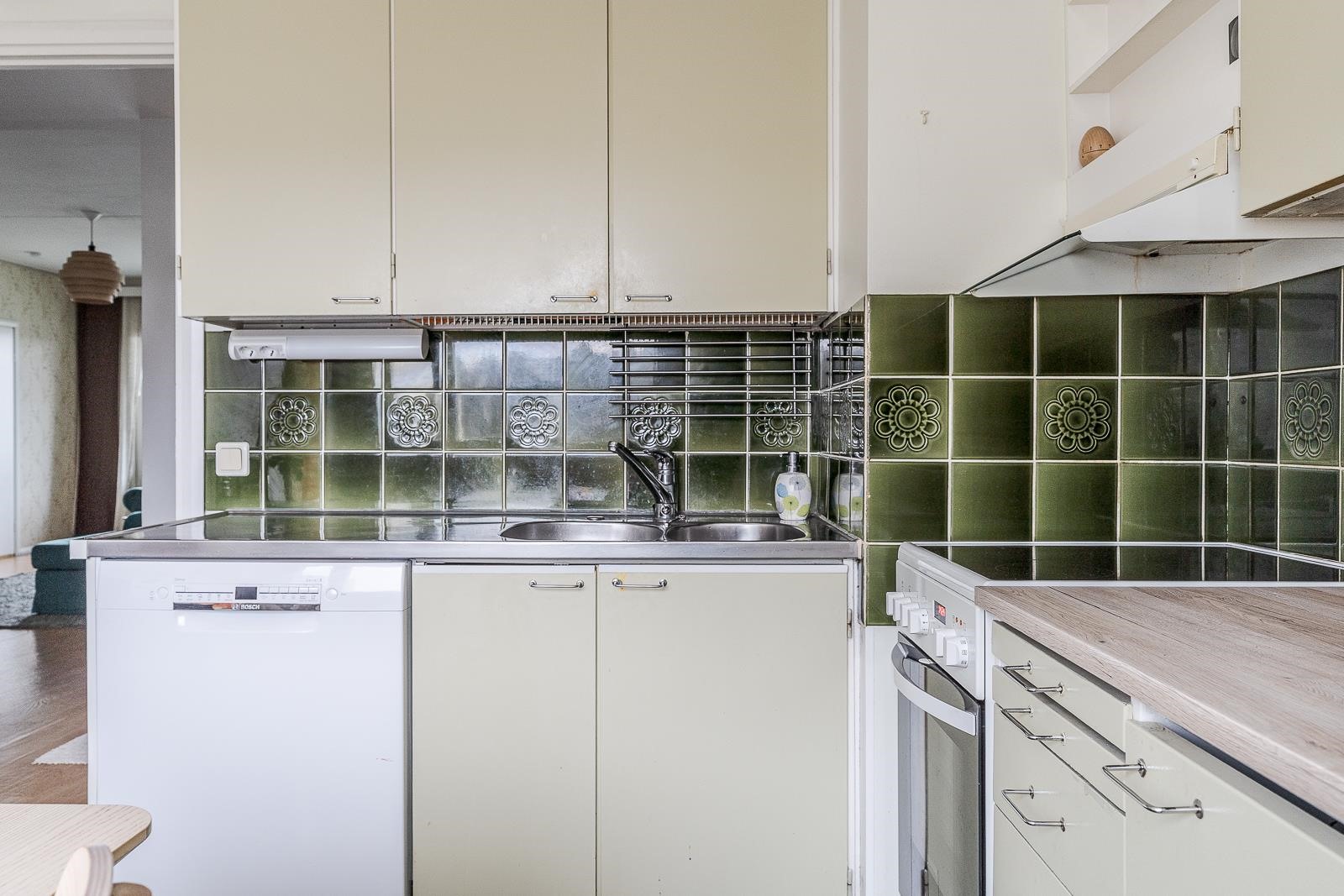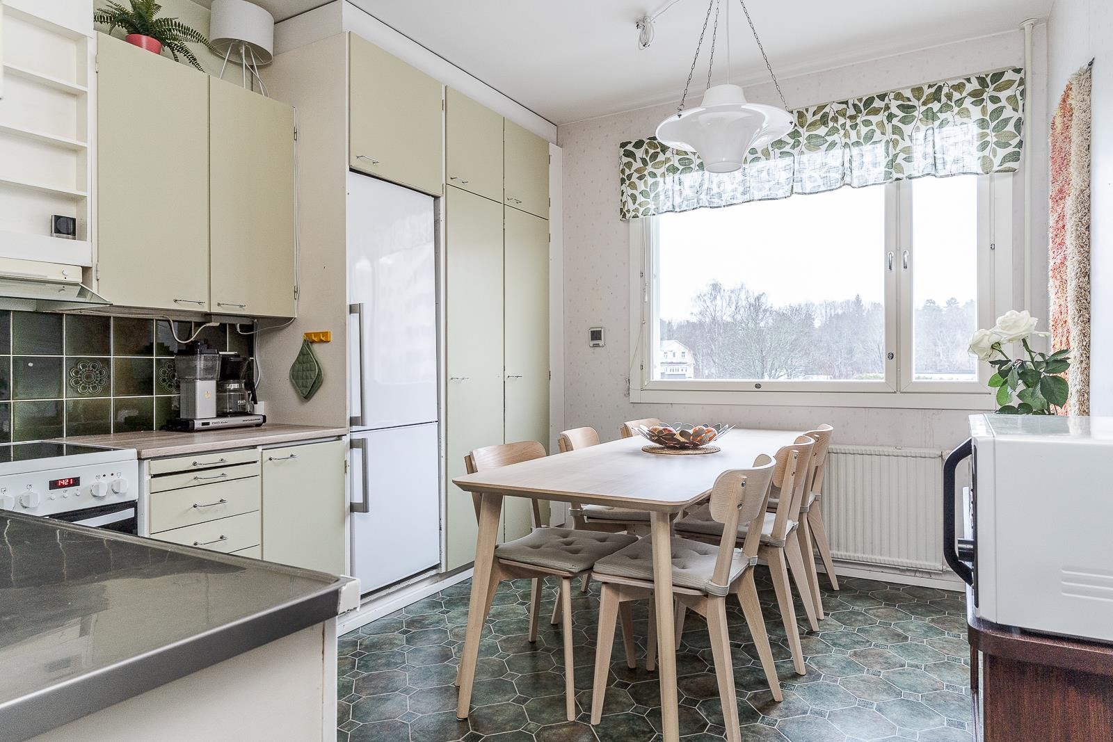 - Jääkaappipakastin, keraaminen liesi, liesituuletin, astianpesukone, kaapistot, kiinteät valaisimet.