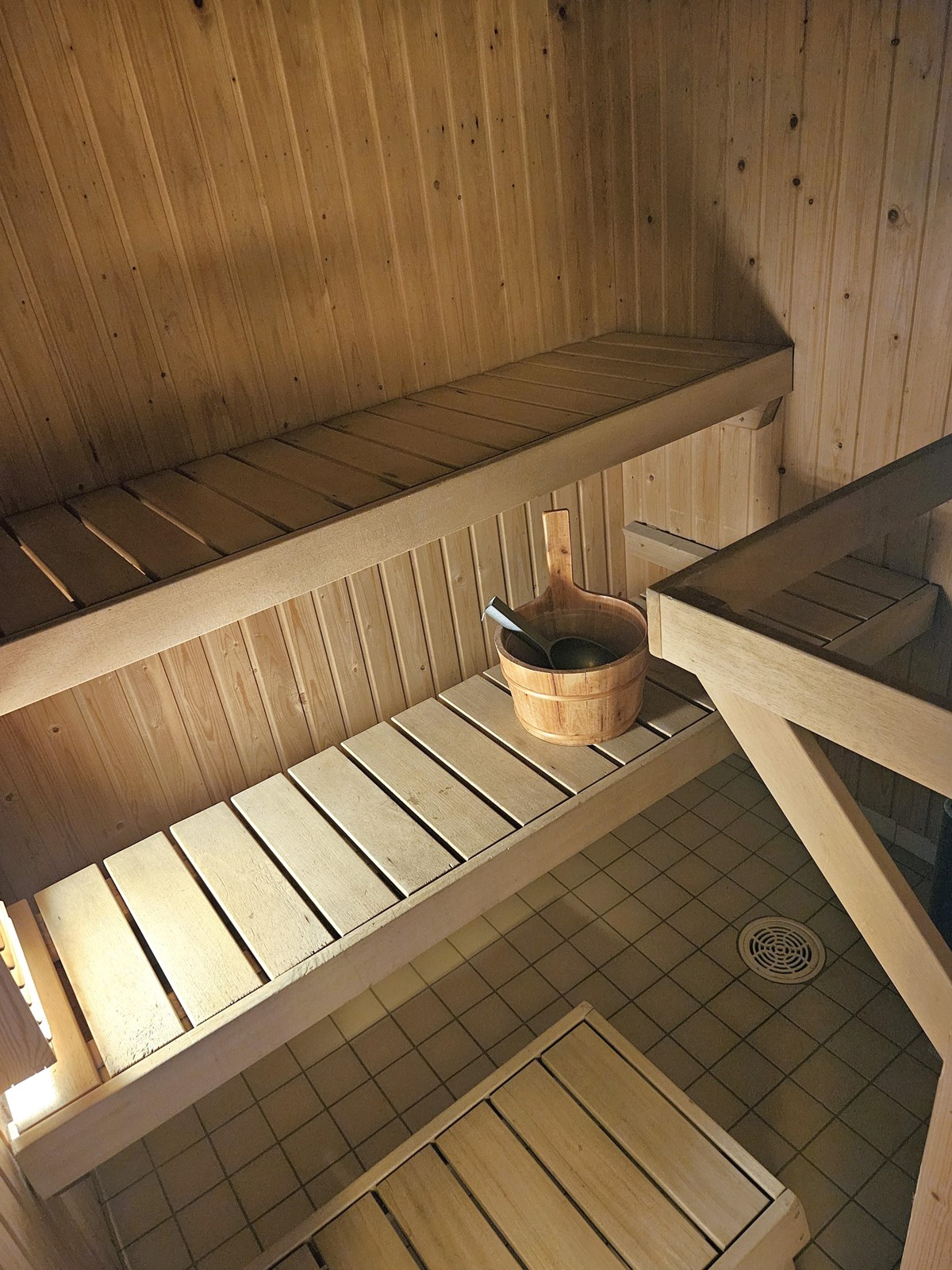 - Kylpyhuone alkuperäiskuntoinen, jossa wc-istuin, pesuallas, bidee, peilikaappi ja pesukoneliitäntä. Saunassa sähkökias.