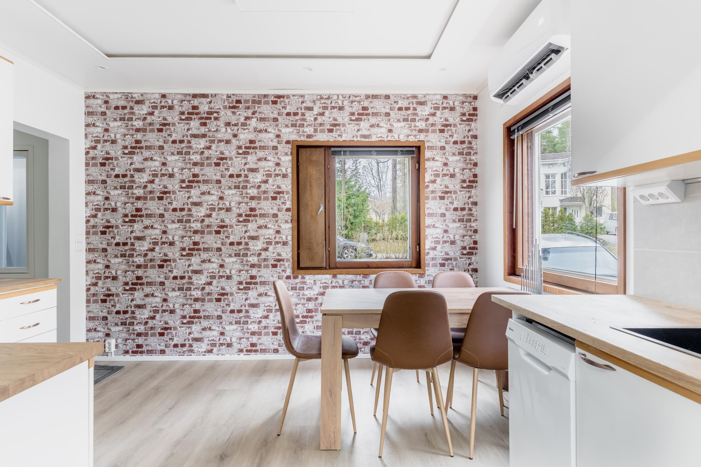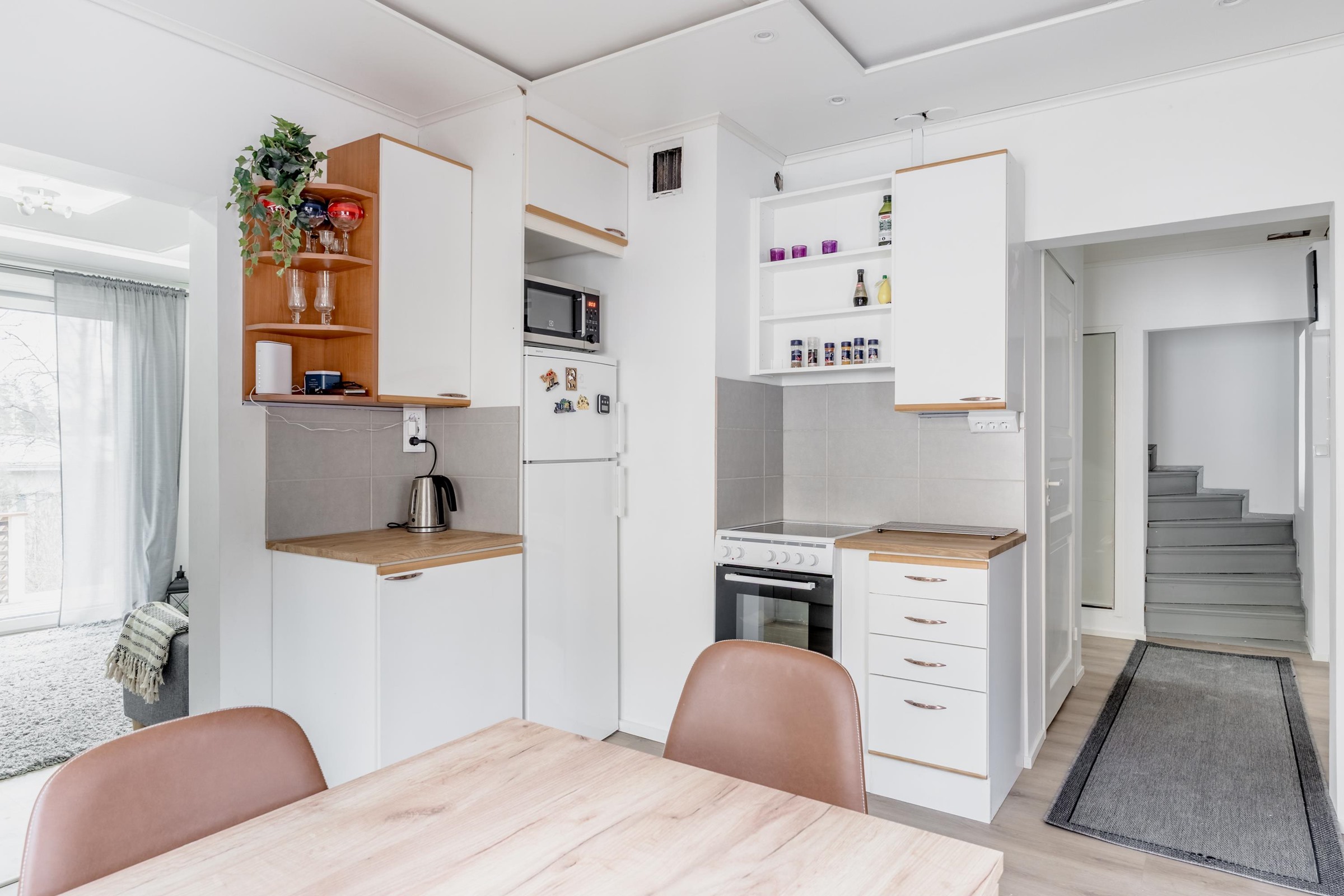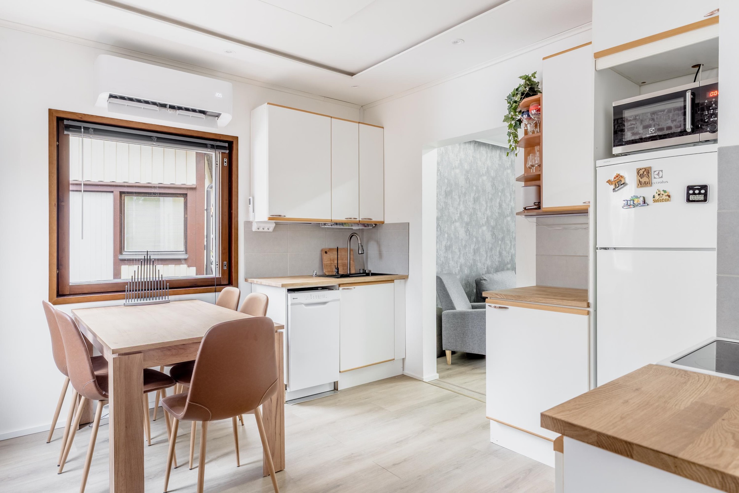 - Jenkkikaappi, keraaminen liesi, liesituuletin hormiin, astianpesukone, kaapistot, kiinteät valaisimet, pöytätasojen materiaali laminaatti.