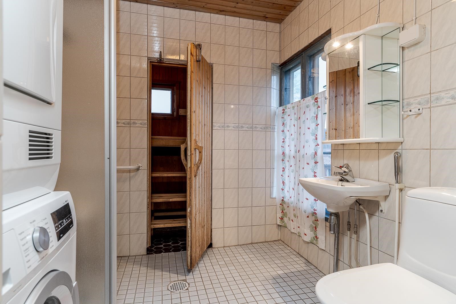 - Sauna sisä ja ulkosauna, sähkökiuas, puukiuas, kylpyhuone, erillinen wc myös suihkutila, sähköinen lattialämmitys, suihku 2 kpl, peilit, peilikaappi, pesukoneliitäntä, lattialämmitys pesuhuoneessa vesikiertoinen, kiinteät valaisimet.