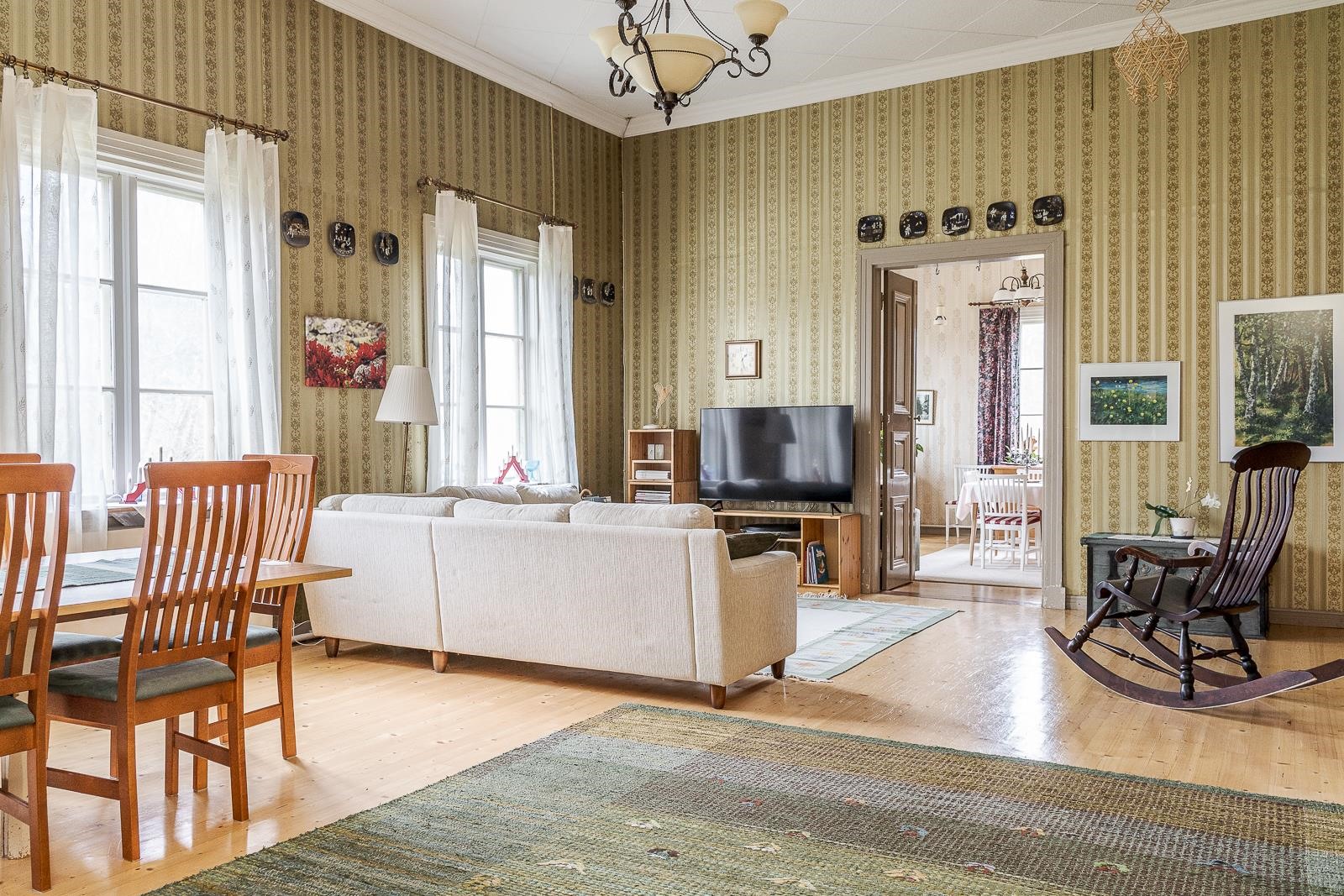 Keittiö: puulattia. Olohuone: puulattia, seinät tapetoitu. Makuuhuone 1: puulattia, seinät tapetoitu. Makuuhuone 2: puulattia, seinät tapetoitu. Makuuhuone 3: puulattia, seinät tapetoitu. Sauna: lattia laatta, seinät paneloitu. Kylpyhuone: lattia ja seinät laatoitettu, toisessa muovimatto ja muovitapetti. Huone 4: puulattia. Huone 5: lattia muovimatto.