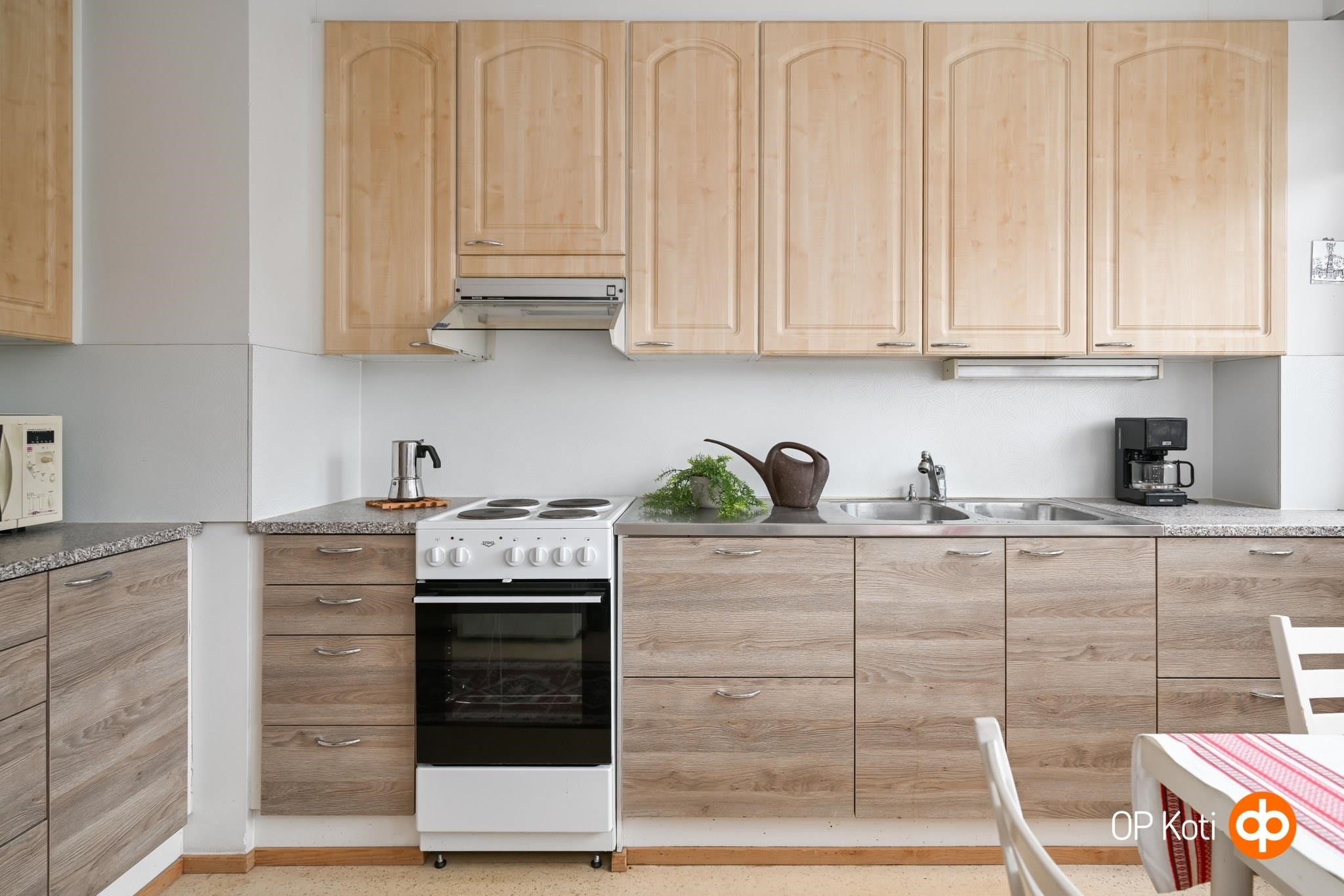 - Jääkaappipakastin, sähköliesi, liesikupu, kaapistot, kiinteät valaisimet.