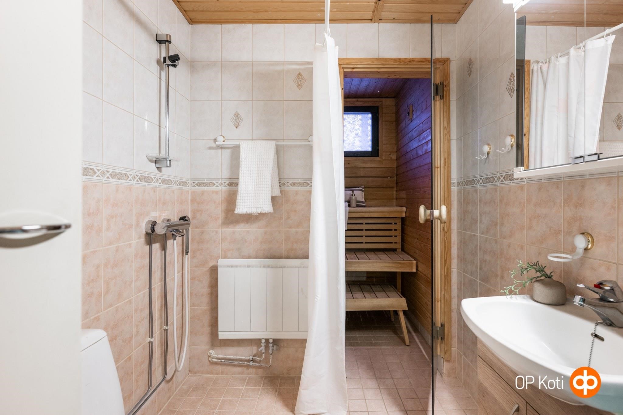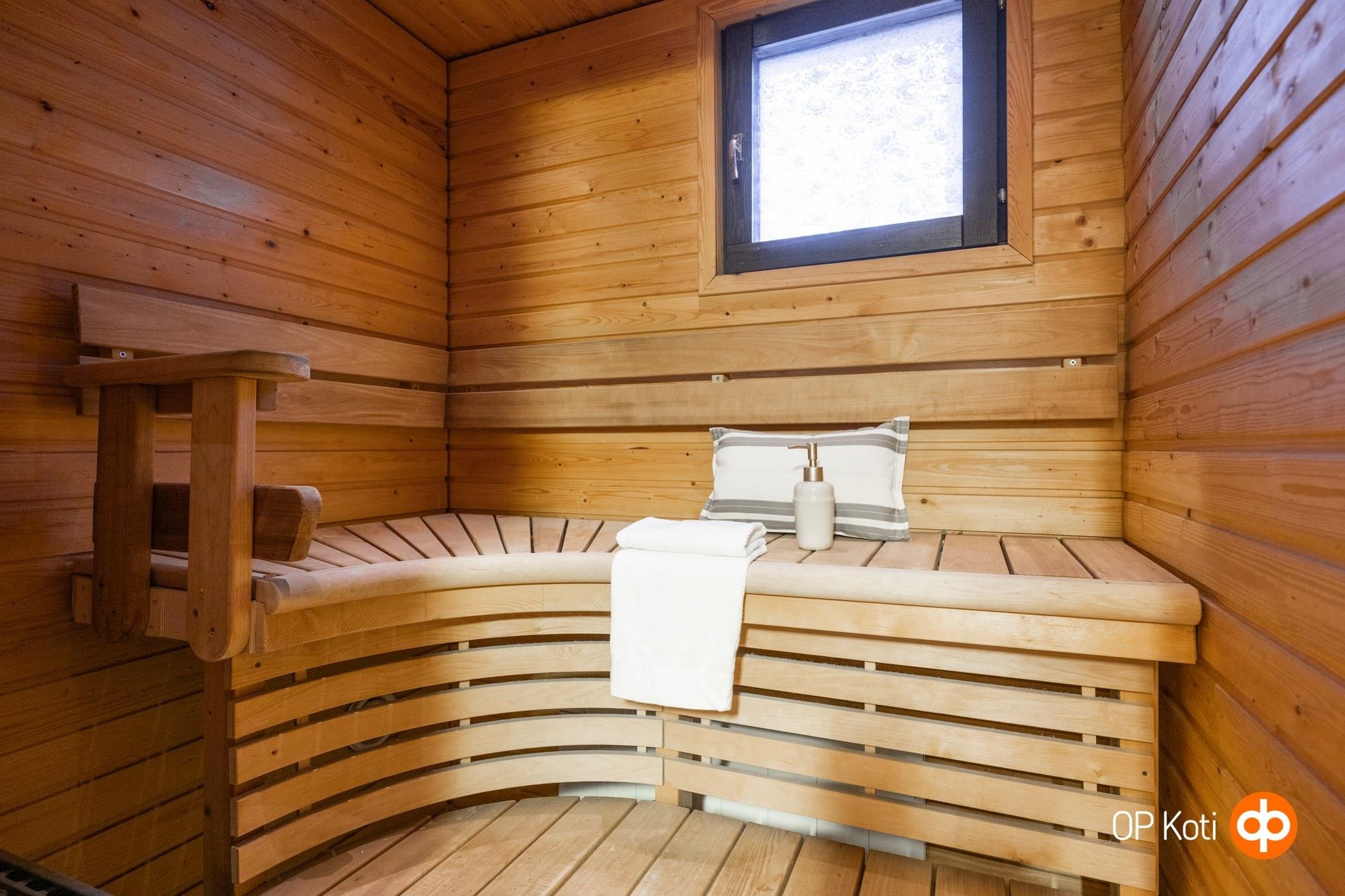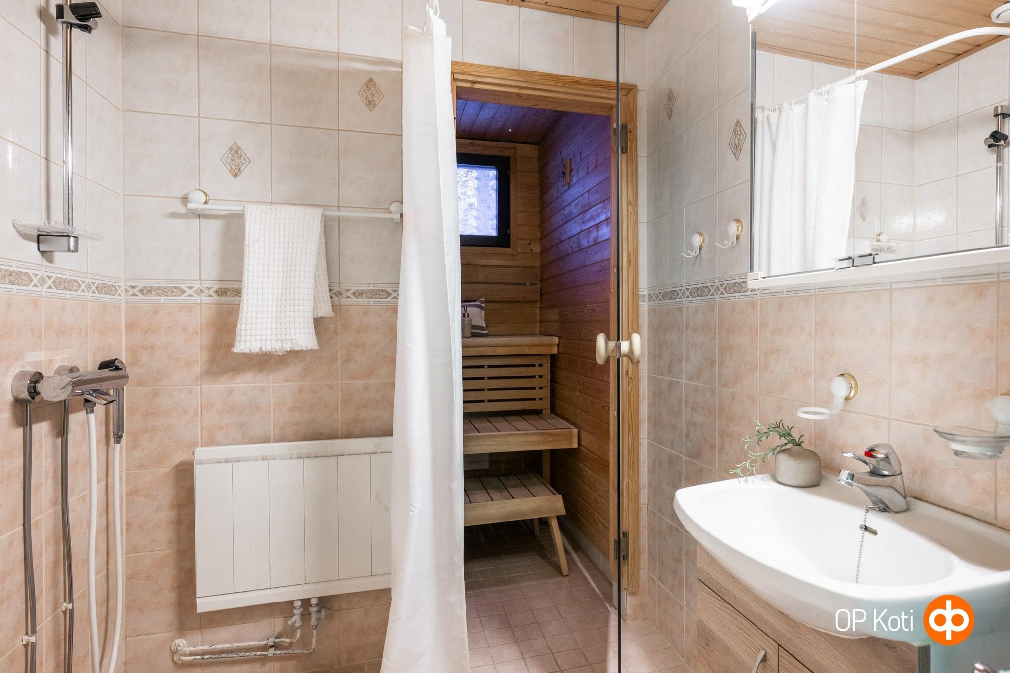 - Sauna, sähkökiuas, kylpyhuone, suihku, peilikaappi, allaskaappi, pesukoneliitäntä, lattialämmitys, kiinteät valaisimet.