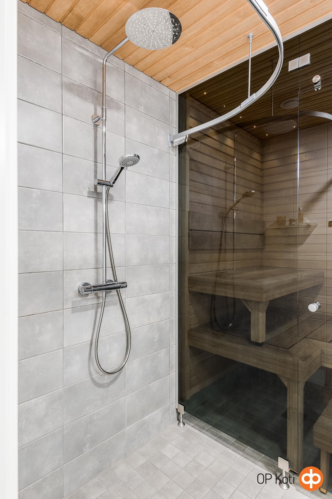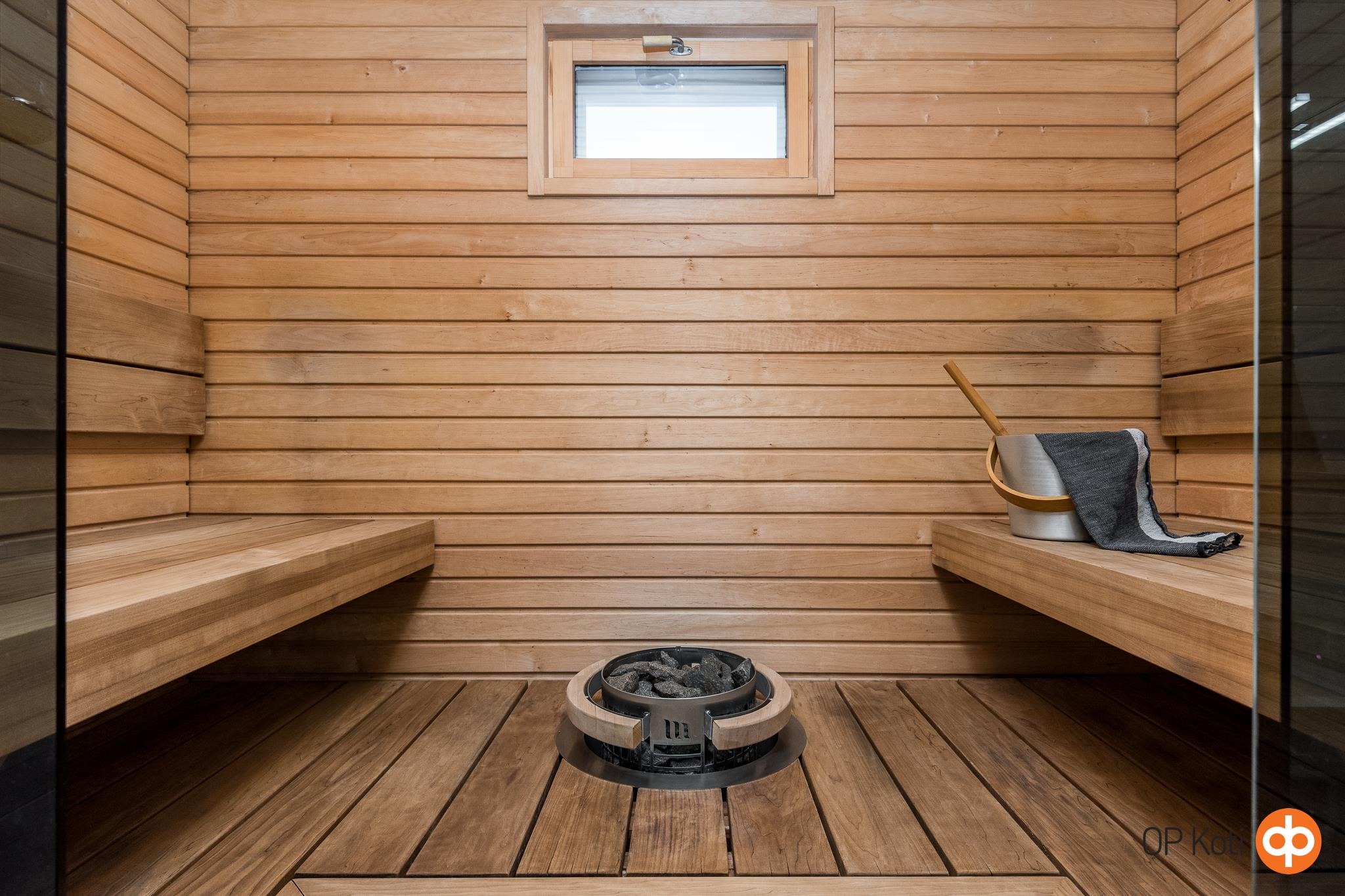 - Sauna Lämpöhaapa, sähkökiuas, kylpyhuone, erillinen wc, suihku, peilit, kaapit, allaskaappi, pesukoneliitäntä, lattialämmitys, kiinteät valaisimet.