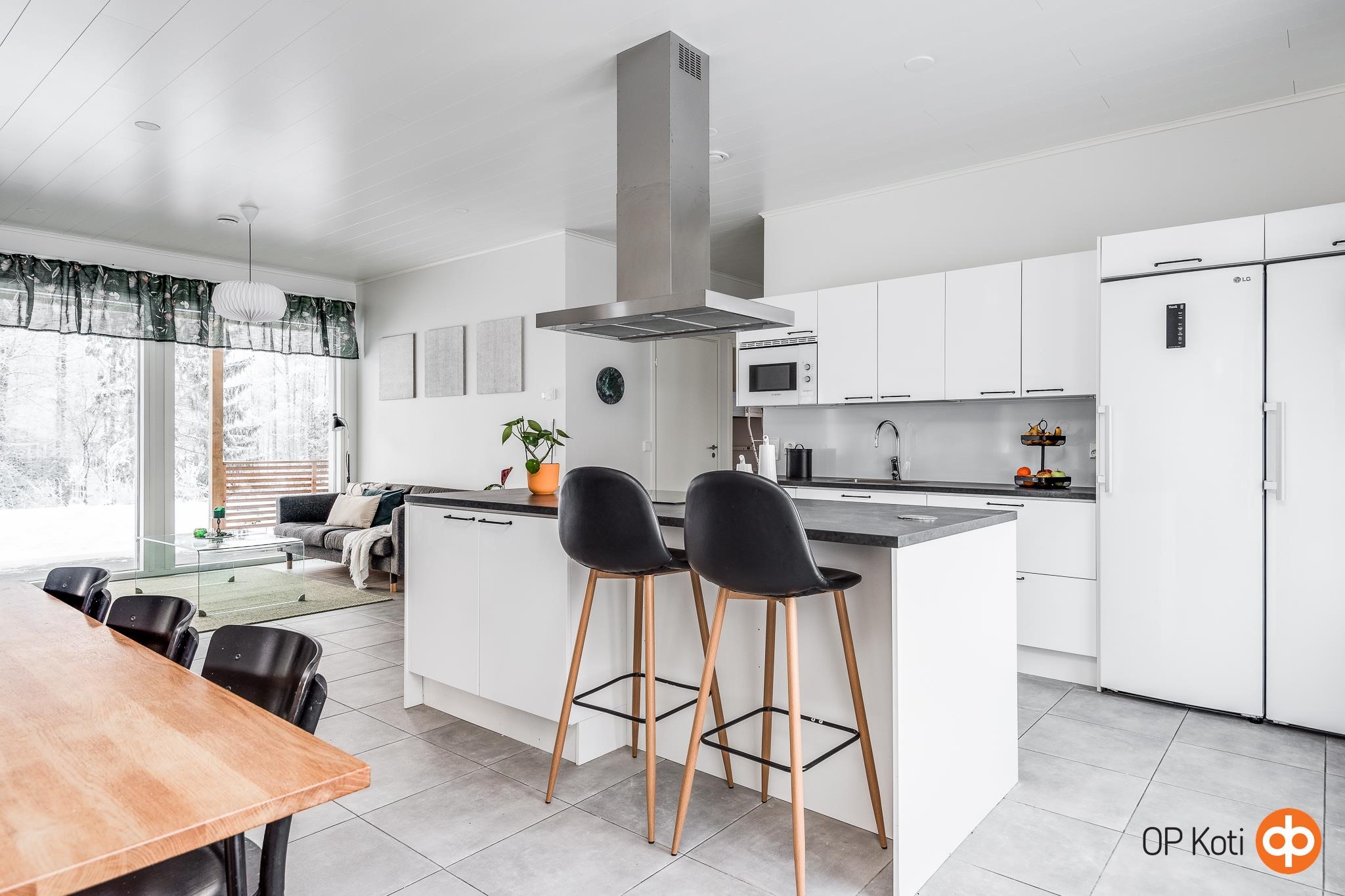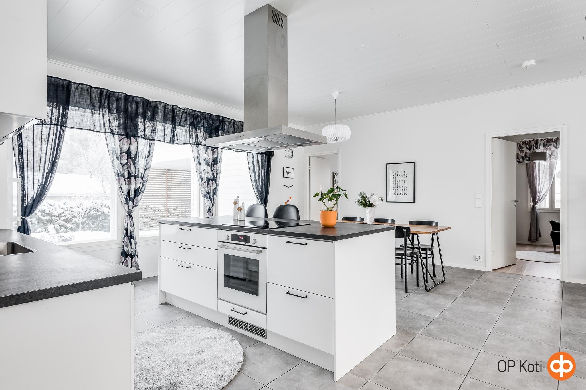 Keittiön varustelu vastaa vaativankin kokin tarpeisiin. Saareke tuo lisää laskutilaa ja rajaa muokavasti keittiön ja ruokailutilan. Ruokailutilaan mahtuu suurempikin pöytä. Tilavasta ja valoisasta olohuoneesta on näkymät takapihalle ja tontti rajoittuu metsäiseen puistoalueeseen. Isot ikkunat tuovat valoa ja avaruutta koko tilaan.