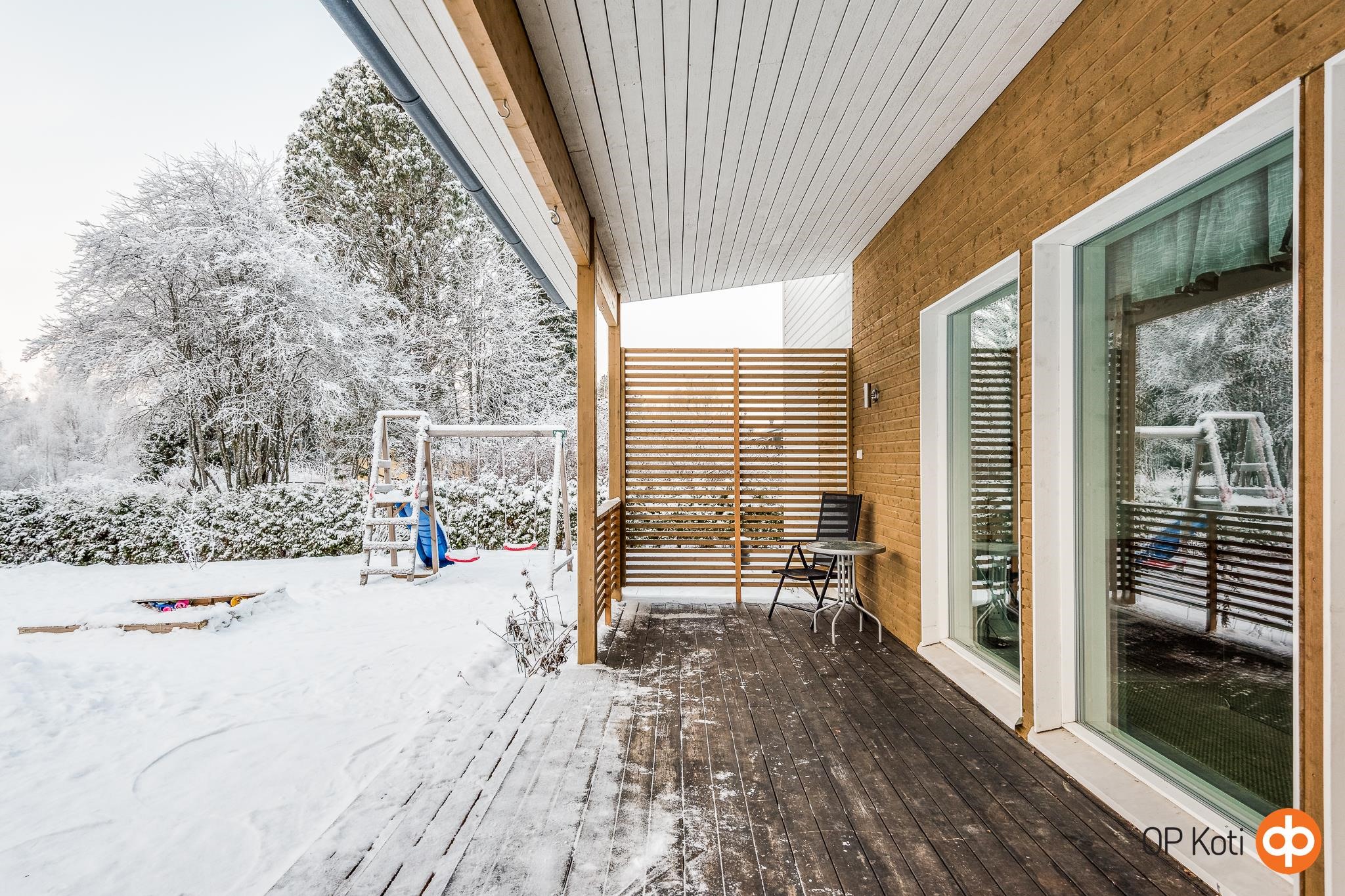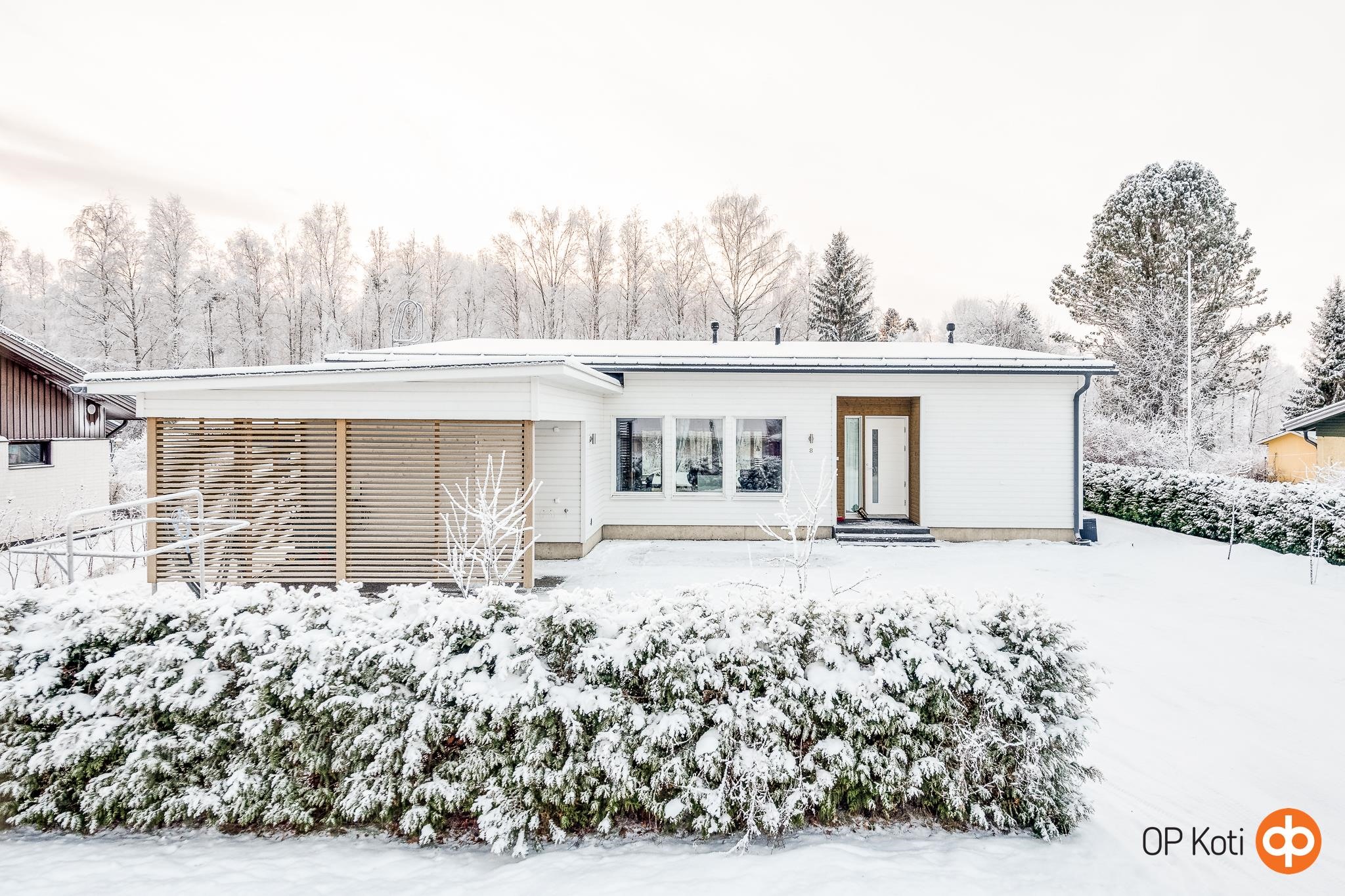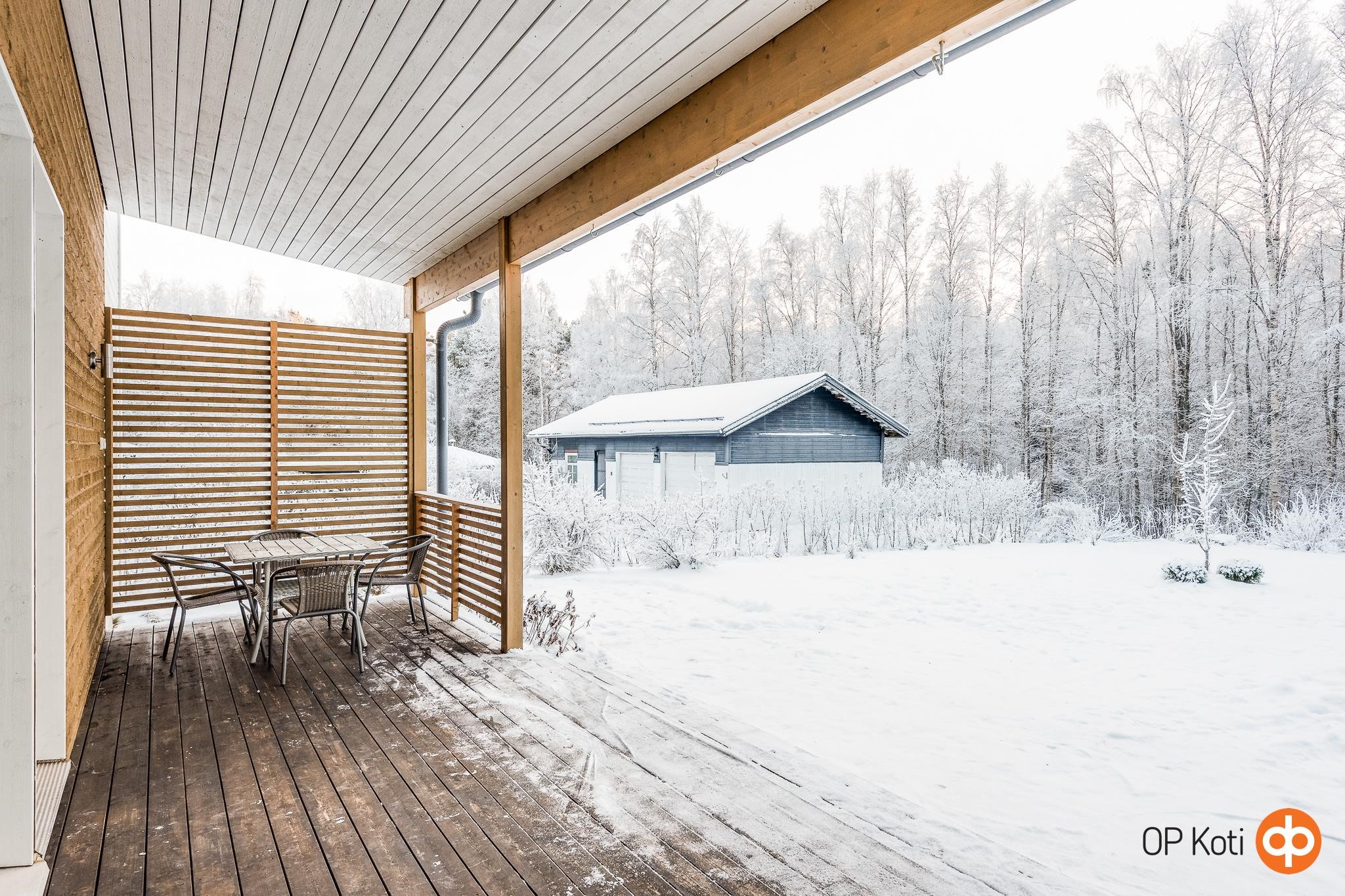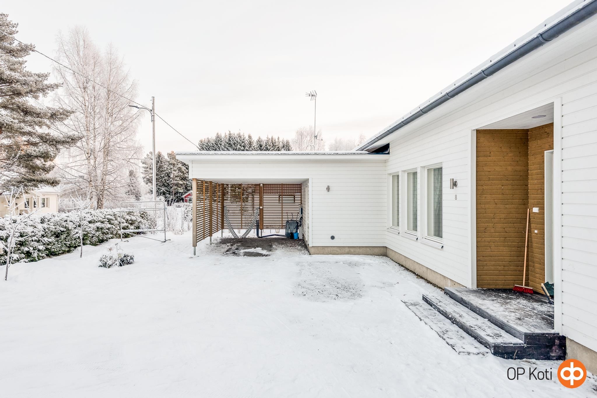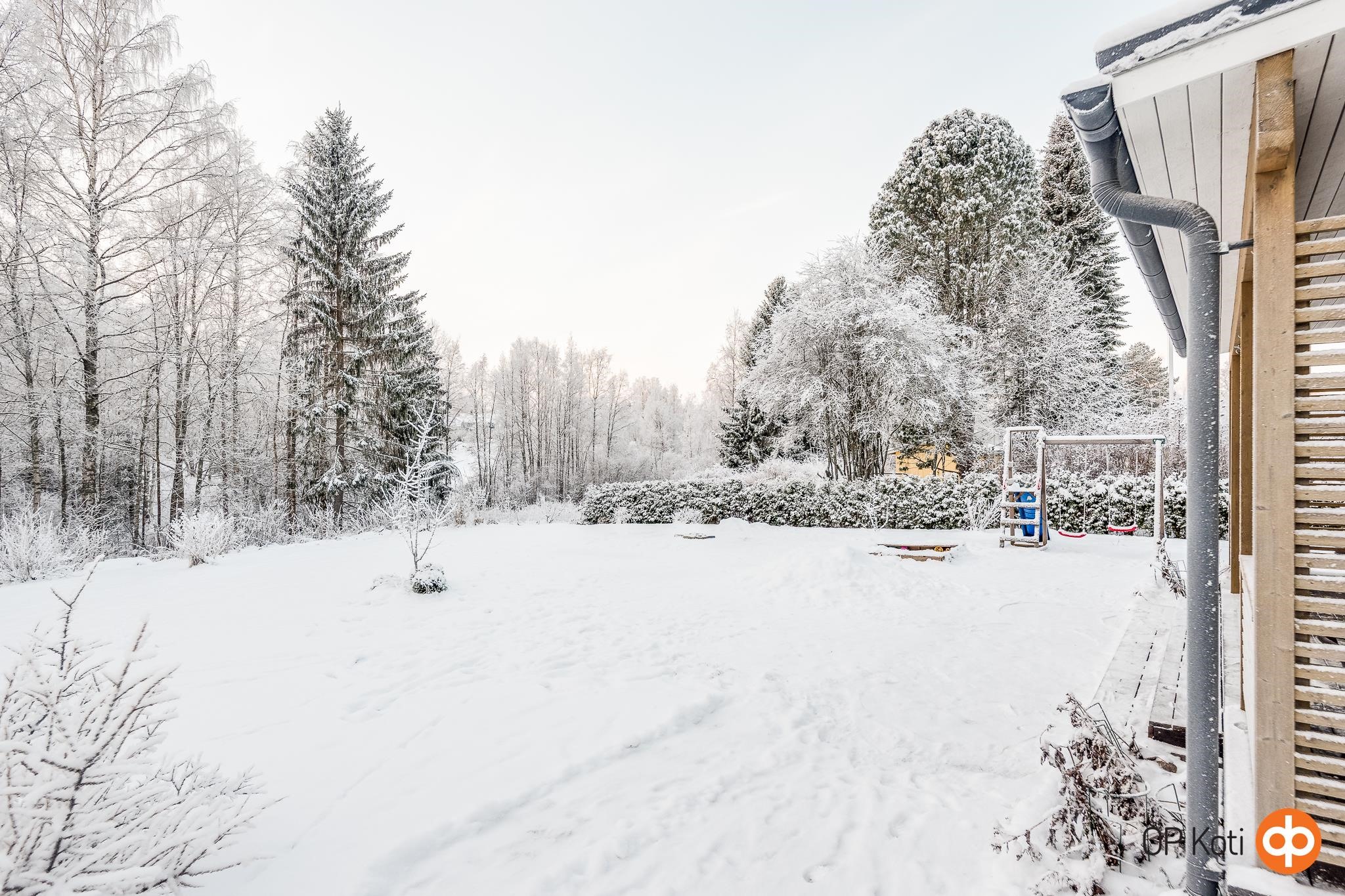 Oma 1 026 m² tontti rajautuu puistoon, tarjoten vehreän ympäristön ja viihtyisän leikkipaikan lapsille. Tilava lämmin varasto autokatoksen yhteydessä tuo lisätilaa harrastusvälineille tai muille säilytystarpeille.