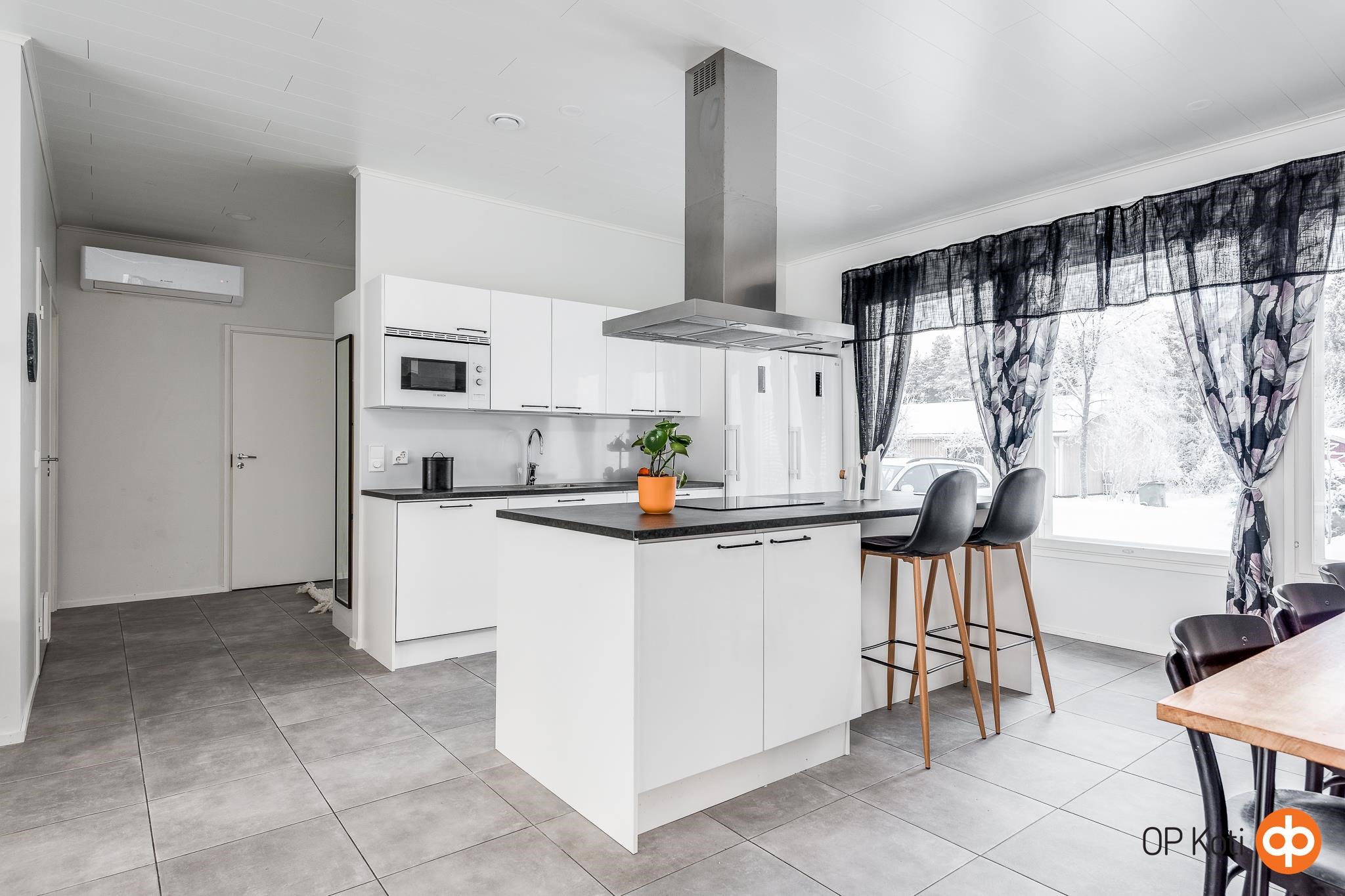 - Jääkaappi, pakastekaappi, induktioliesi, liesituuletin, mikroaaltouuni, astianpesukone, kaapistot, kiinteät valaisimet, pöytätasojen materiaali laminaattitasot.